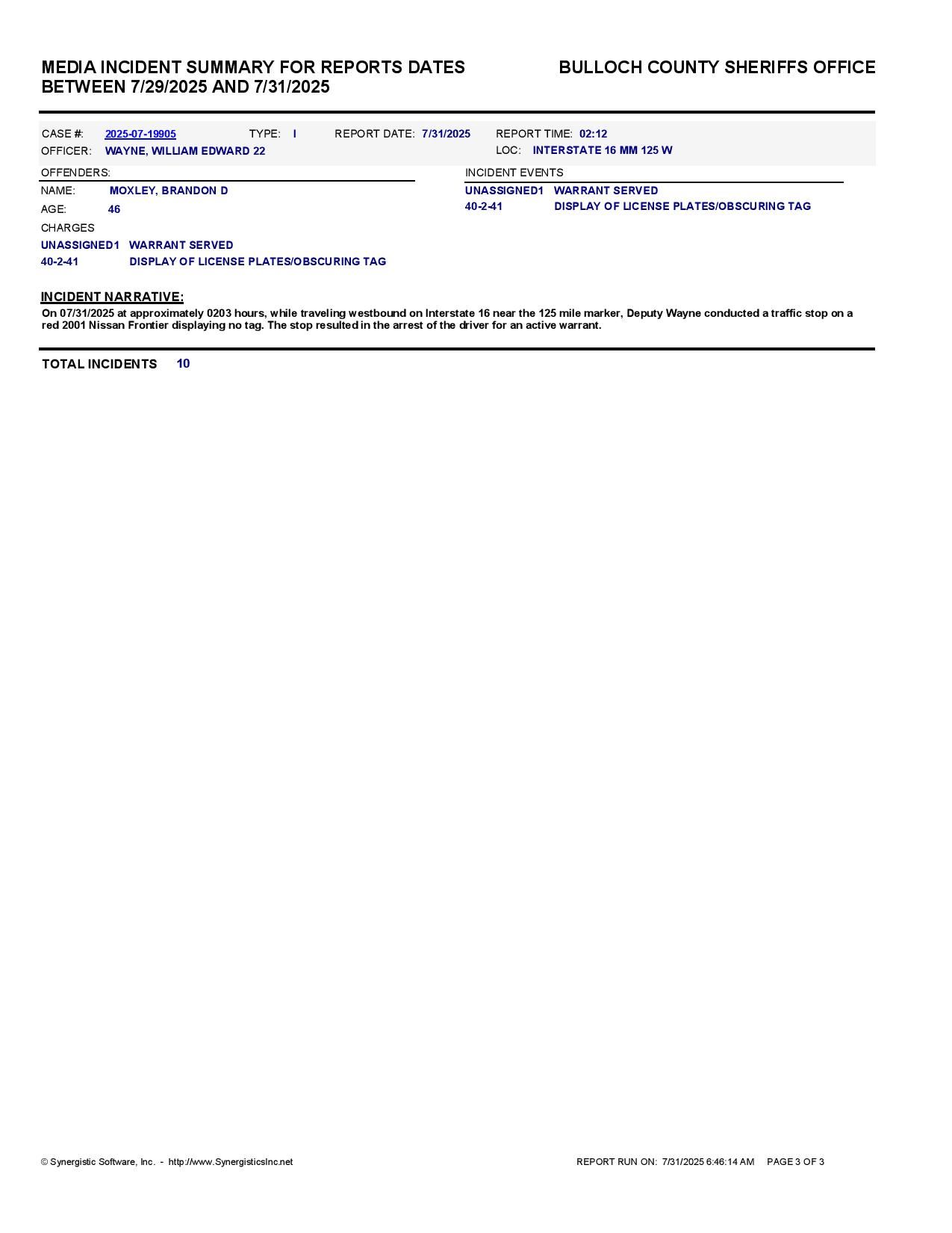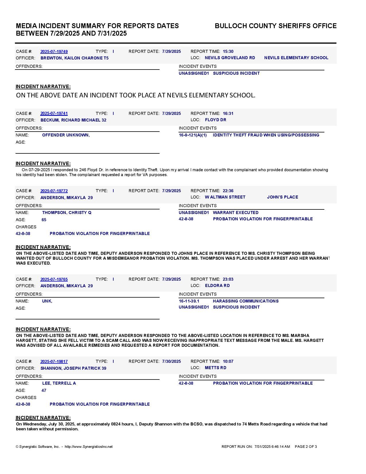 Bulloch Co. Jail Booking & Incident Report – 07/31/25