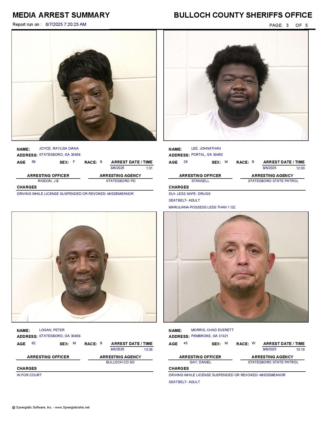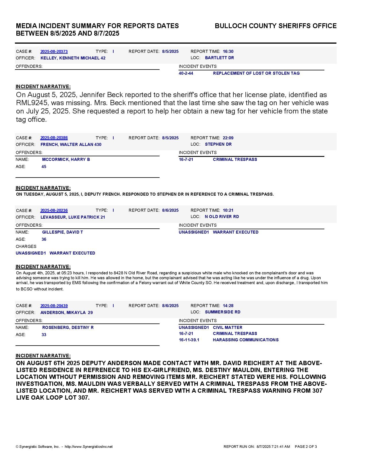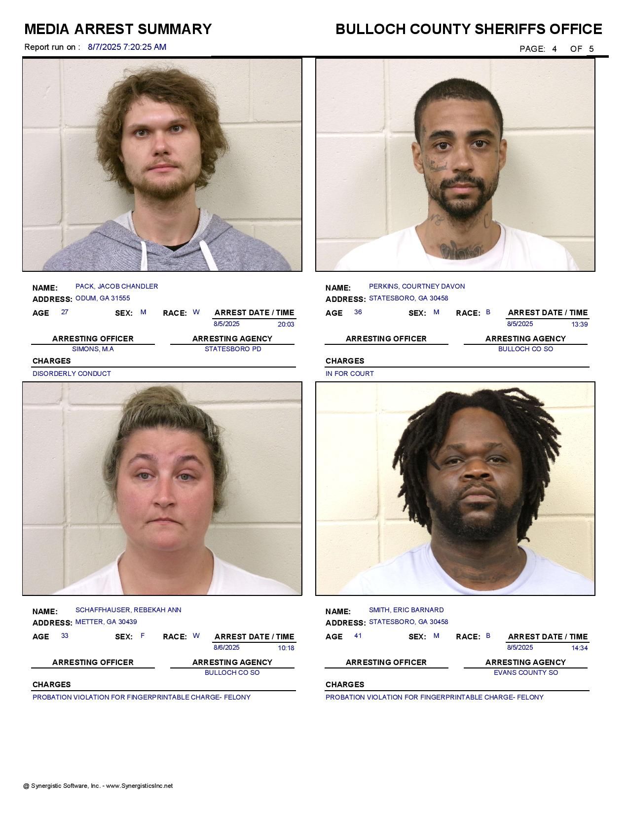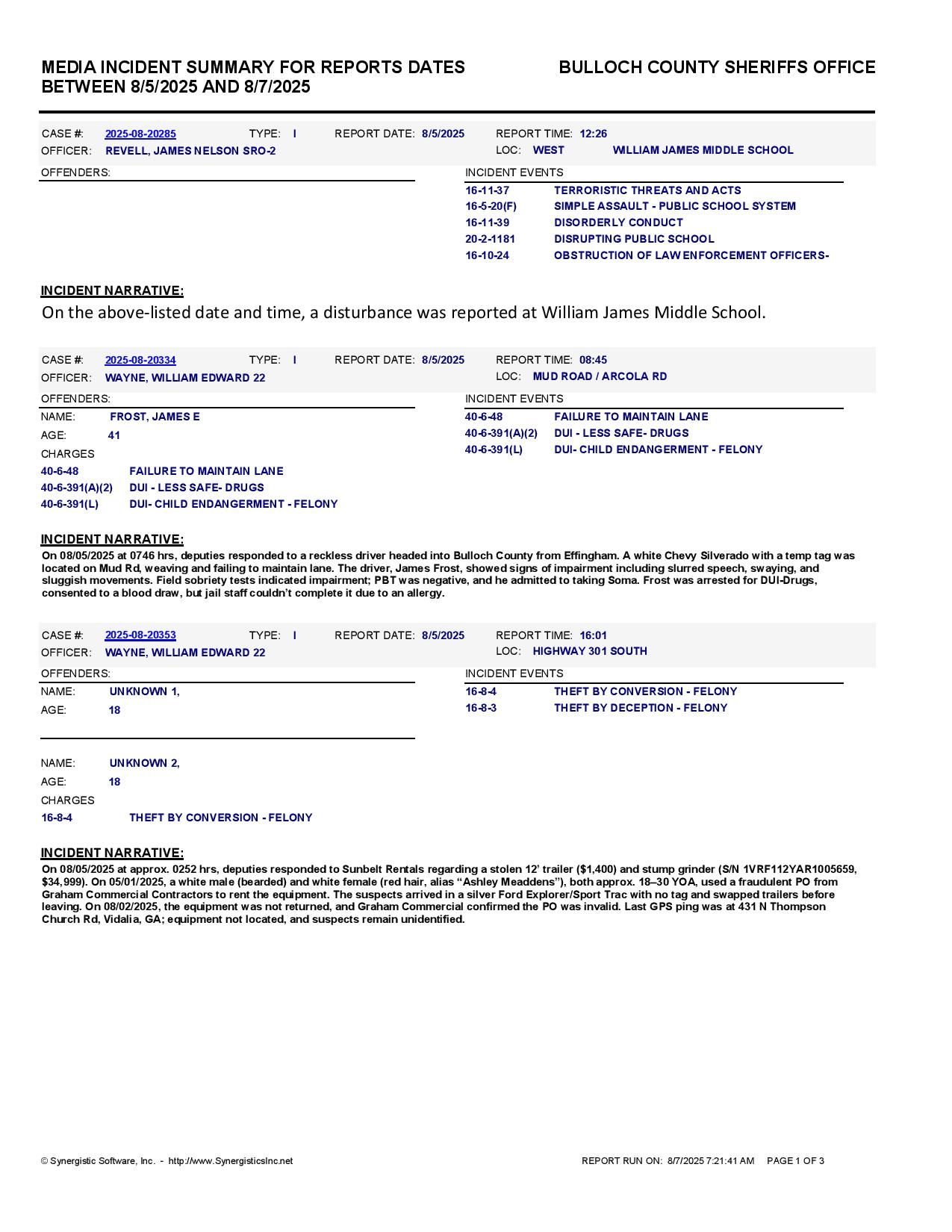The Bulloch Co Jail Booking & Incident Report 08/07/25 details arrests from Bulloch Co., Statesboro, Brooklet, Portal, Register, and the Georgia State Patrol. Incident reports are from the Sheriff’s Office only.