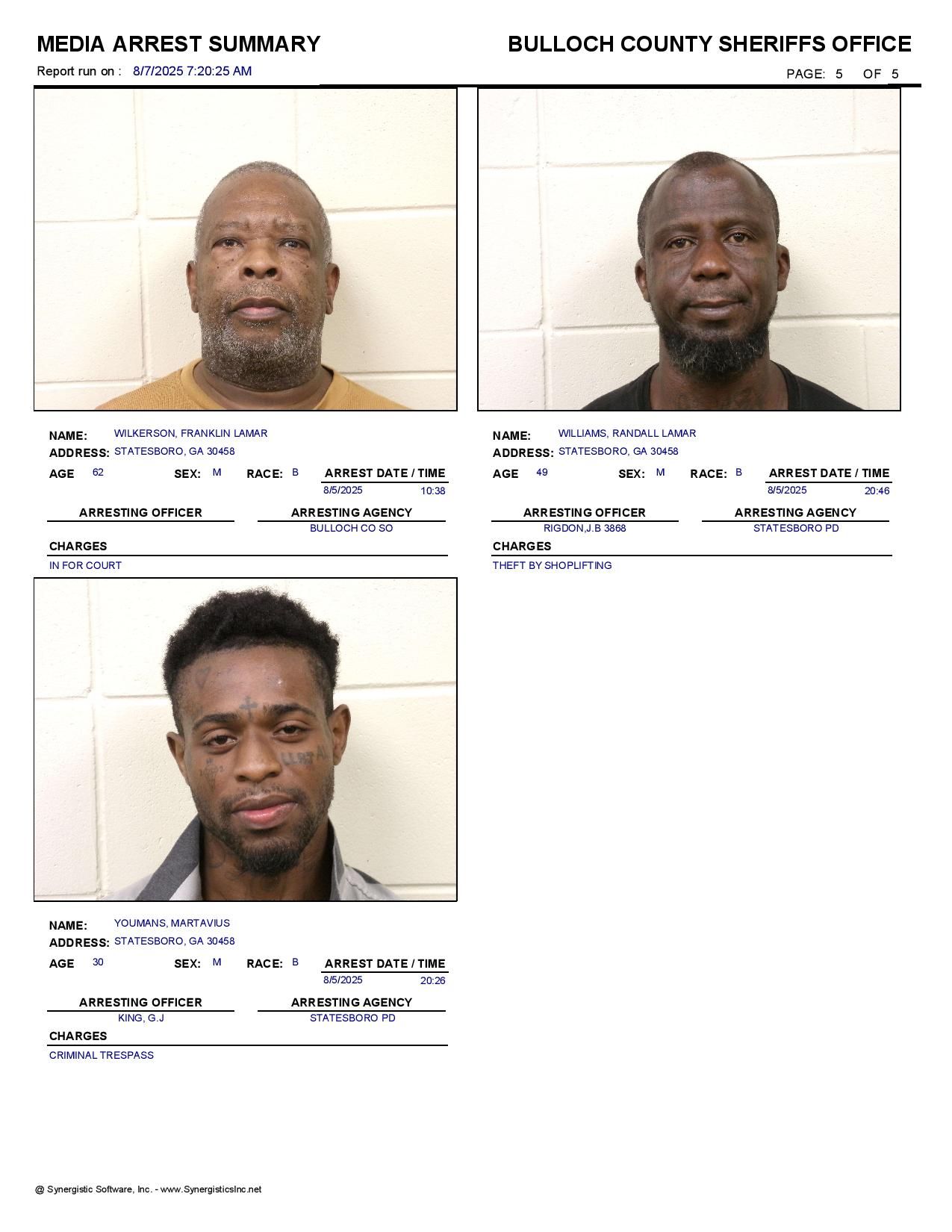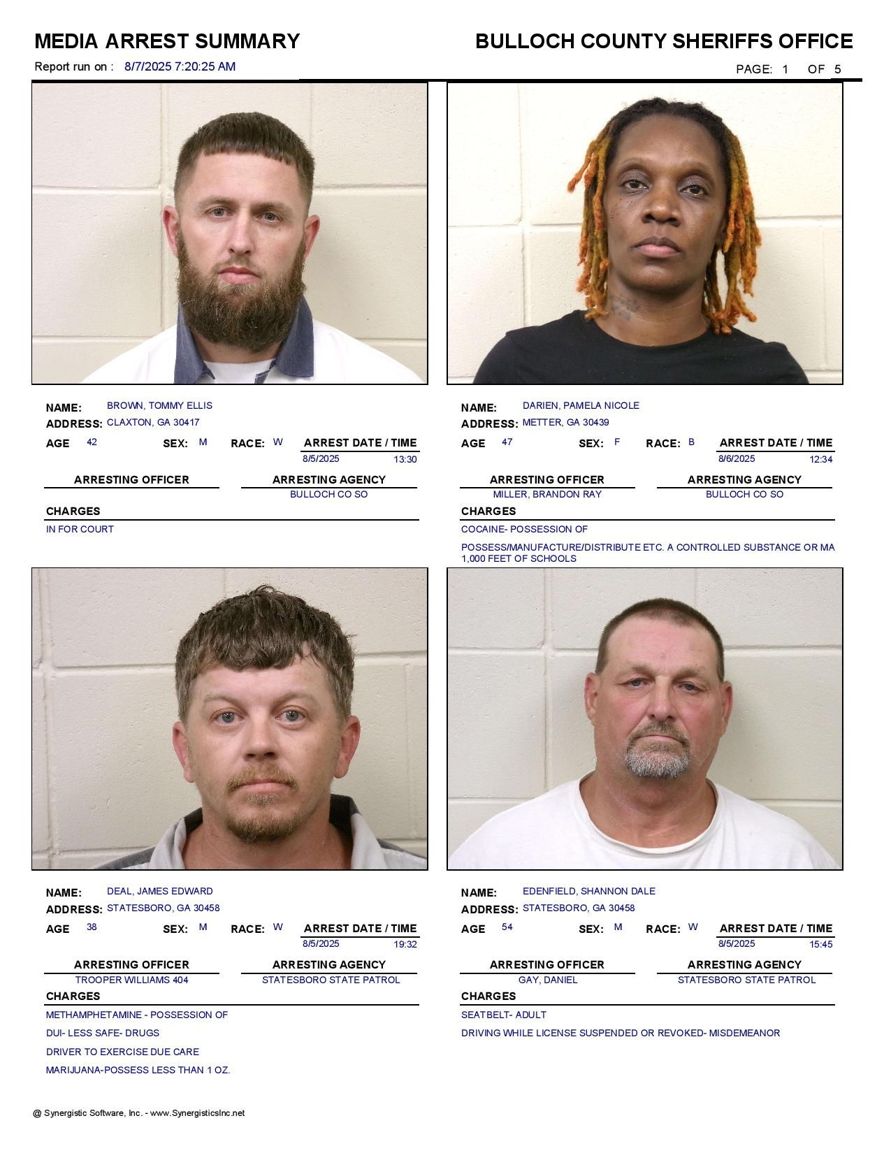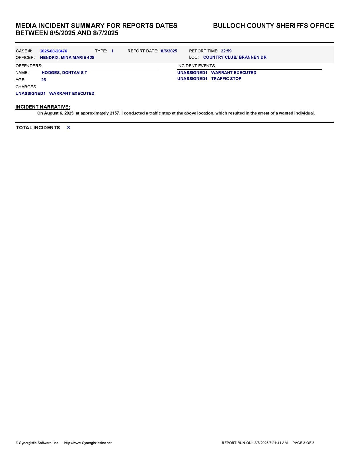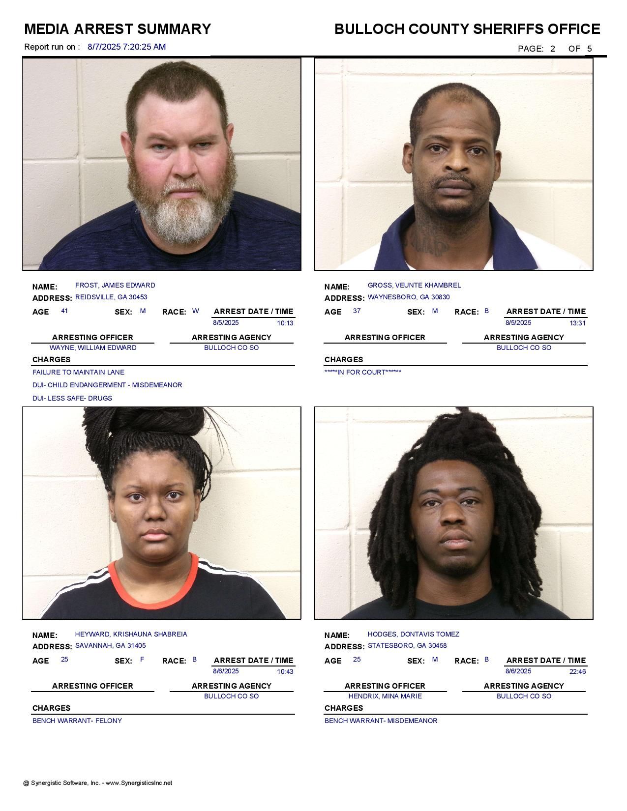 The Bulloch Co Jail Booking & Incident Report 08/07/25 details arrests from Bulloch Co., Statesboro, Brooklet, Portal, Register, and the Georgia State Patrol. Incident reports are from the Sheriff’s Office only.