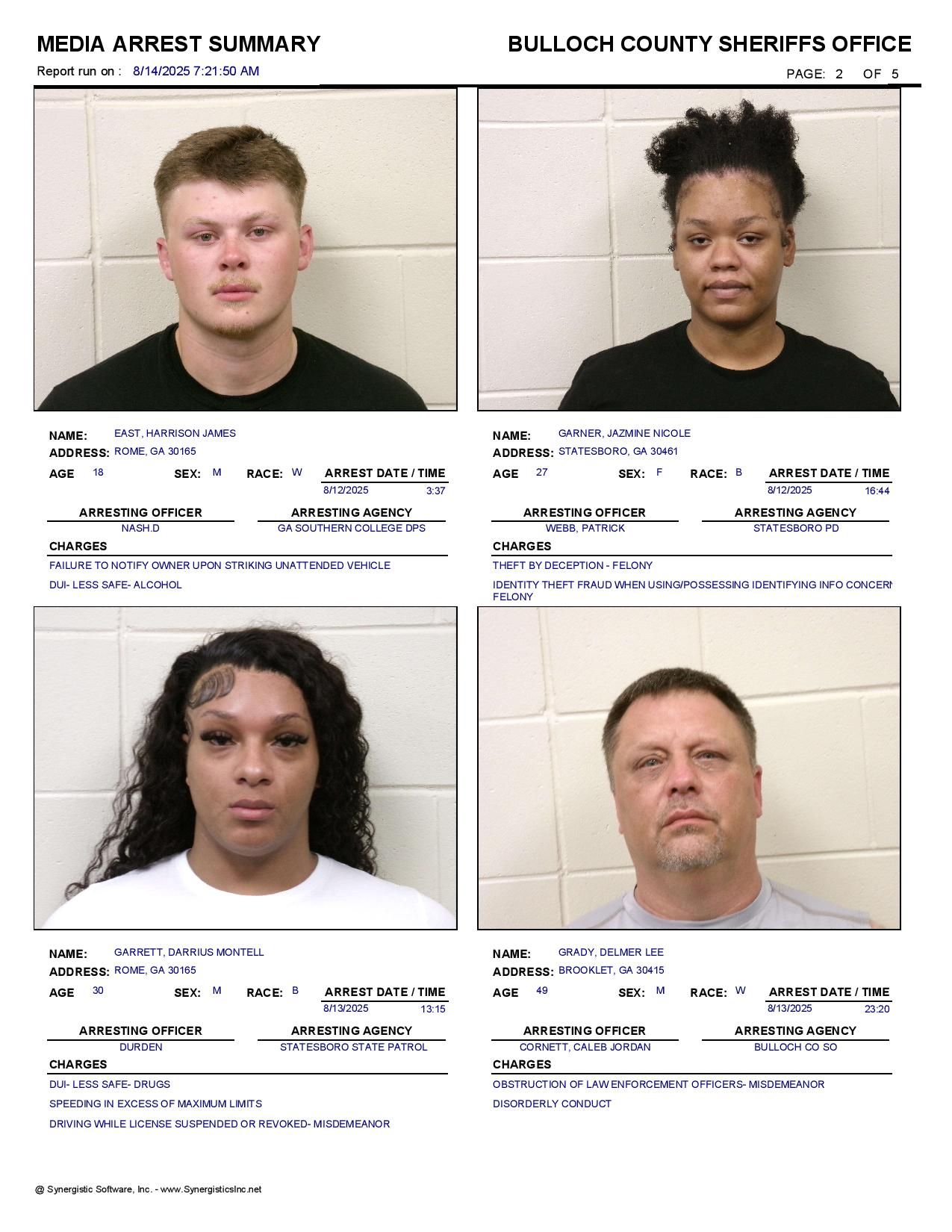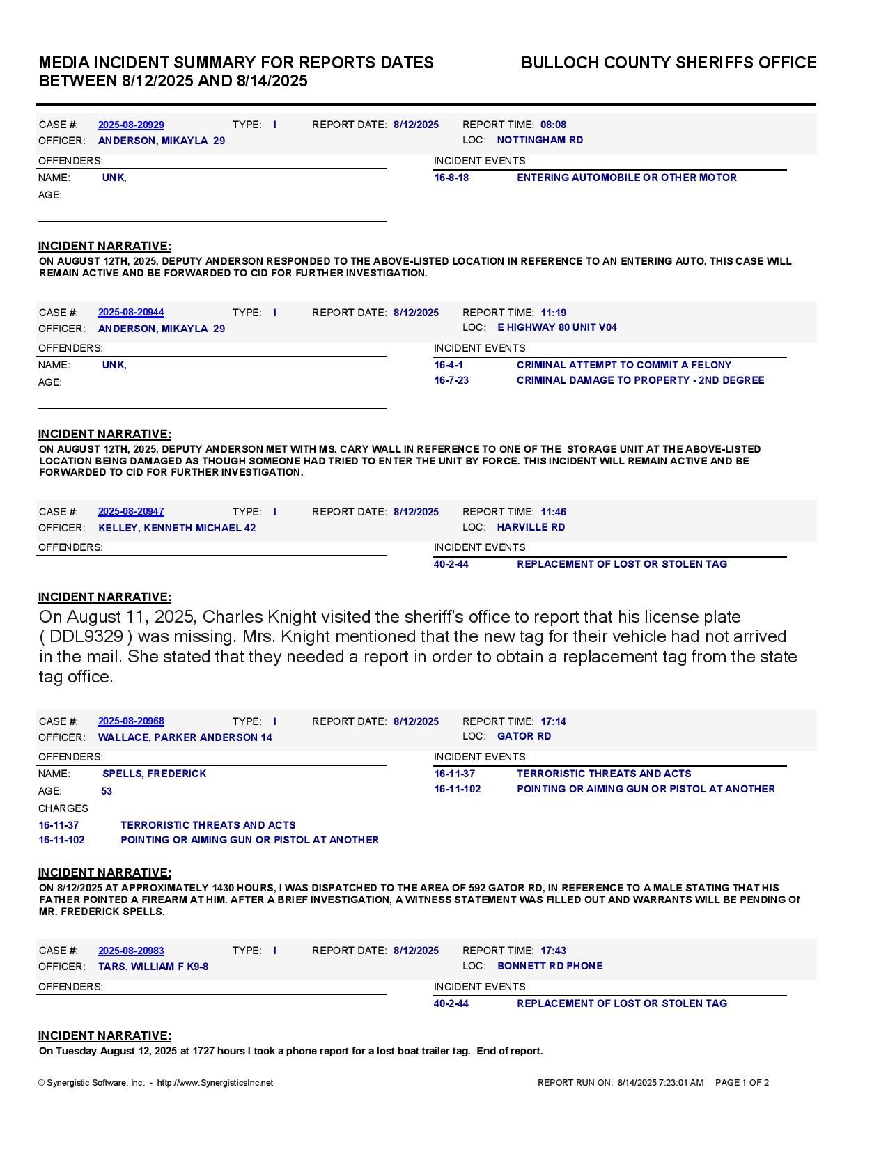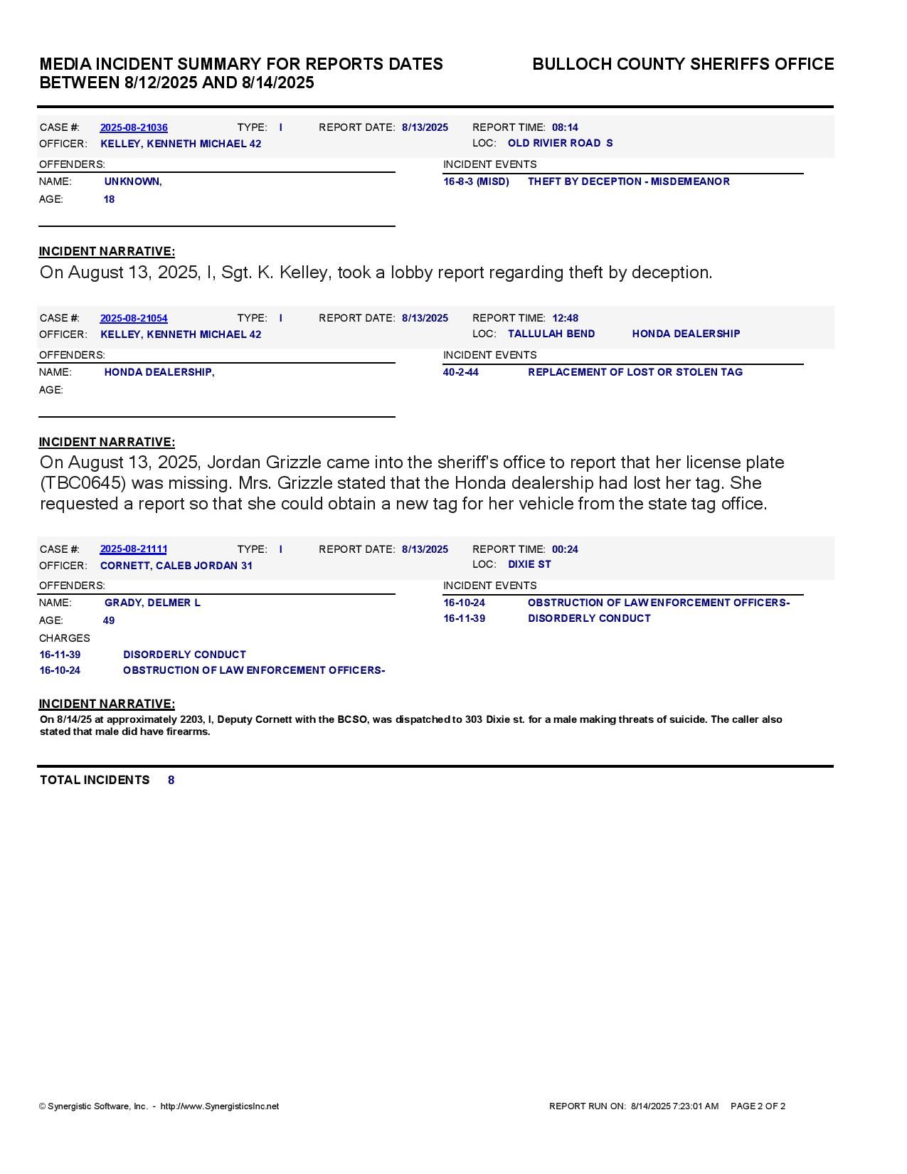 The Bulloch Co Jail Booking & Incident Report 08/14/25 details arrests from Bulloch Co., Statesboro, Brooklet, Portal, Register, and the Georgia State Patrol. Incident reports are from the Sheriff’s Office only.