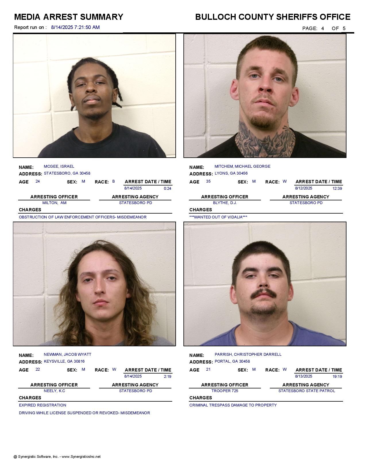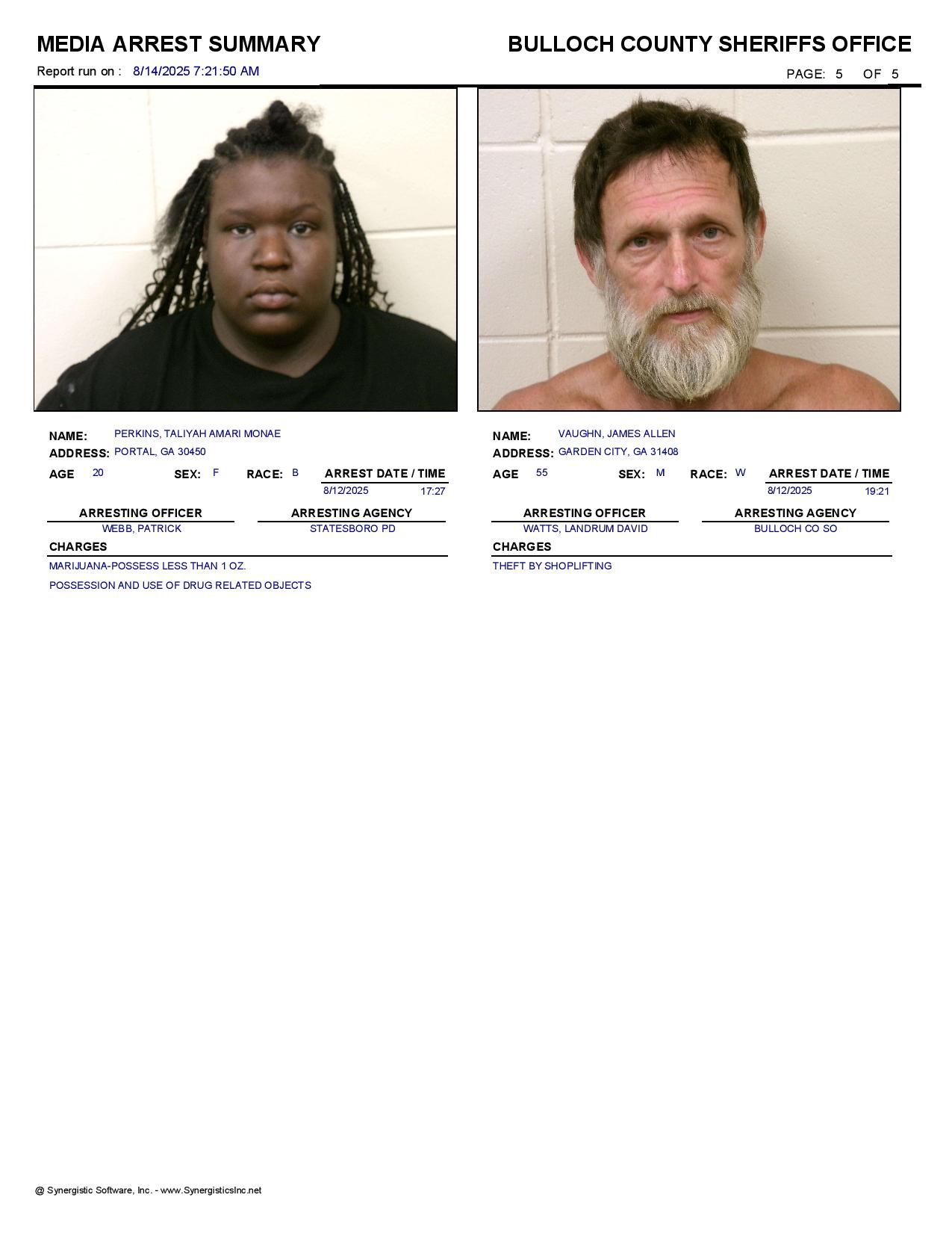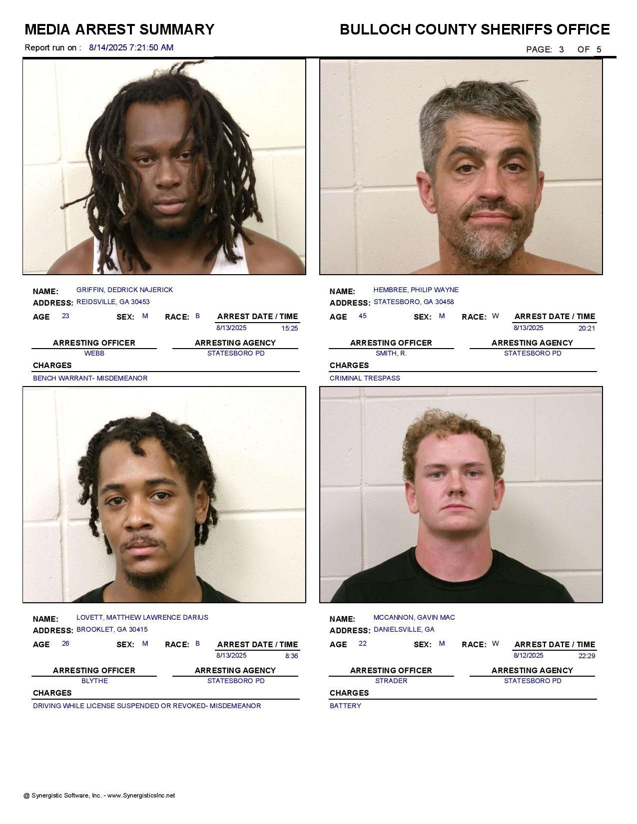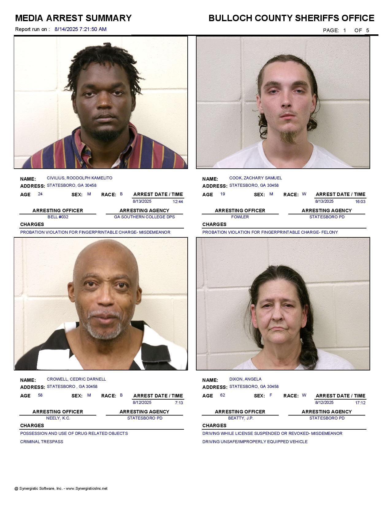 The Bulloch Co Jail Booking & Incident Report 08/14/25 details arrests from Bulloch Co., Statesboro, Brooklet, Portal, Register, and the Georgia State Patrol. Incident reports are from the Sheriff’s Office only.