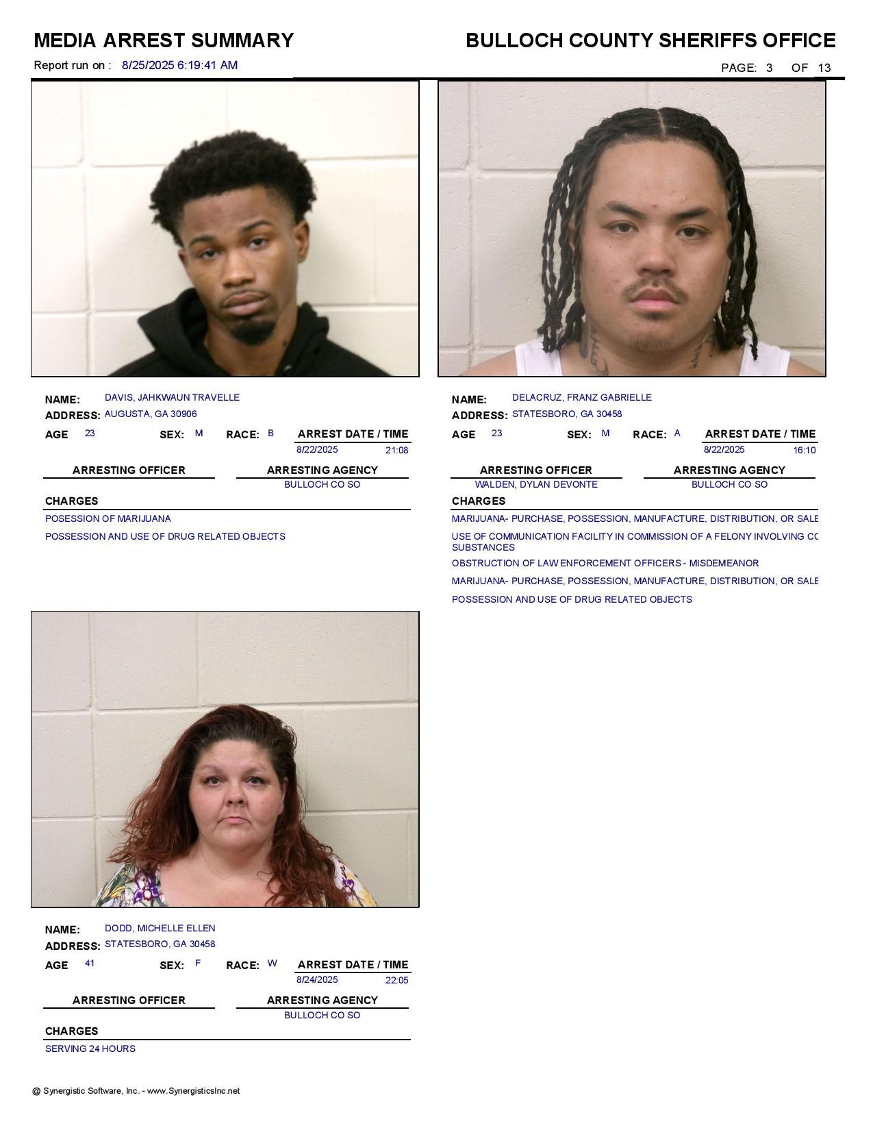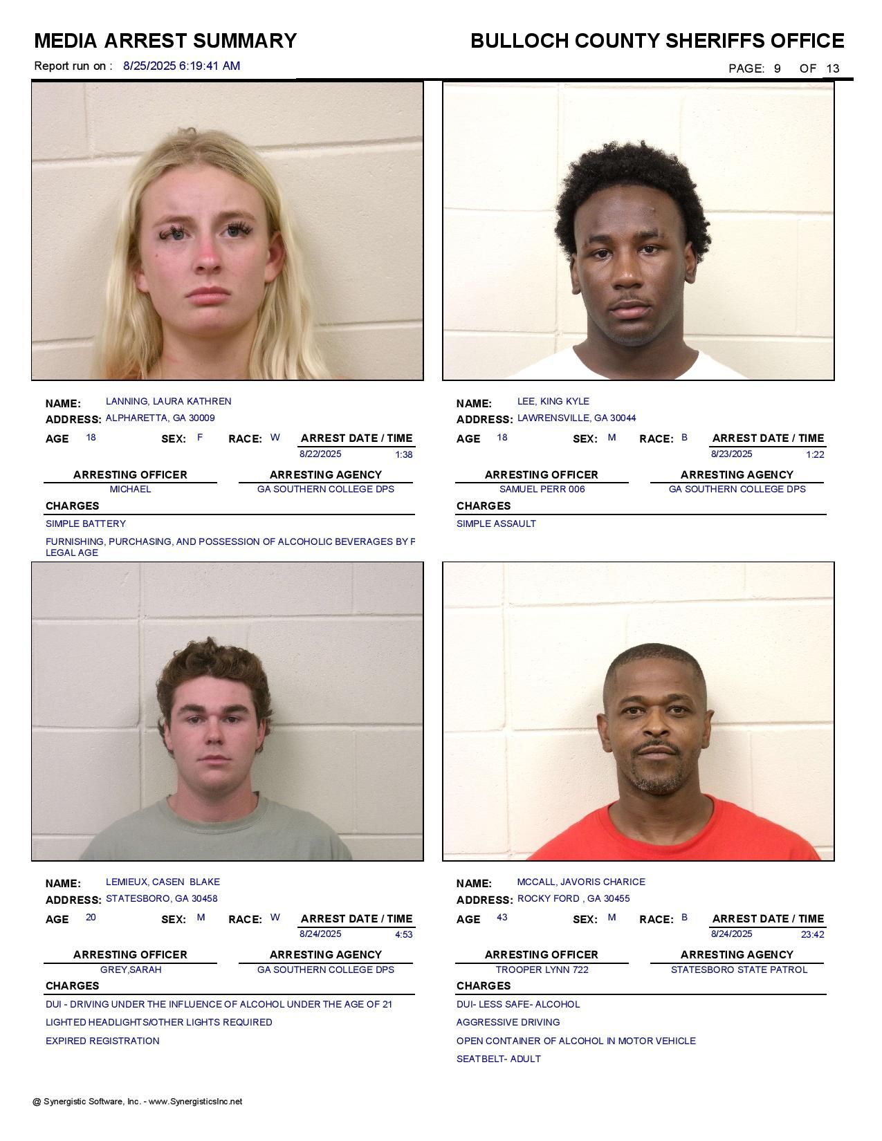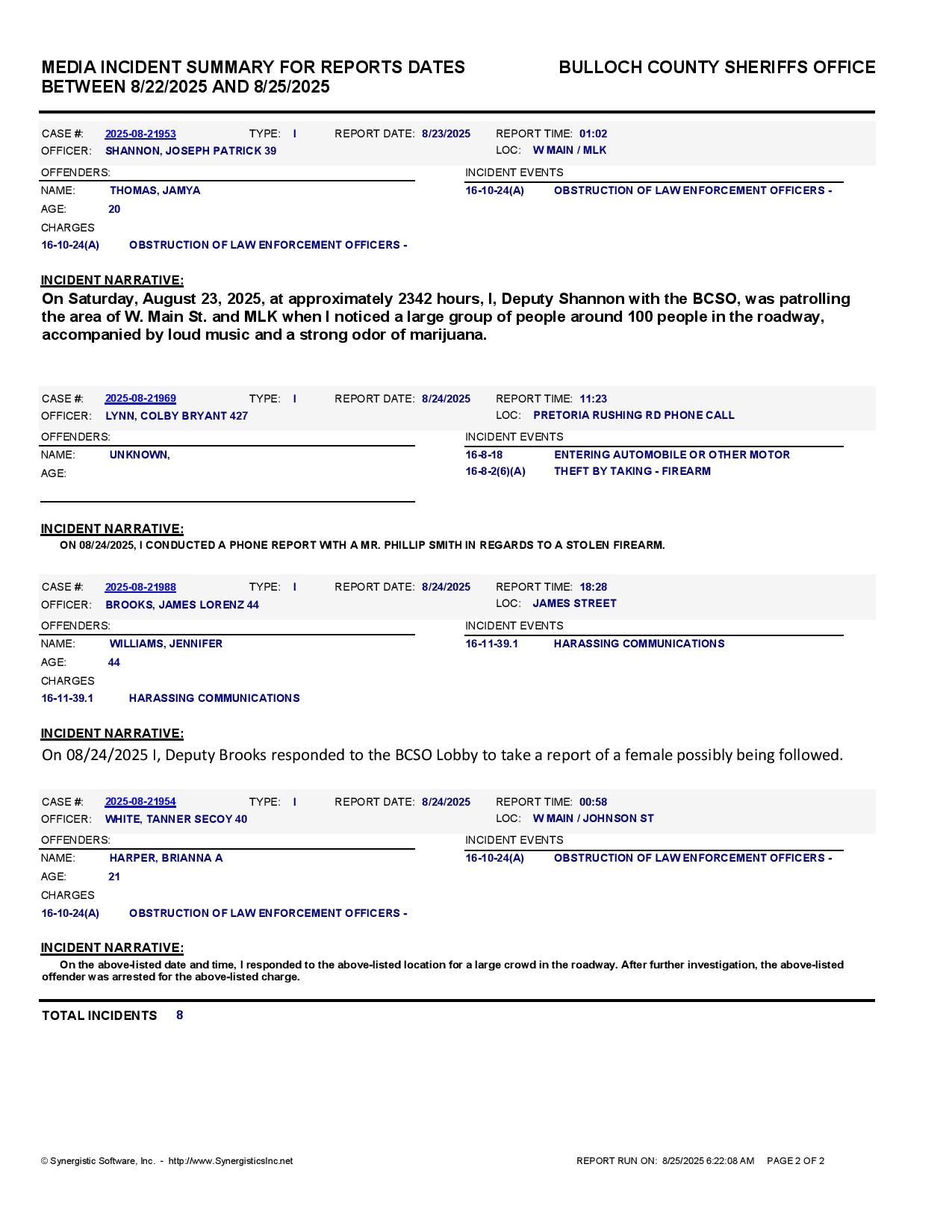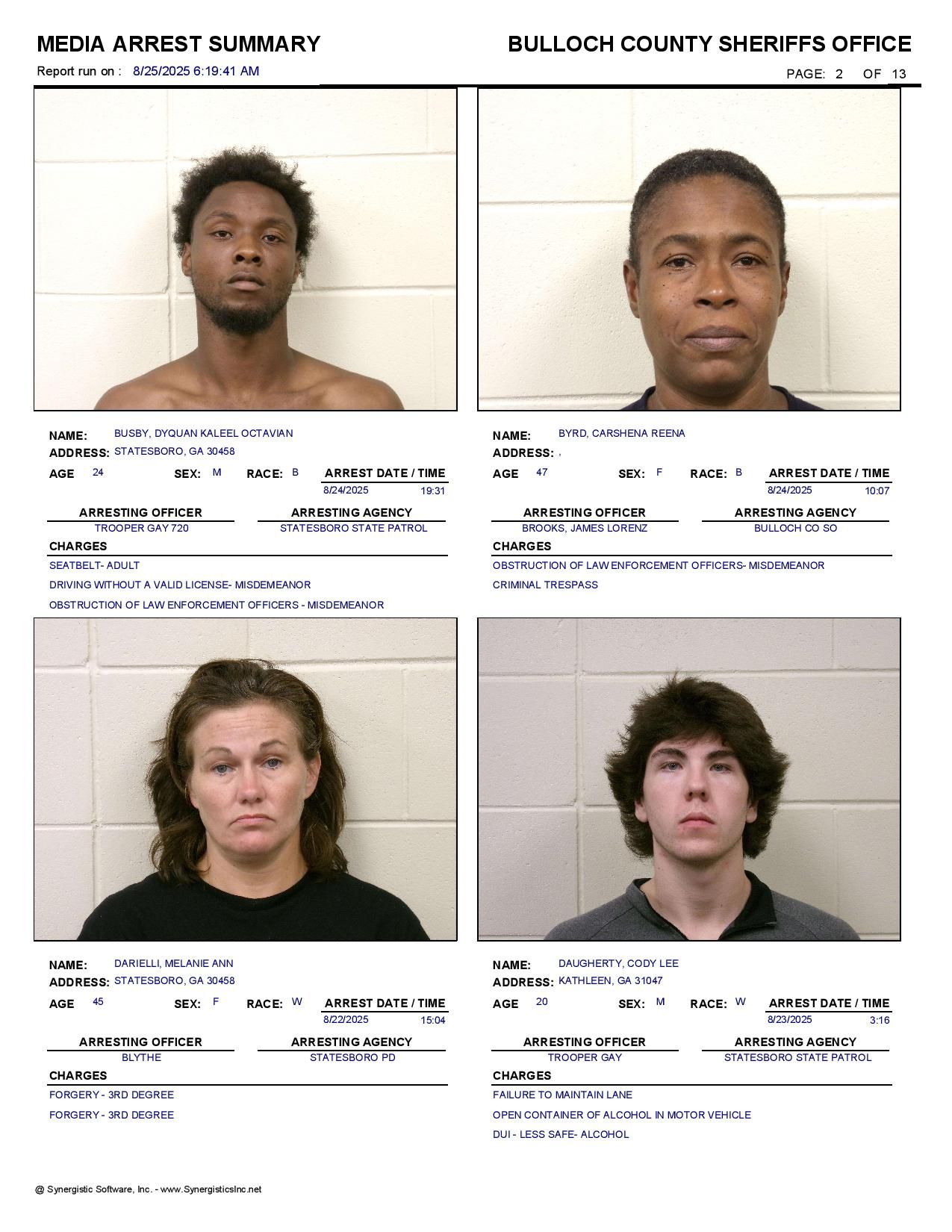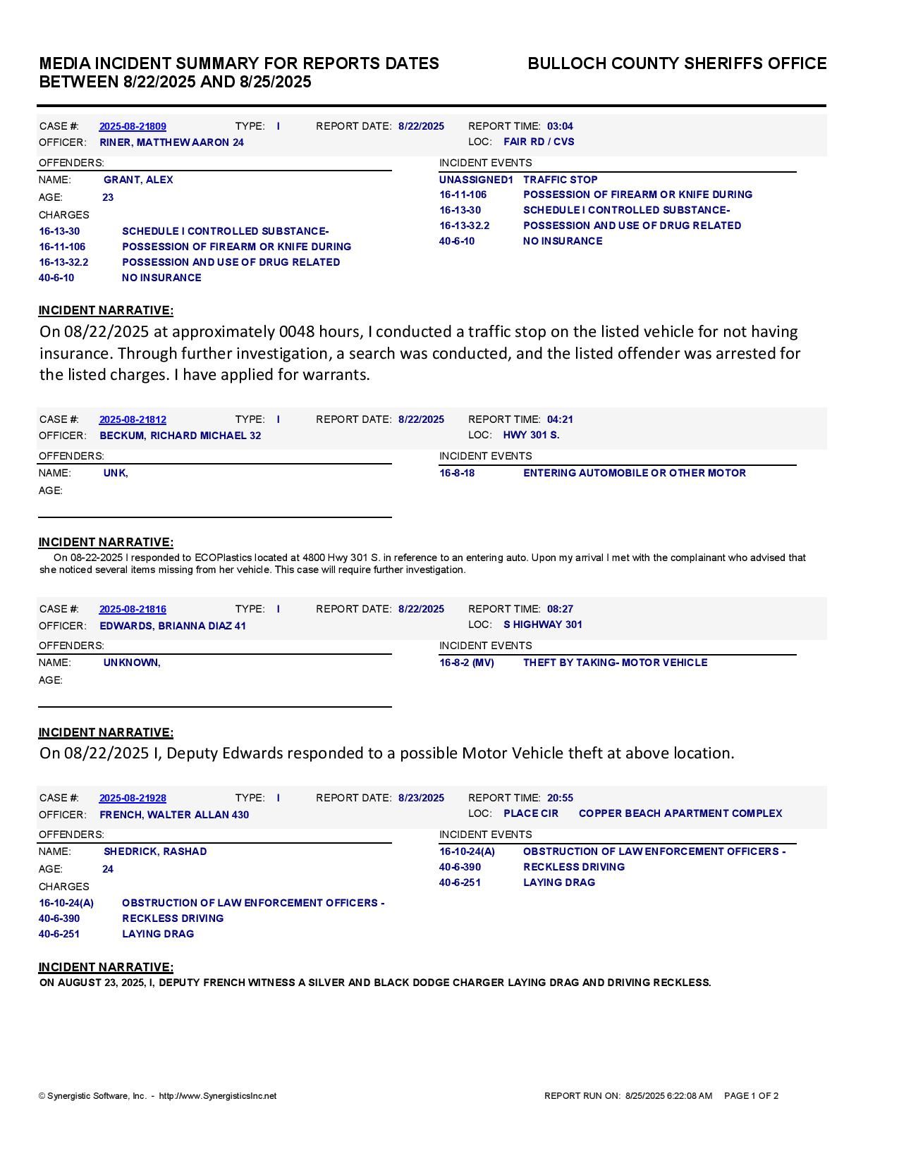 The Bulloch Co Jail Booking & Incident Report 08/25/25 details arrests from Bulloch Co., Statesboro, Brooklet, Portal, Register, and the Georgia State Patrol. Incident reports are from the Sheriff’s Office only.