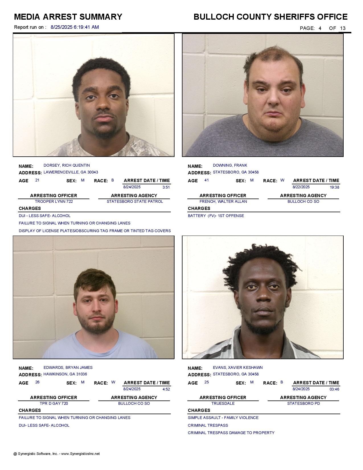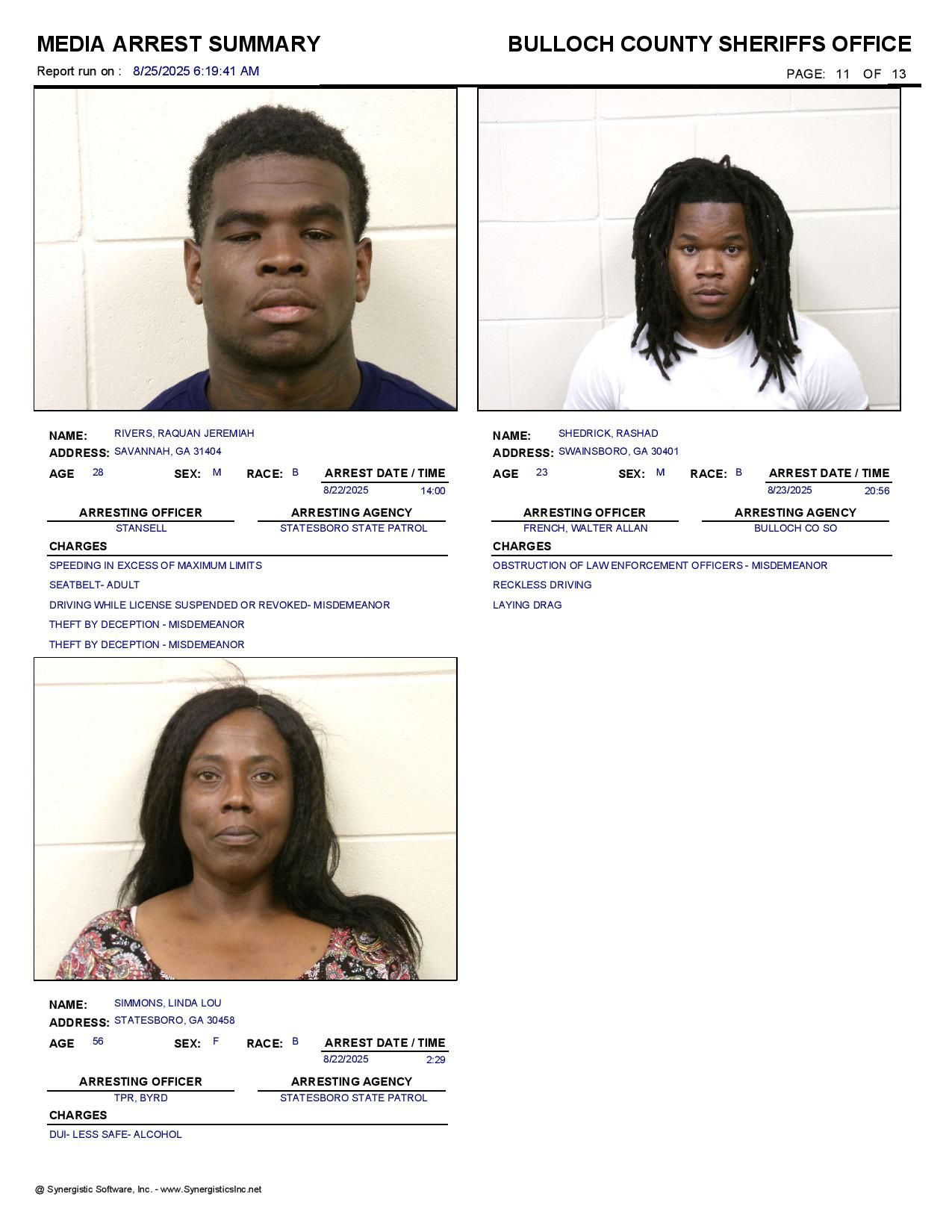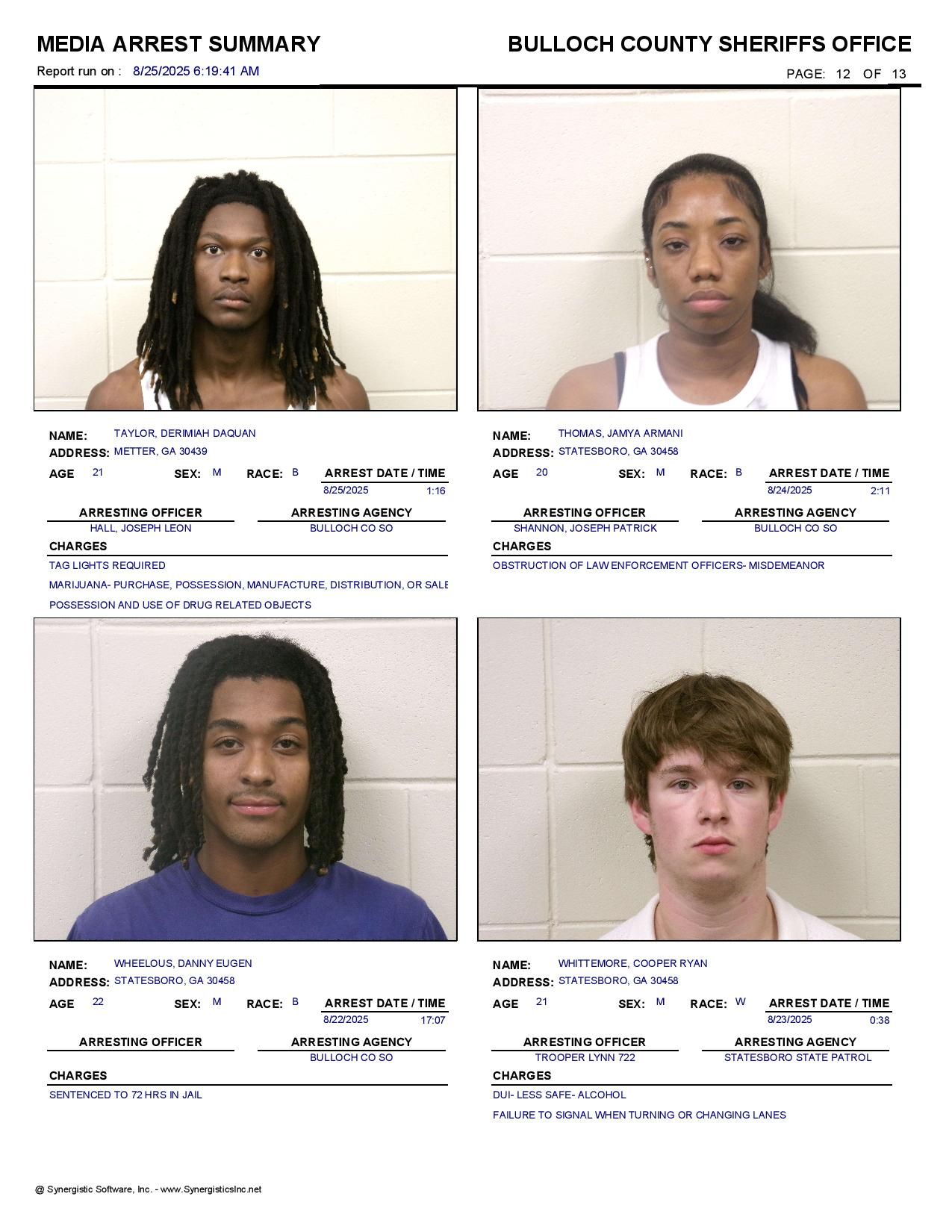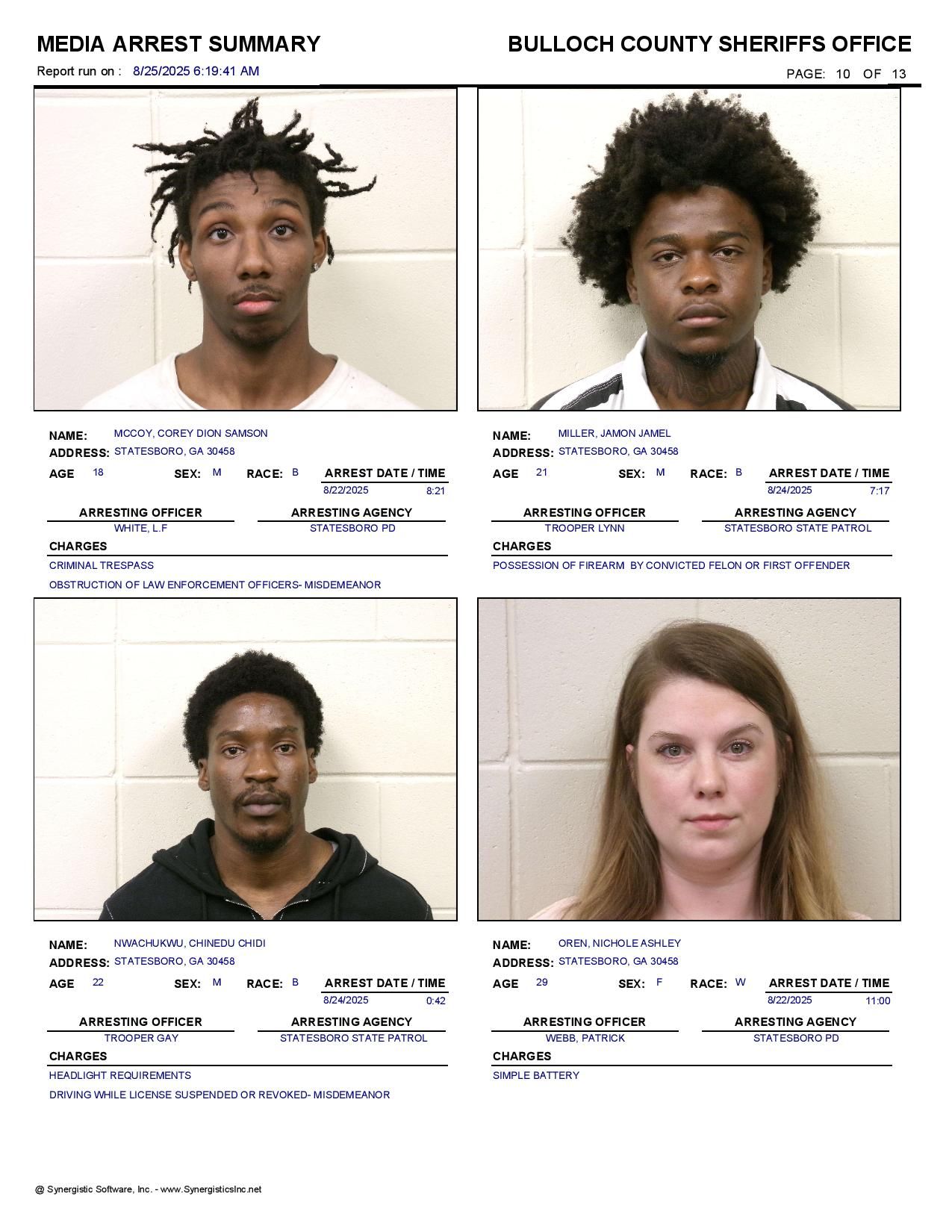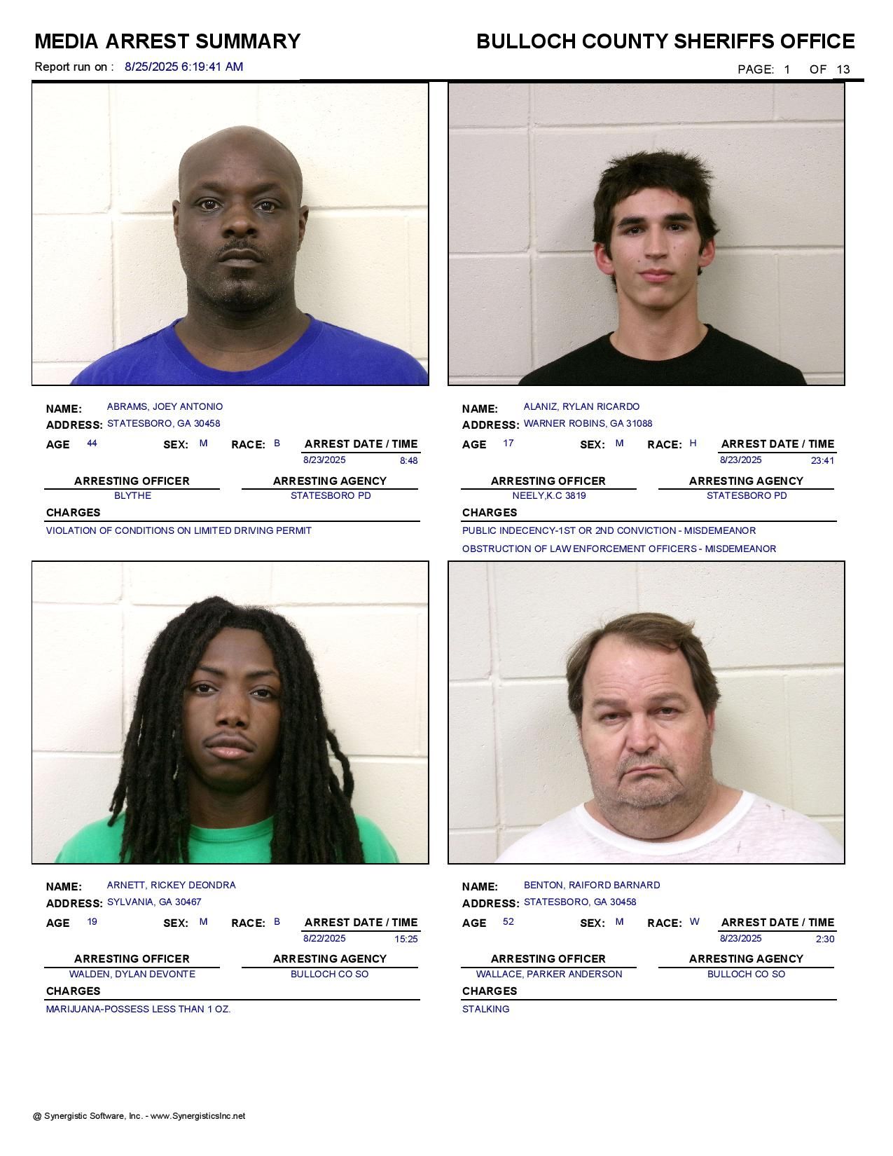 The Bulloch Co Jail Booking & Incident Report 08/25/25 details arrests from Bulloch Co., Statesboro, Brooklet, Portal, Register, and the Georgia State Patrol. Incident reports are from the Sheriff’s Office only.