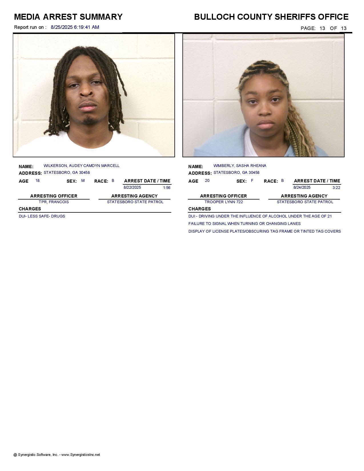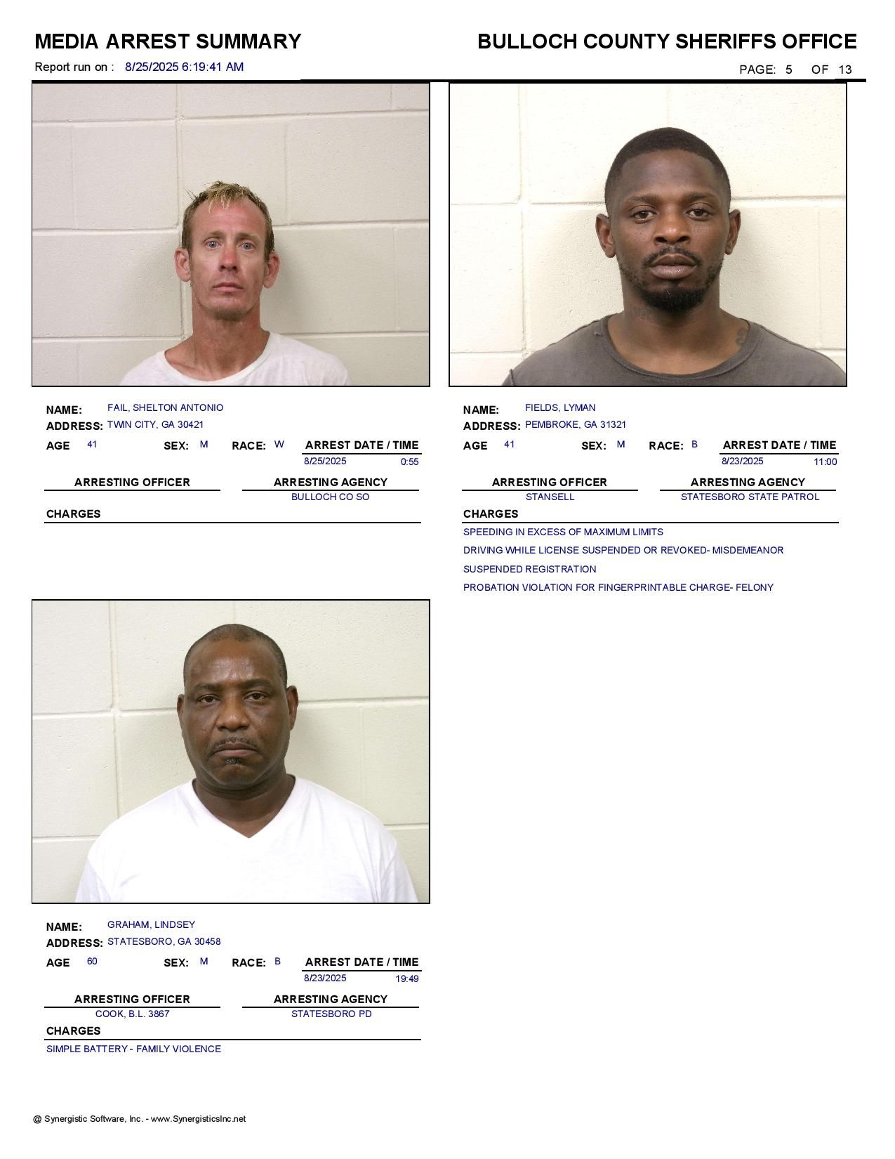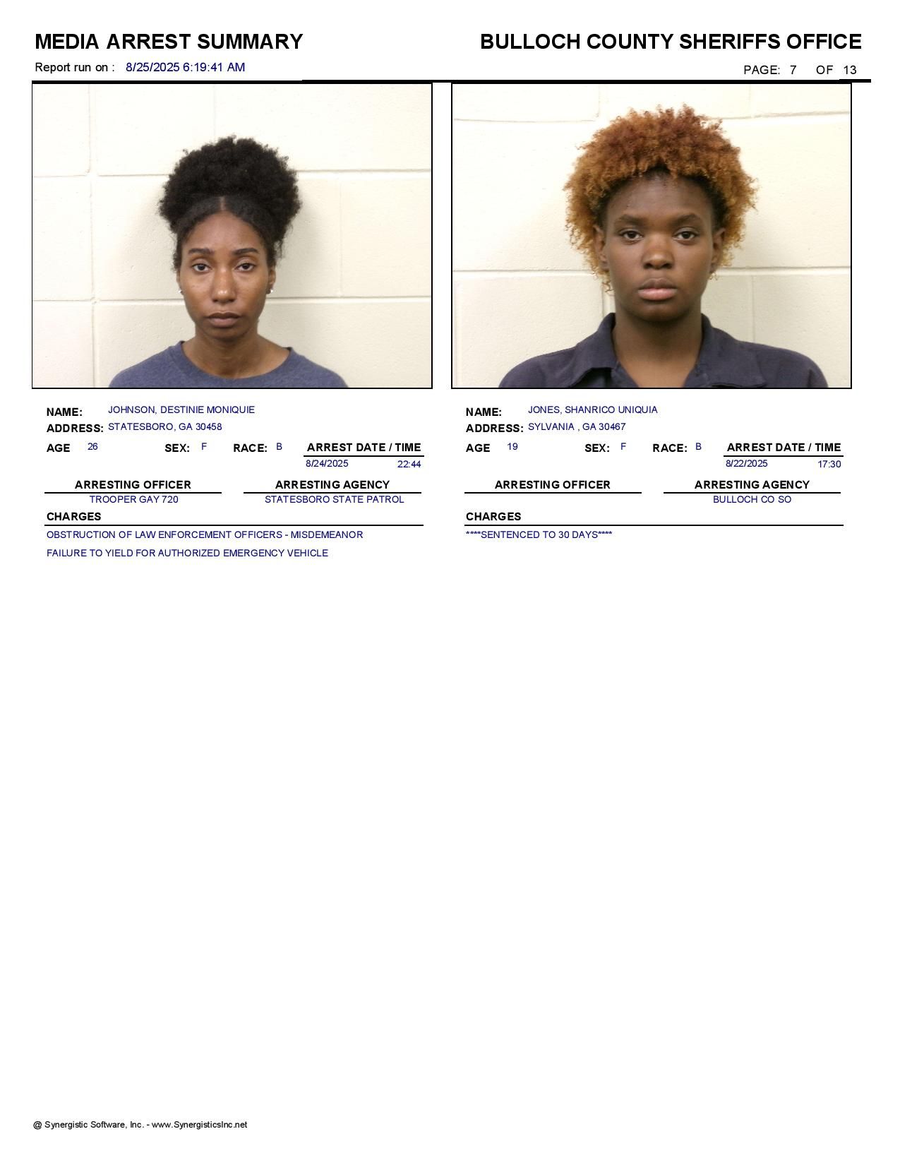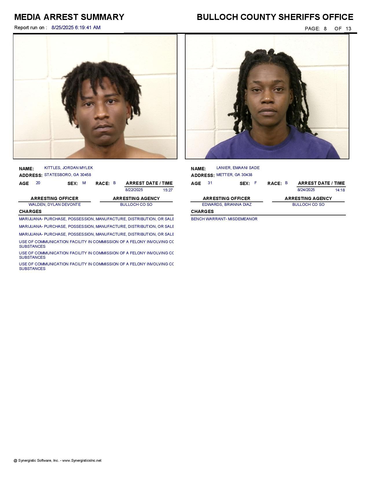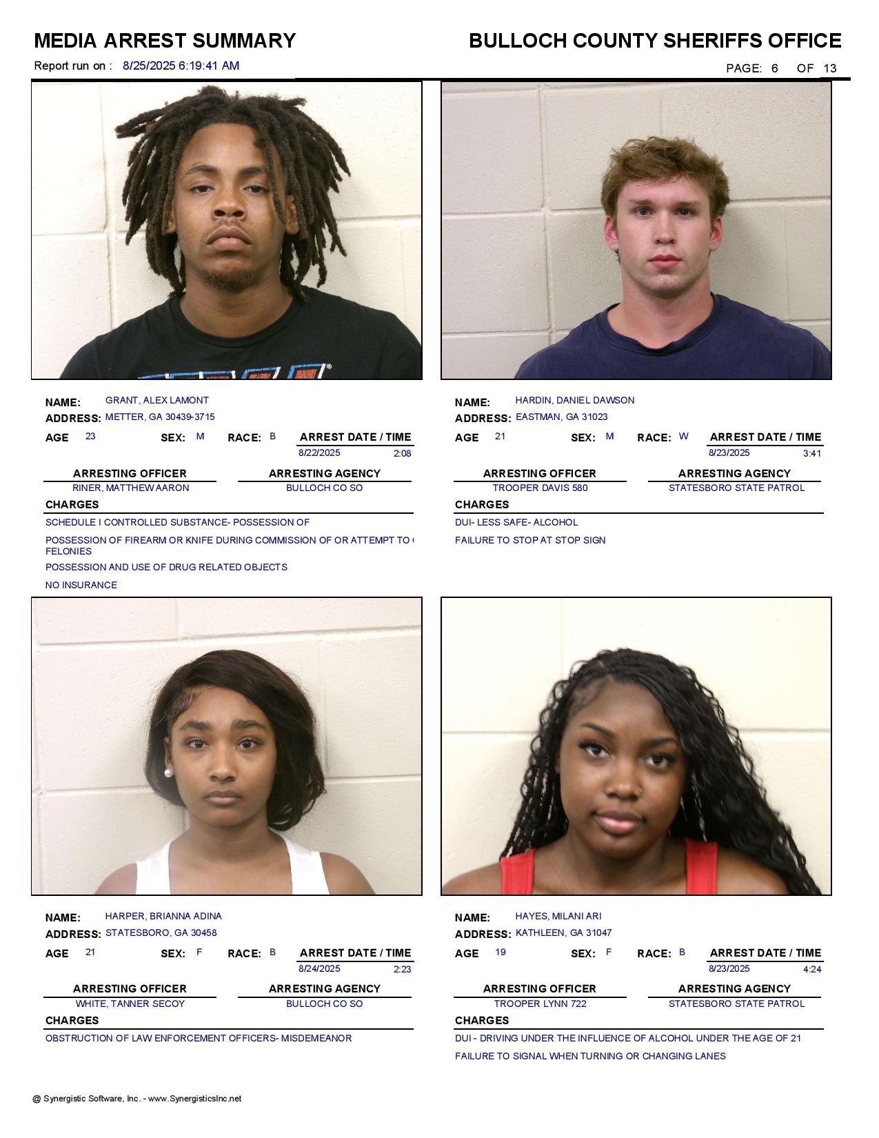 The Bulloch Co Jail Booking & Incident Report 08/25/25 details arrests from Bulloch Co., Statesboro, Brooklet, Portal, Register, and the Georgia State Patrol. Incident reports are from the Sheriff’s Office only.