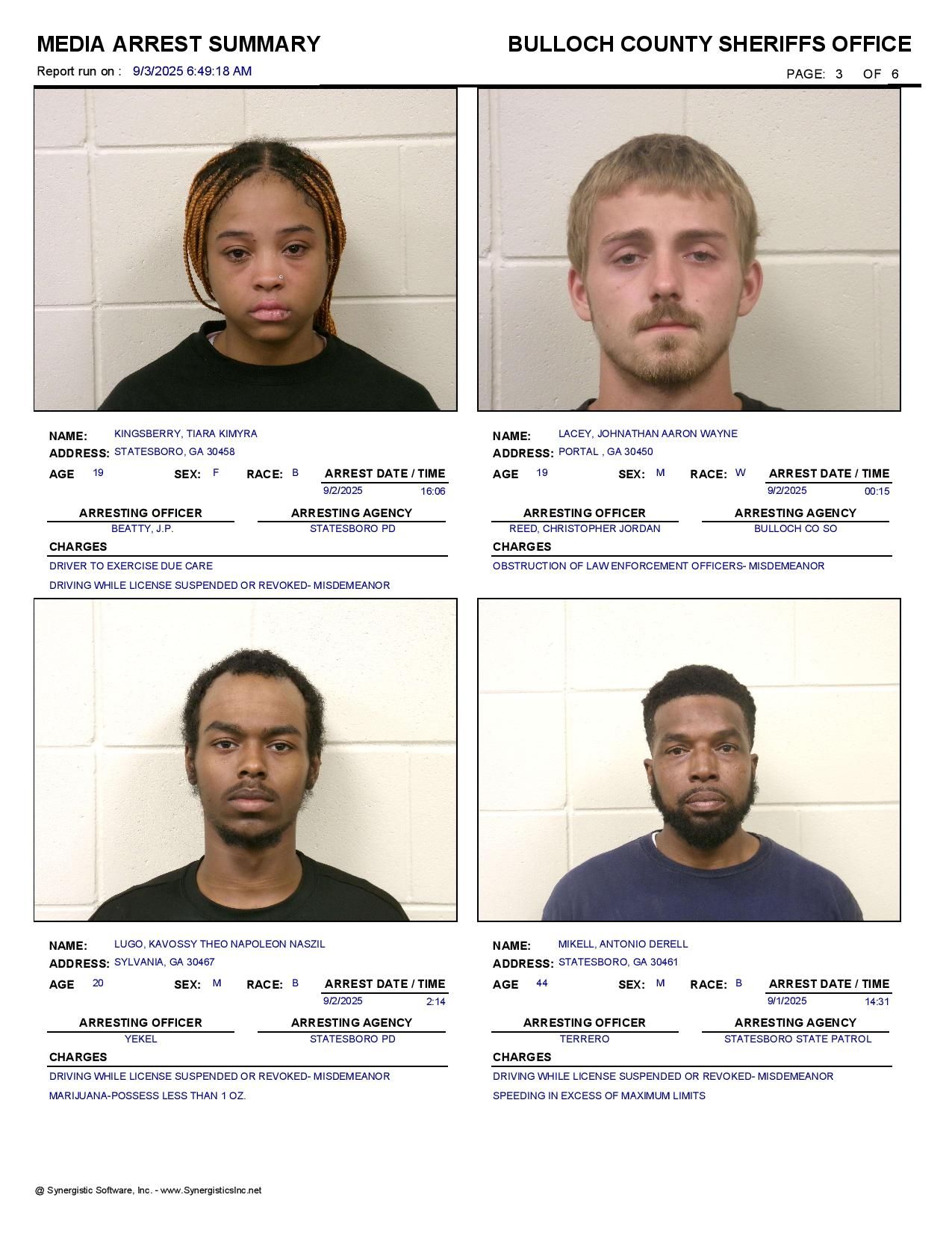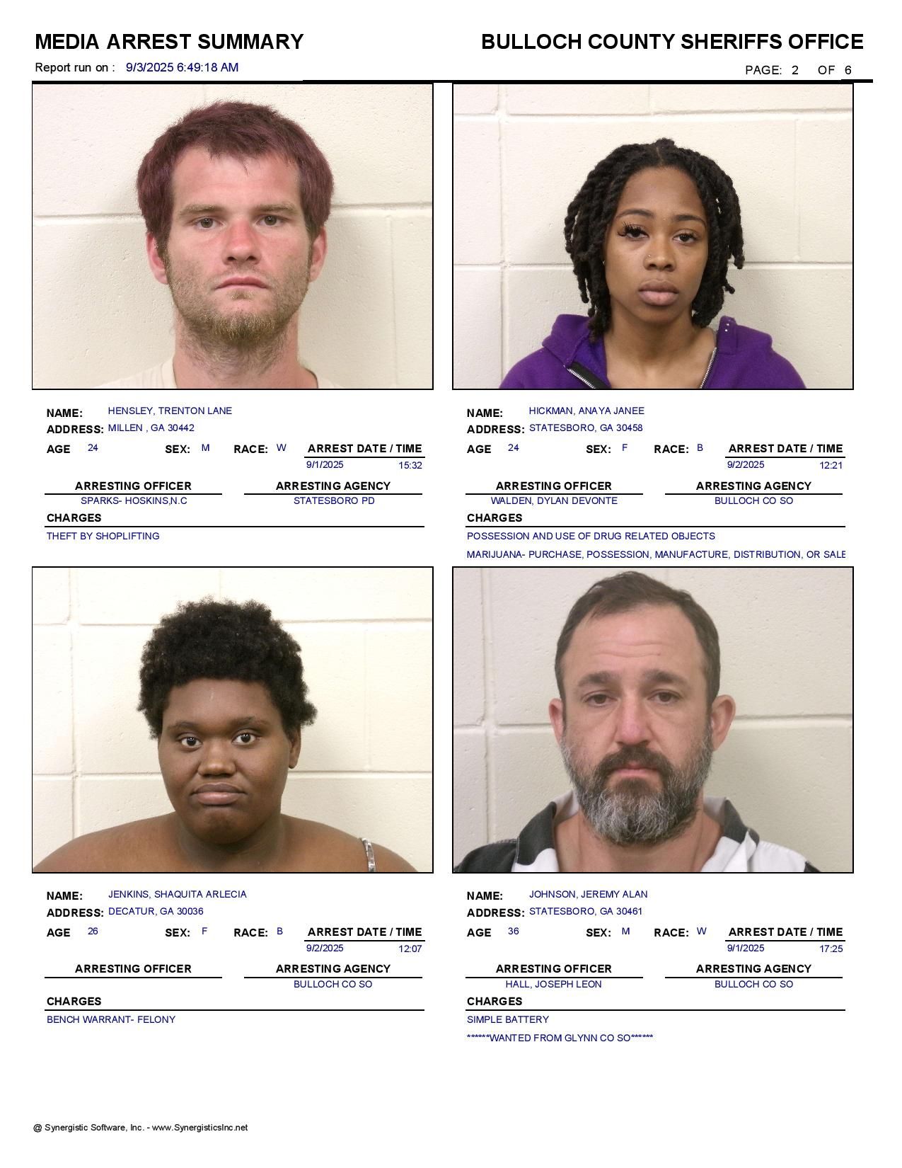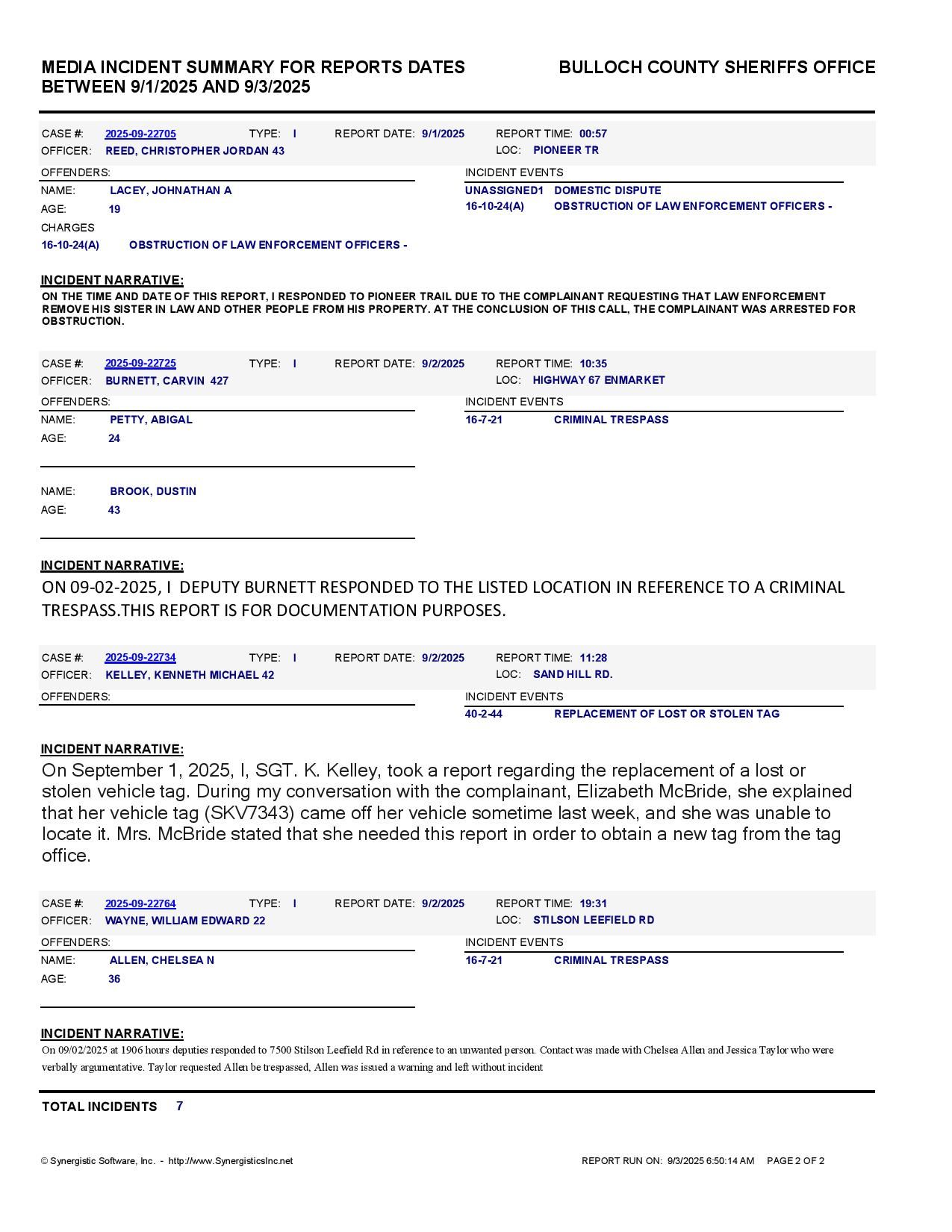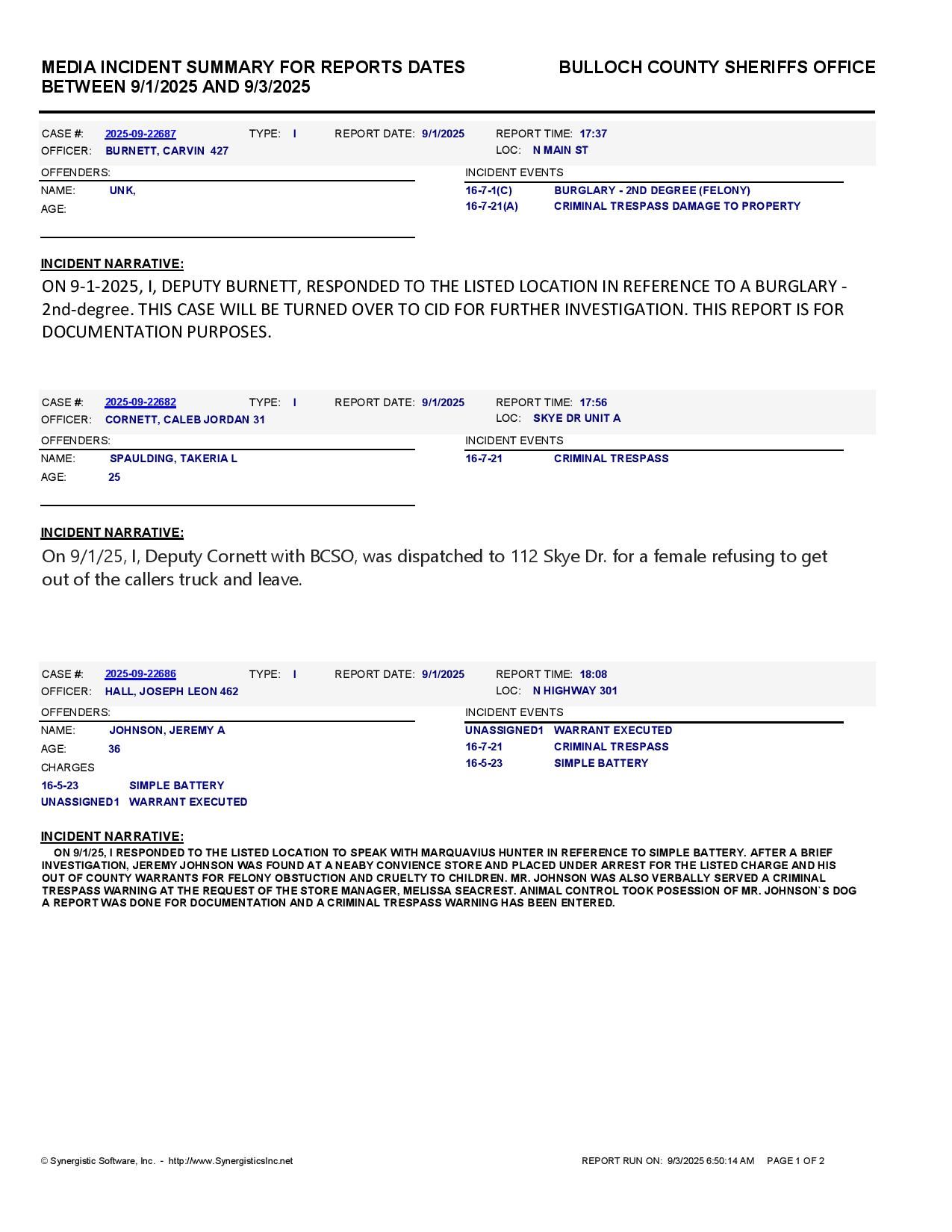 The Bulloch Co Jail Booking & Incident Report 09/03/25 details arrests from Bulloch Co., Statesboro, Brooklet, Portal, Register, and the Georgia State Patrol. Incident reports are from the Sheriff’s Office only.