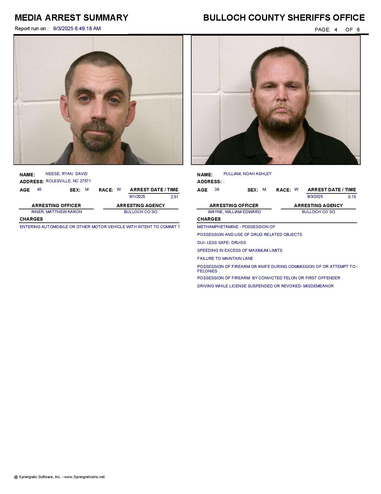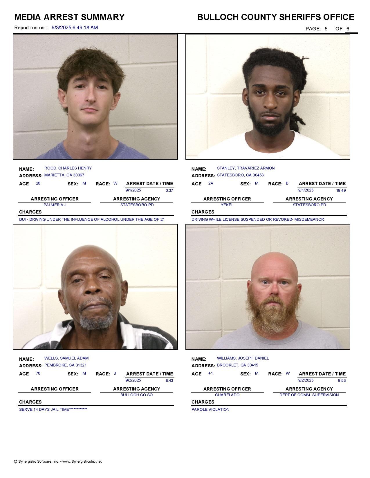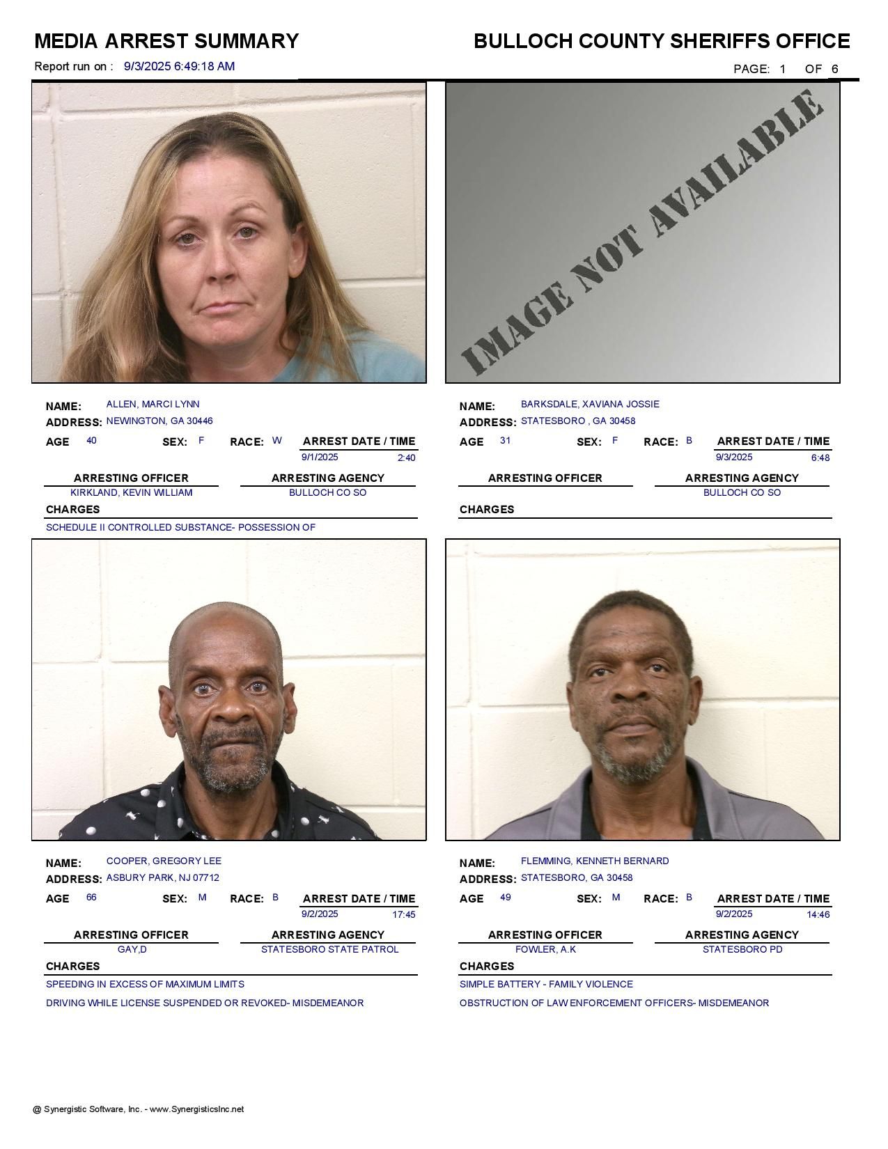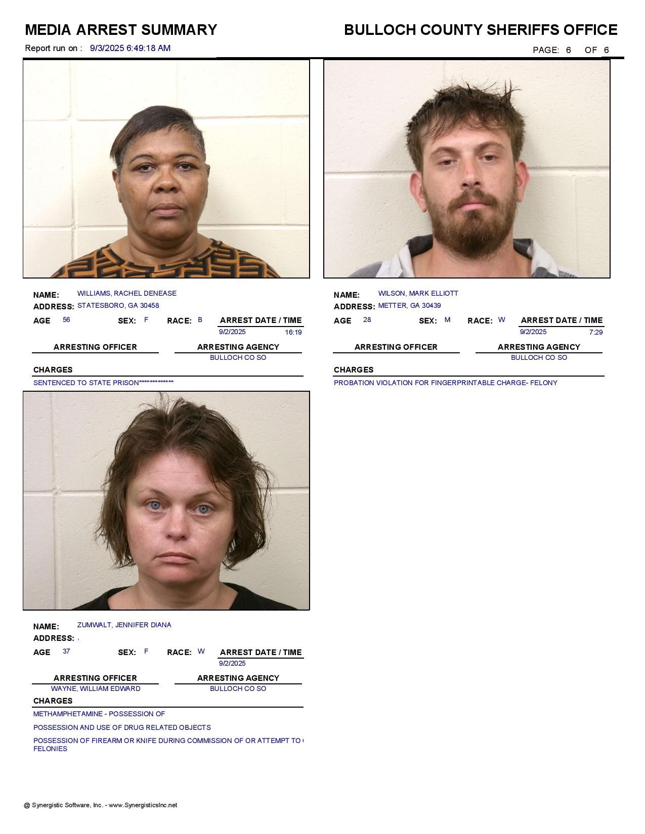 The Bulloch Co Jail Booking & Incident Report 09/03/25 details arrests from Bulloch Co., Statesboro, Brooklet, Portal, Register, and the Georgia State Patrol. Incident reports are from the Sheriff’s Office only.
