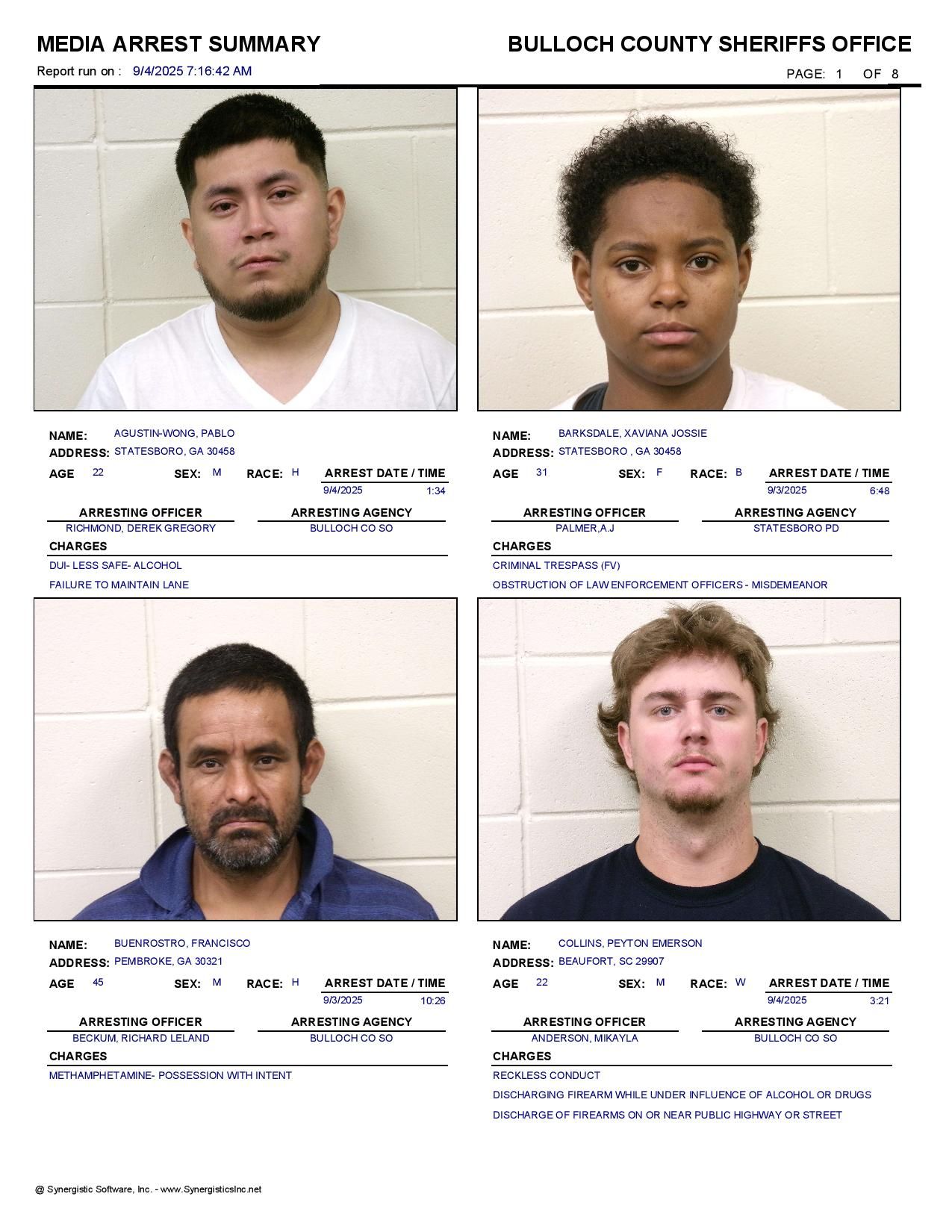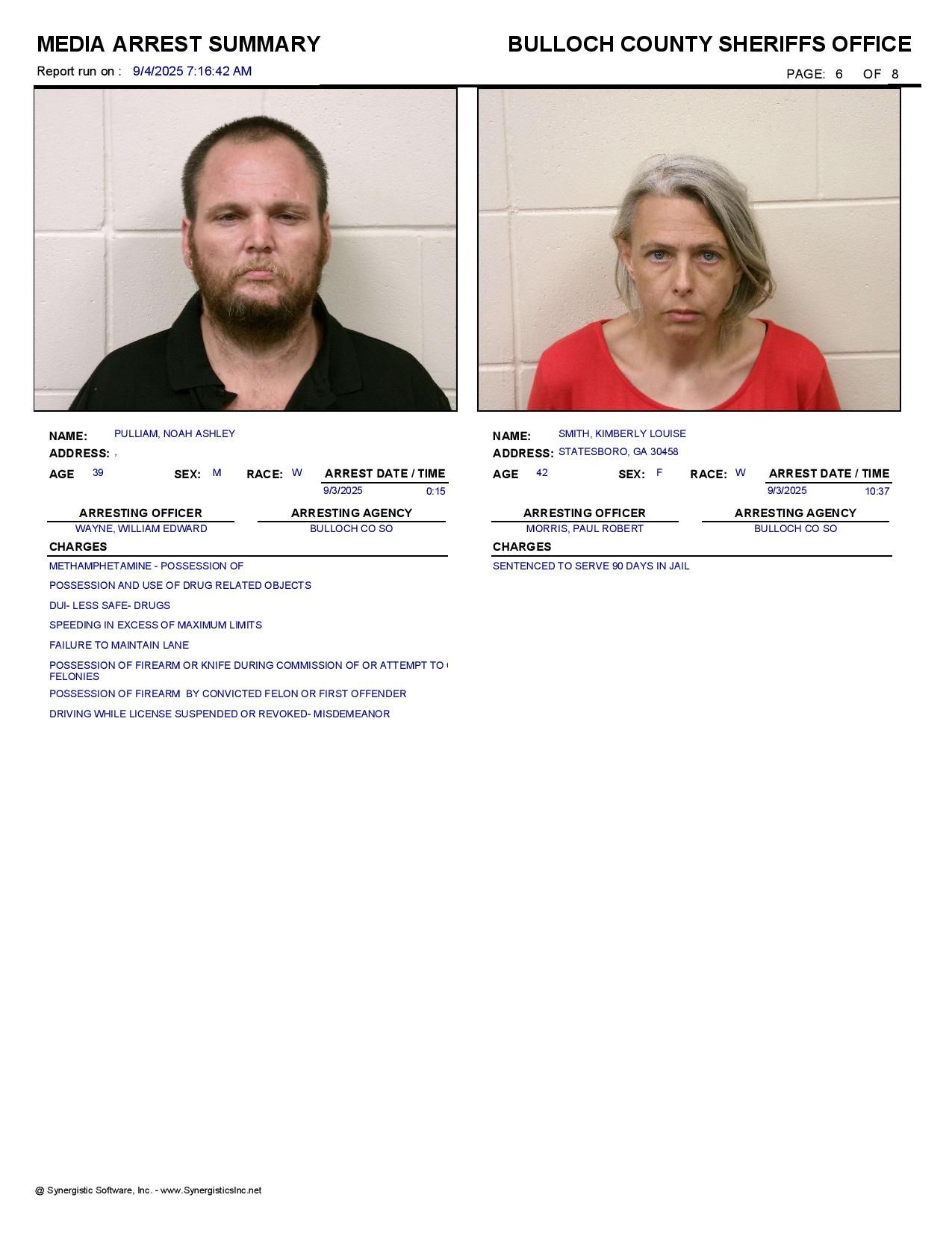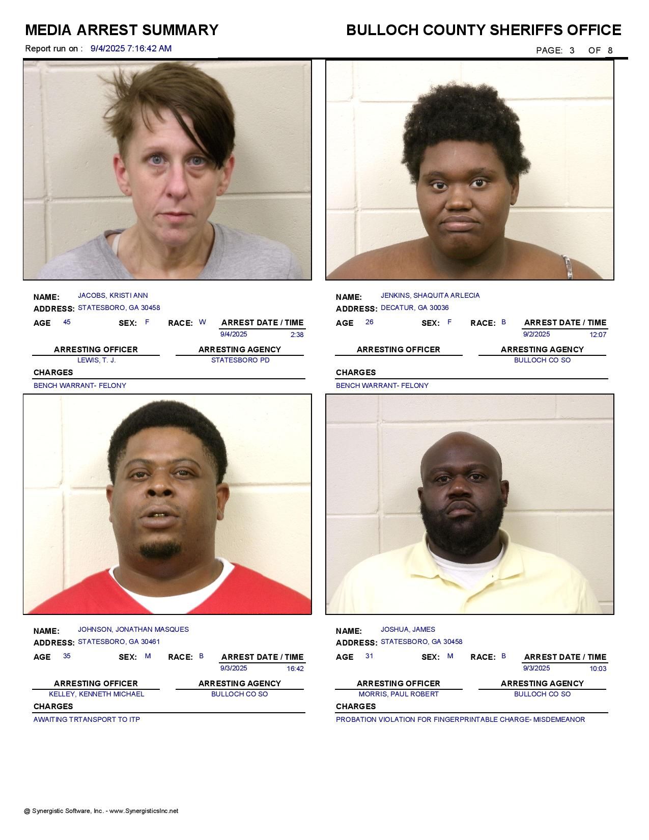 Bulloch Co. Jail Booking & Incident Report – 09/04/25
