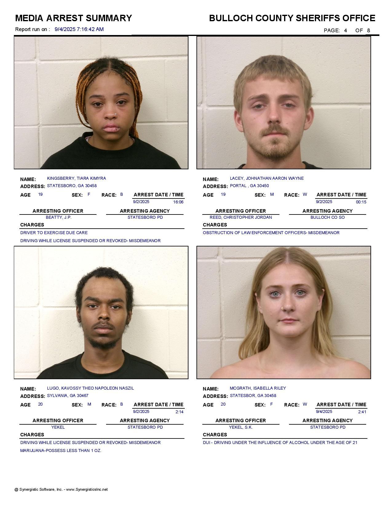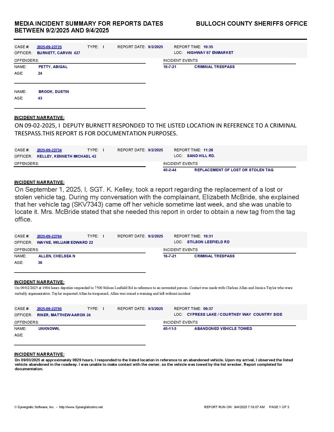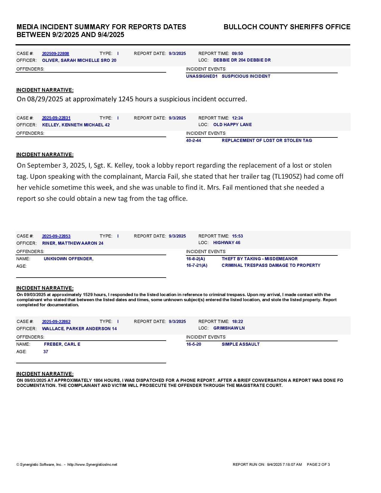 The Bulloch Co Jail Booking & Incident Report 09/04/25 details arrests from Bulloch Co., Statesboro, Brooklet, Portal, Register, and the Georgia State Patrol. Incident reports are from the Sheriff’s Office only.
