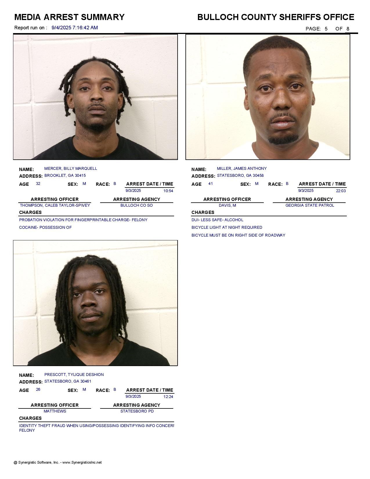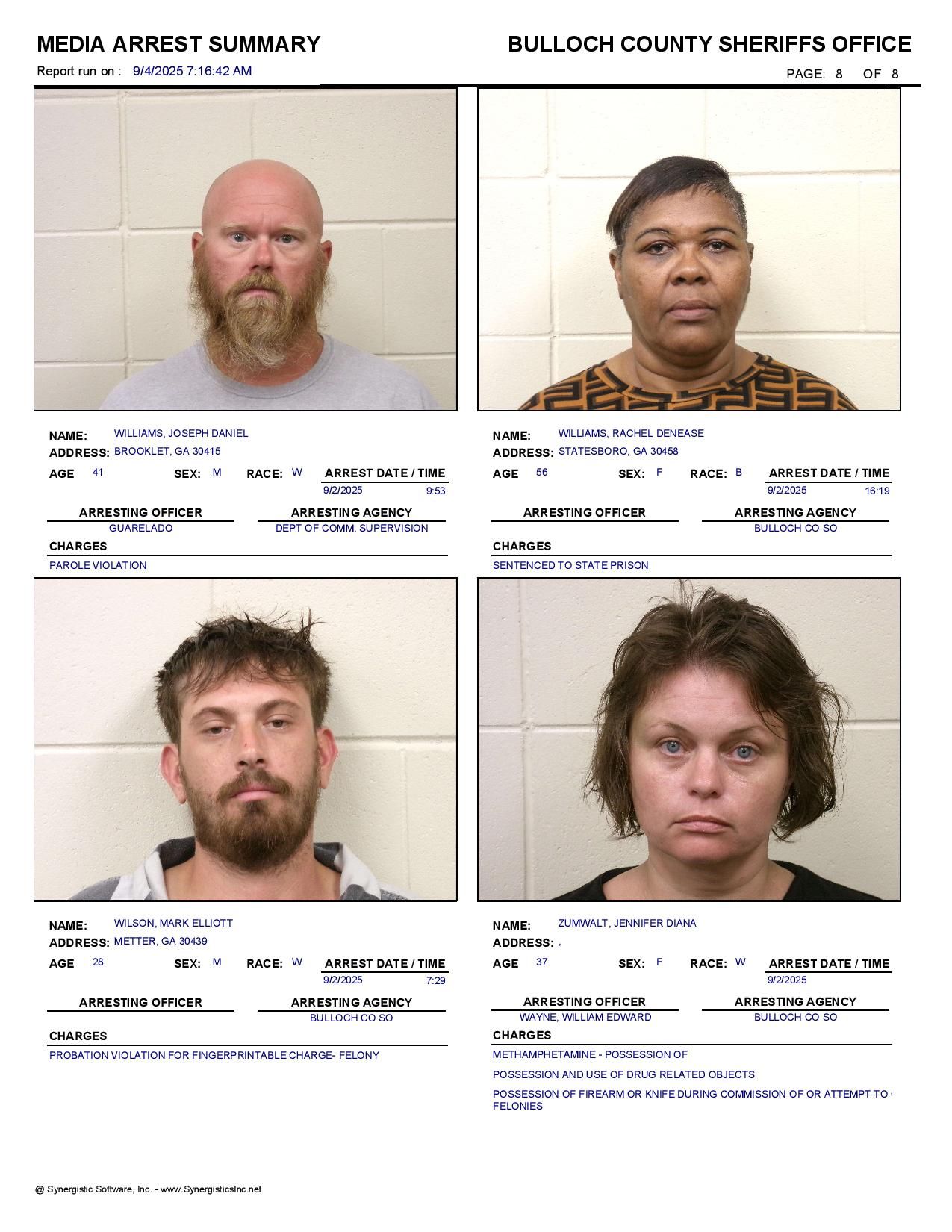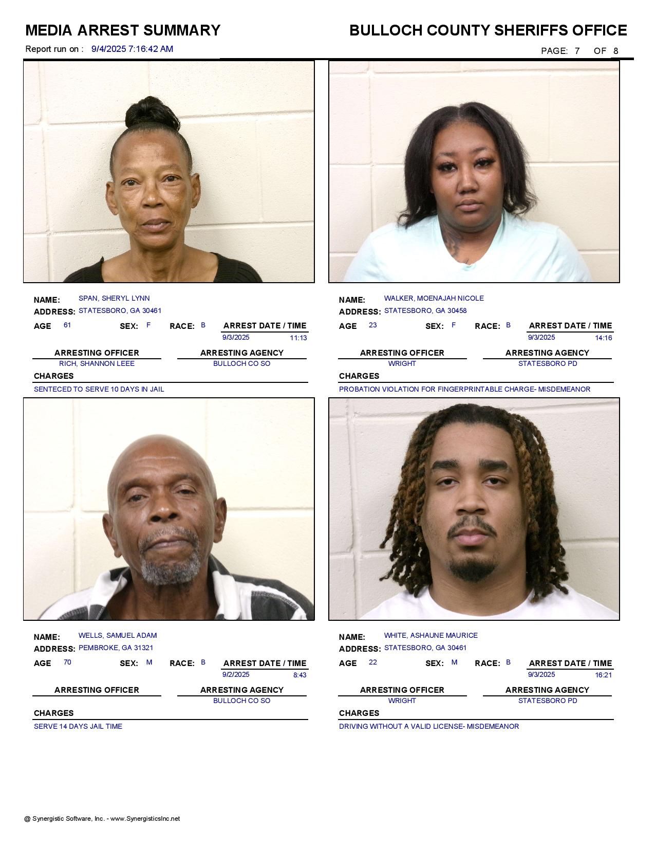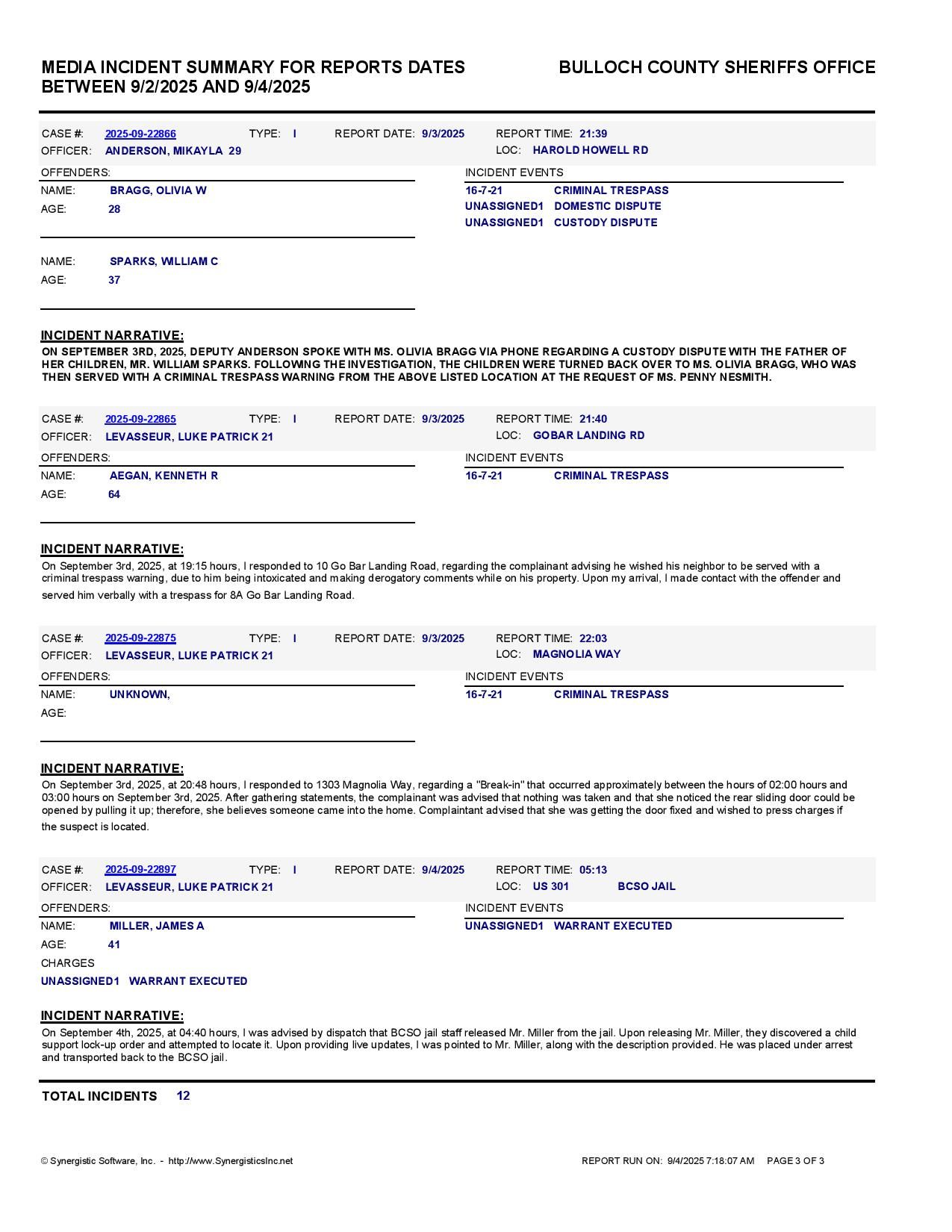 The Bulloch Co Jail Booking & Incident Report 09/04/25 details arrests from Bulloch Co., Statesboro, Brooklet, Portal, Register, and the Georgia State Patrol. Incident reports are from the Sheriff’s Office only.