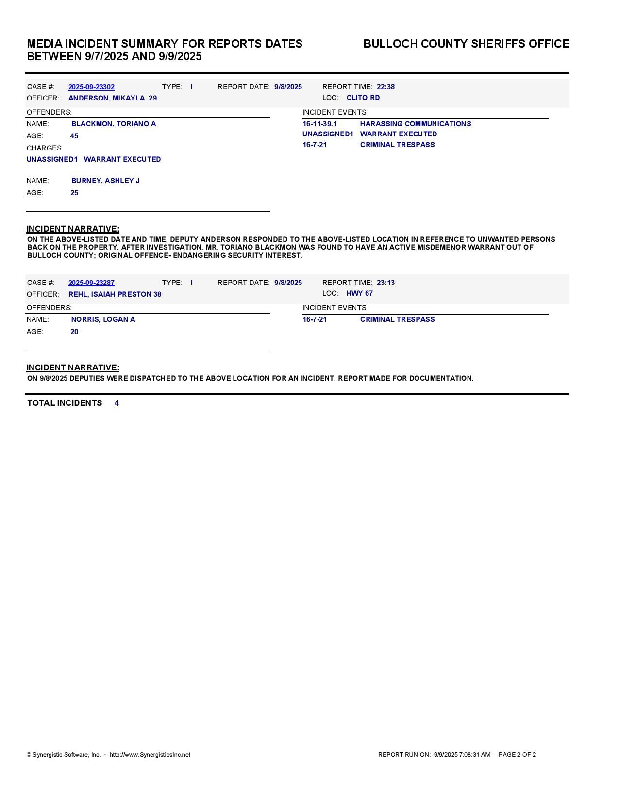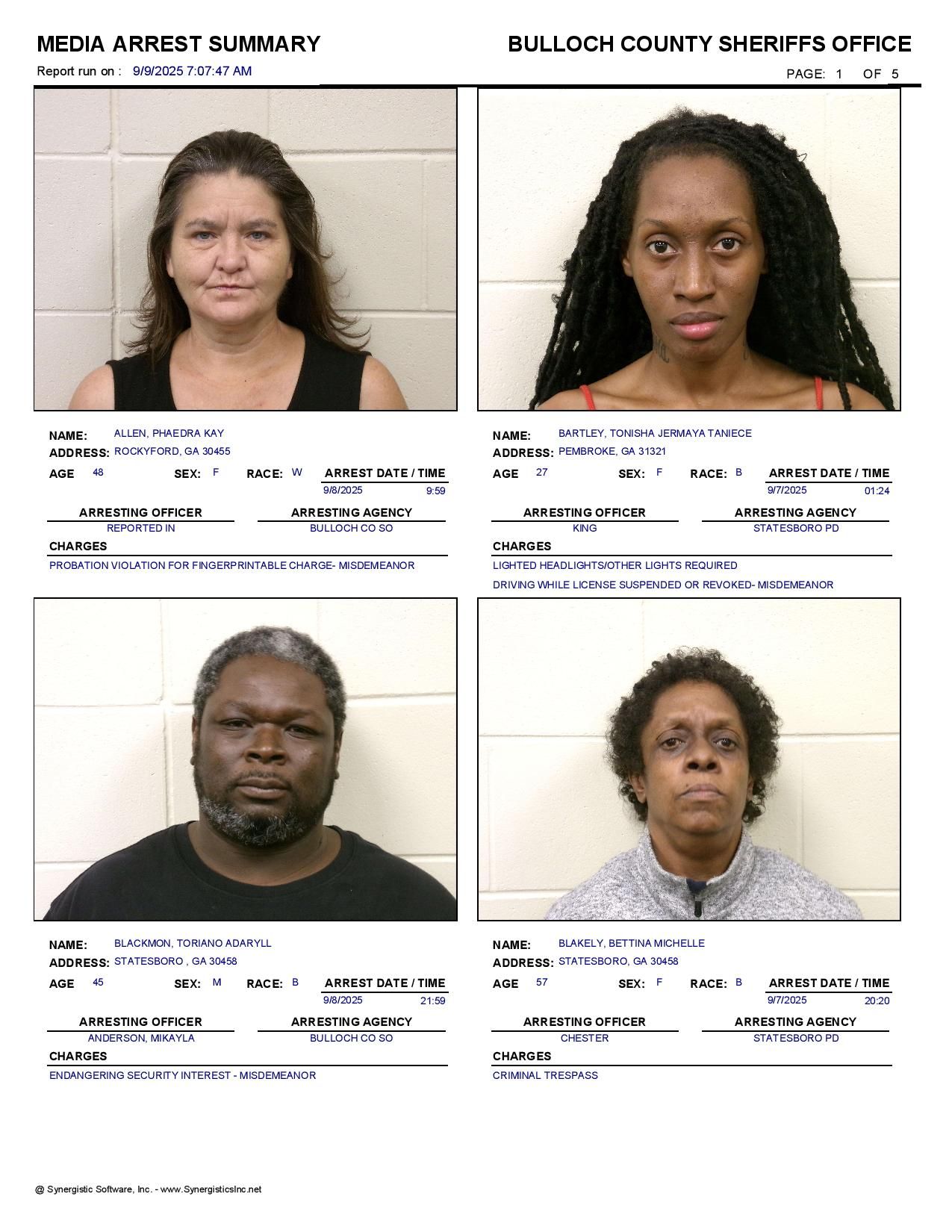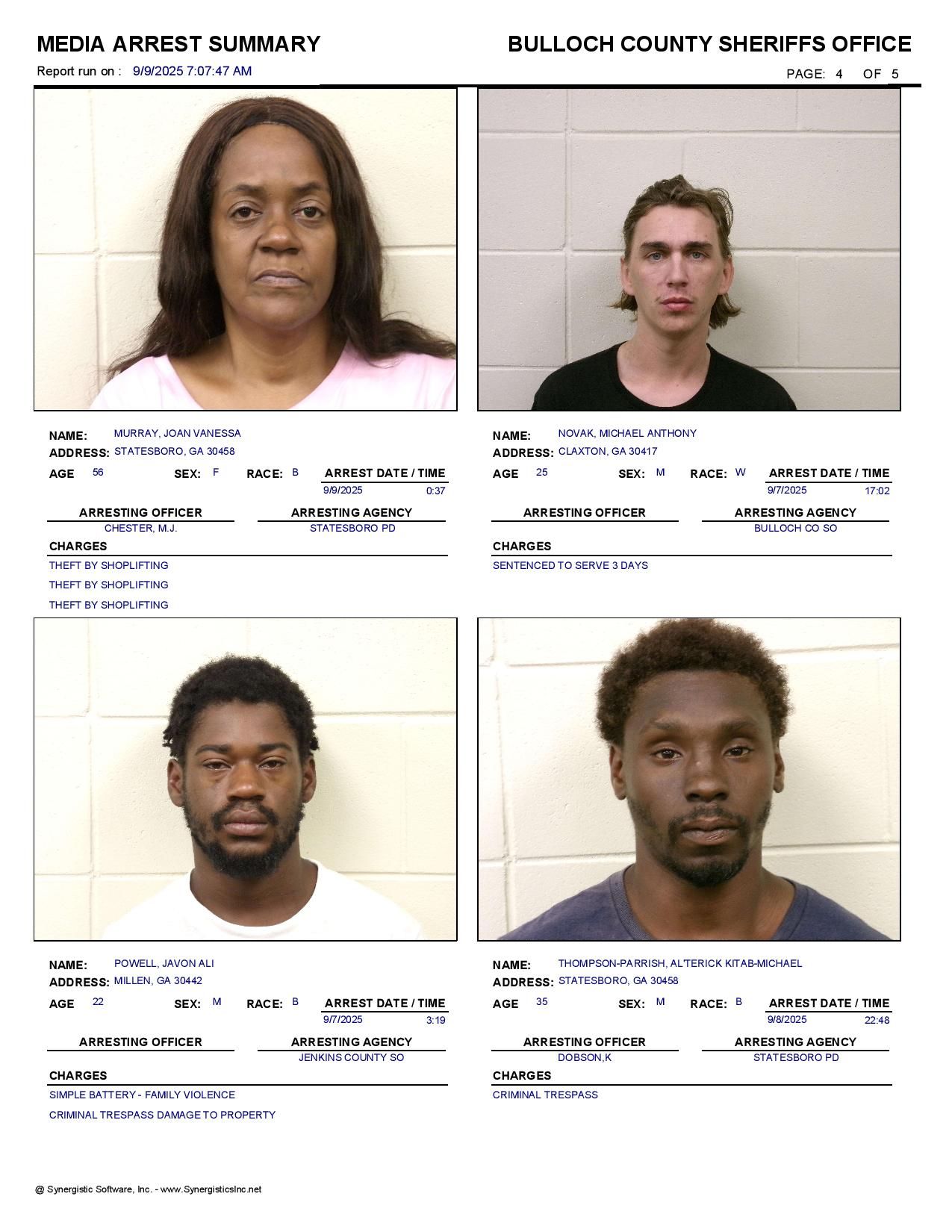 The Bulloch Co Jail Booking & Incident Report 09/09/25 details arrests from Bulloch Co., Statesboro, Brooklet, Portal, Register, and the Georgia State Patrol. Incident reports are from the Sheriff’s Office only.