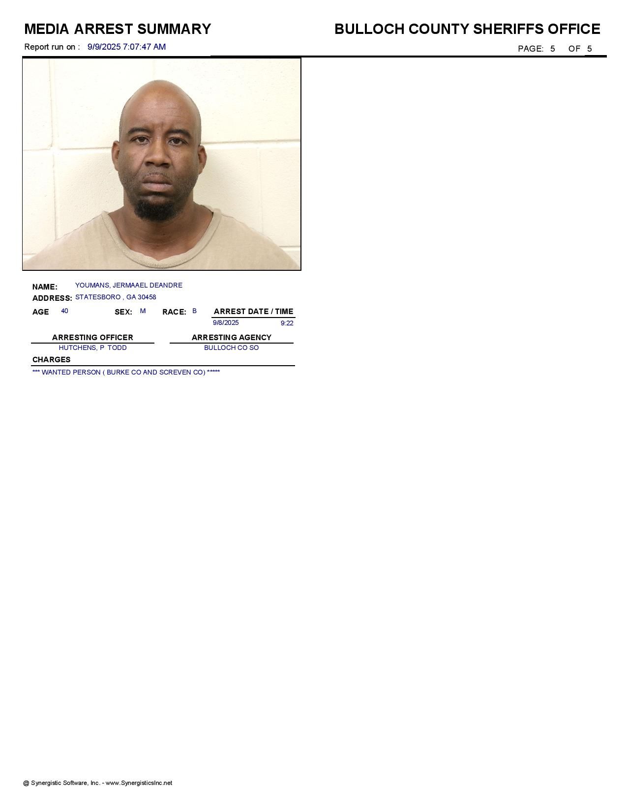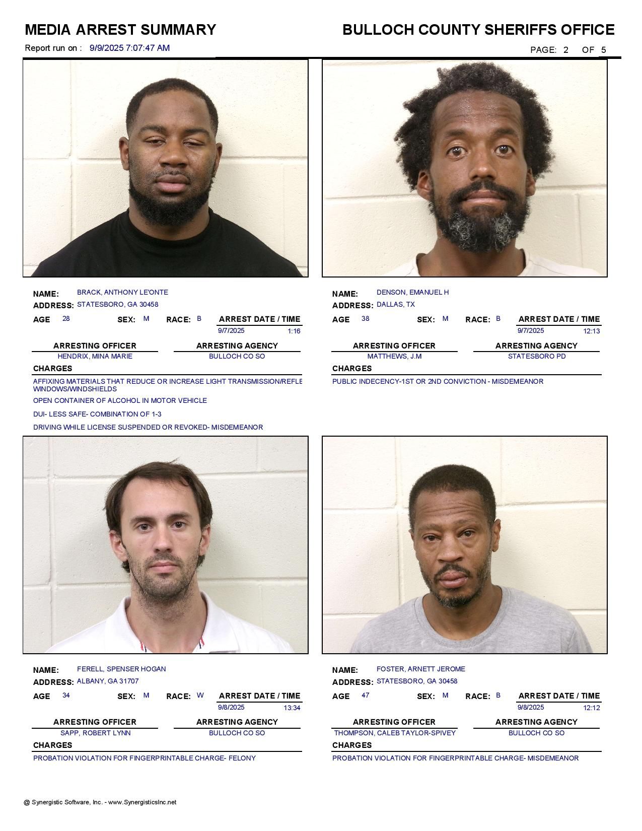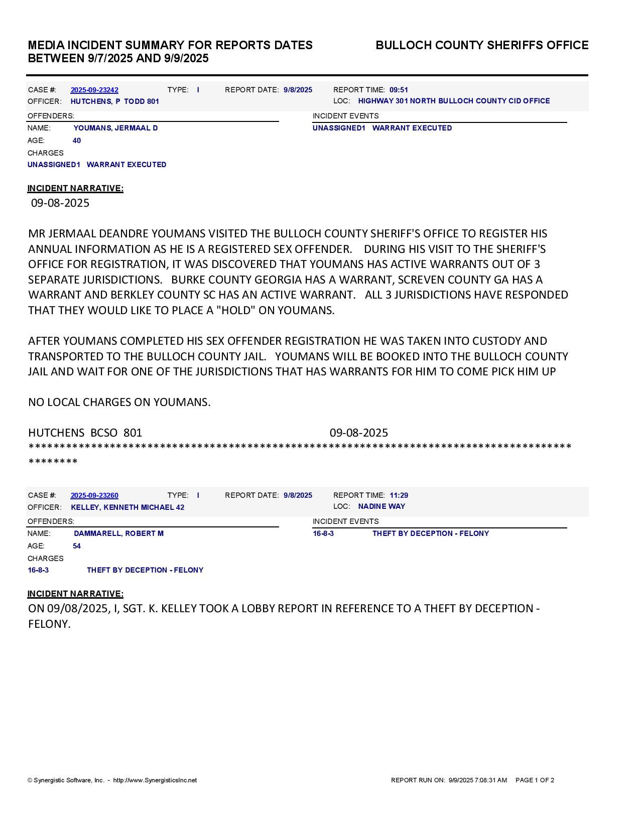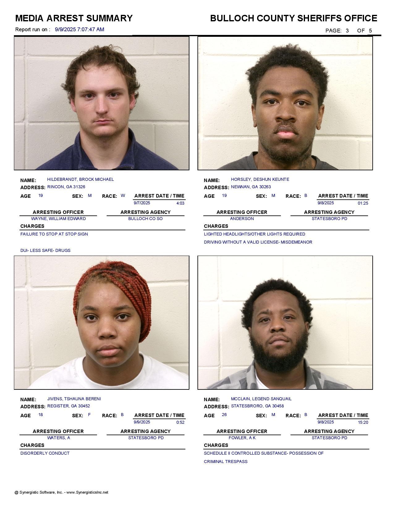 The Bulloch Co Jail Booking & Incident Report 09/09/25 details arrests from Bulloch Co., Statesboro, Brooklet, Portal, Register, and the Georgia State Patrol. Incident reports are from the Sheriff’s Office only.