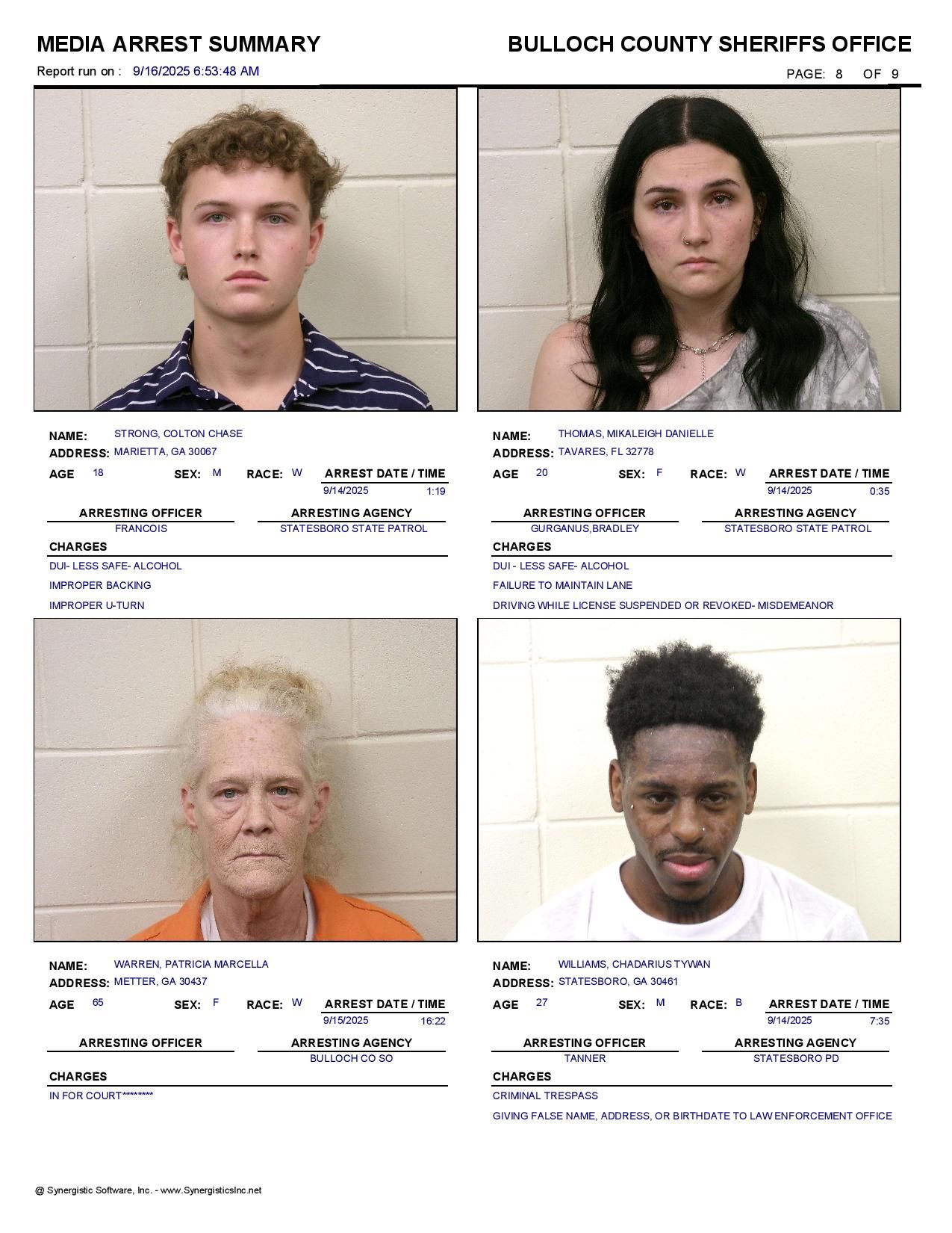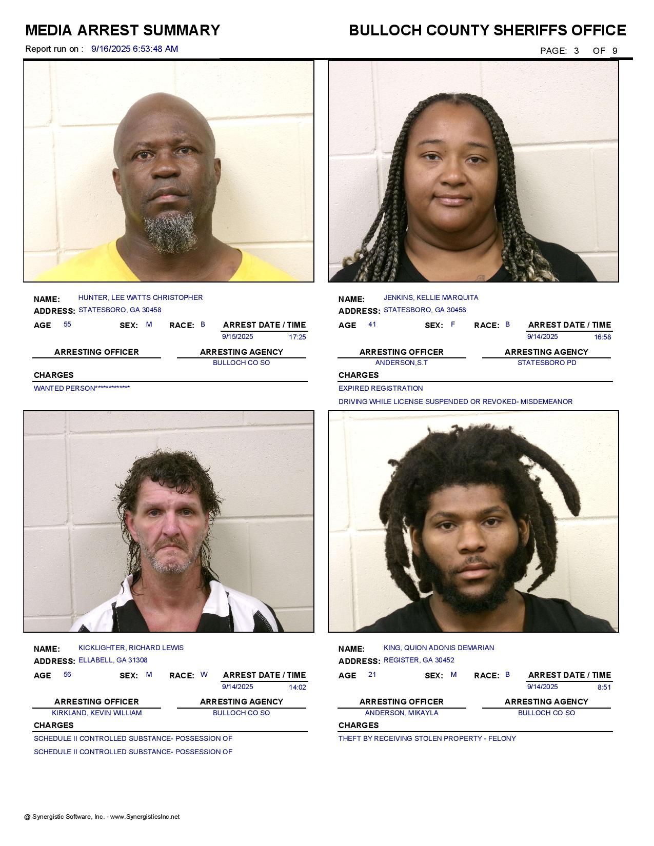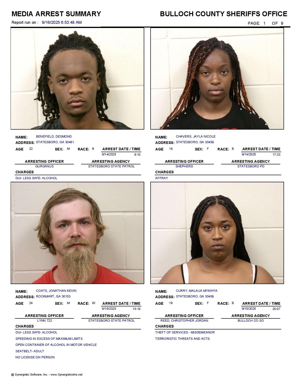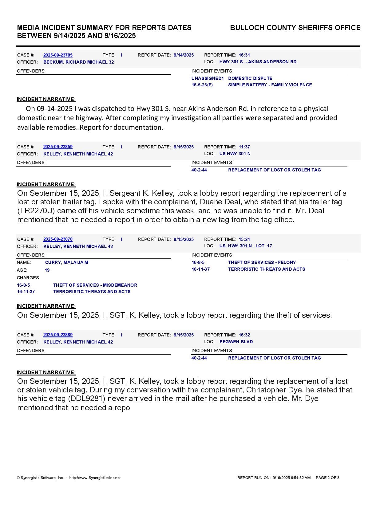 The Bulloch Co Jail Booking & Incident Report 09/16/25 details arrests from Bulloch Co., Statesboro, Brooklet, Portal, Register, and the Georgia State Patrol. Incident reports are from the Sheriff’s Office only.