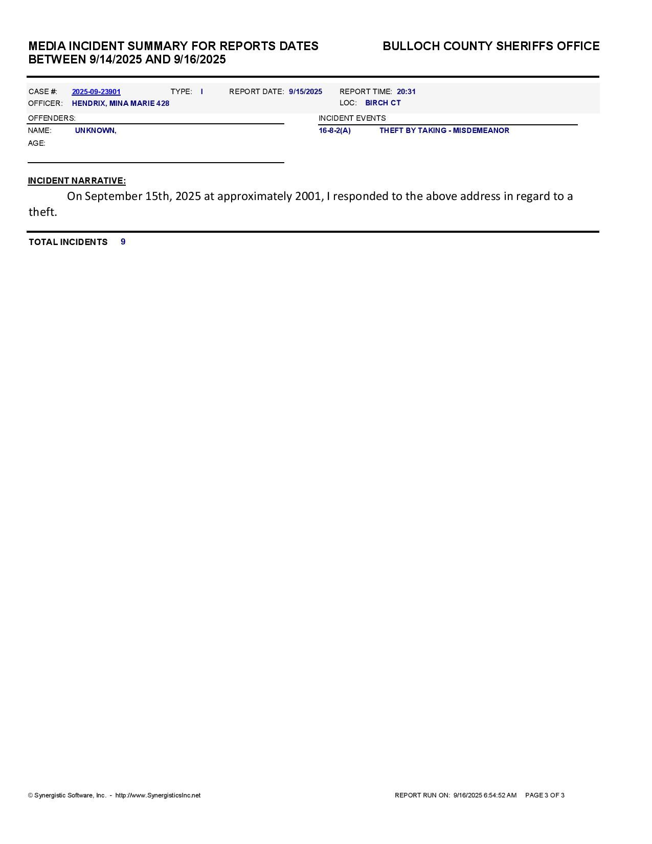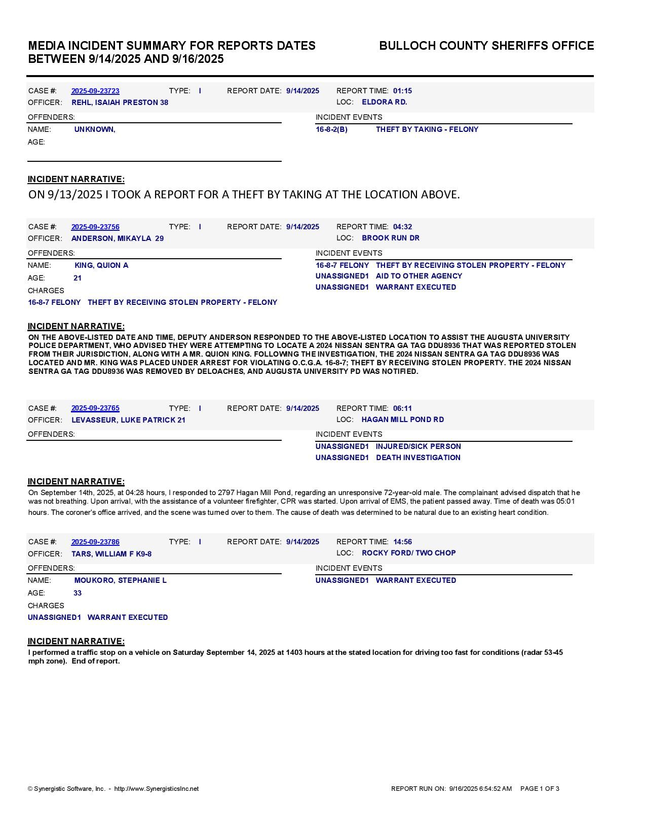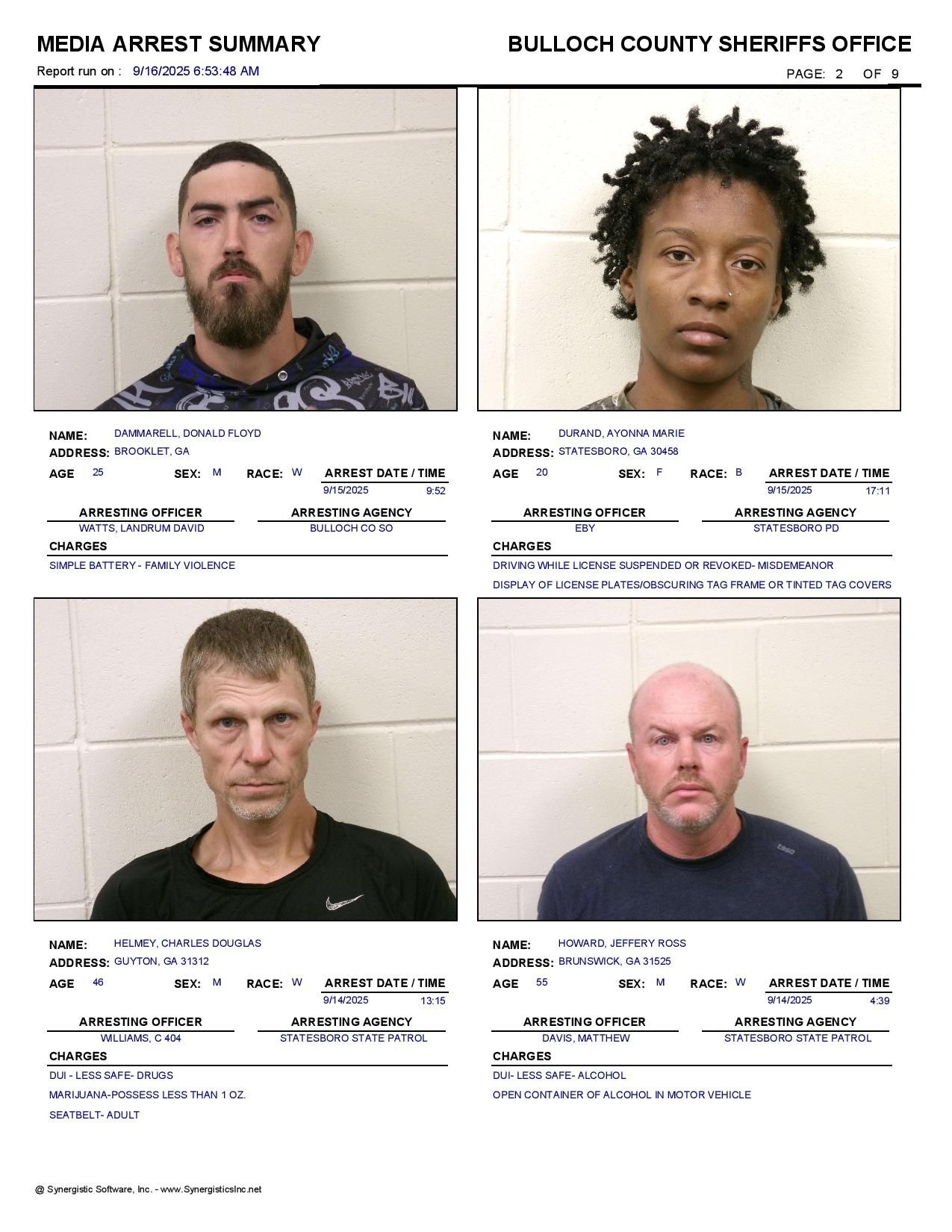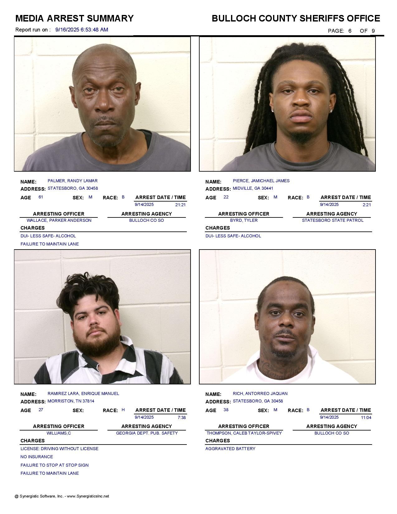 The Bulloch Co Jail Booking & Incident Report 09/16/25 details arrests from Bulloch Co., Statesboro, Brooklet, Portal, Register, and the Georgia State Patrol. Incident reports are from the Sheriff’s Office only.