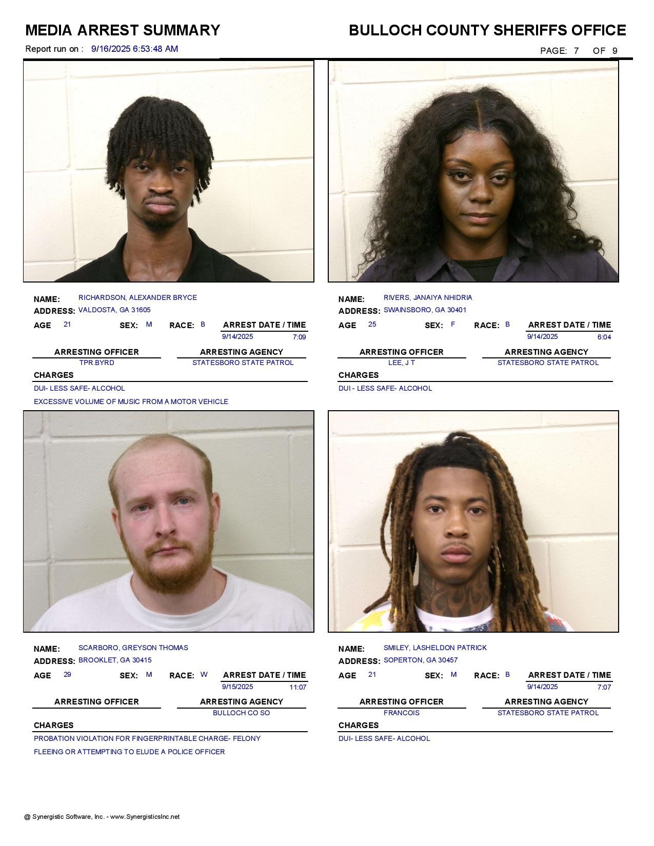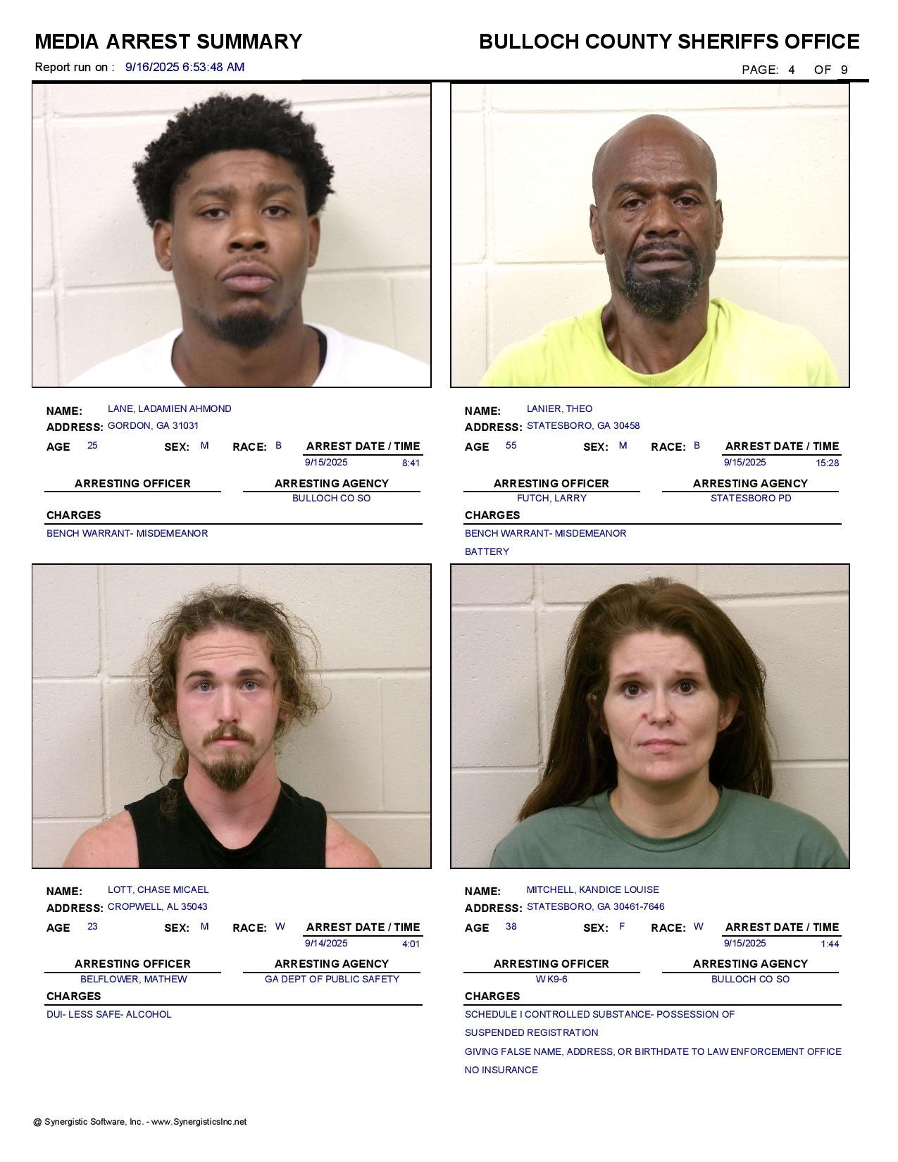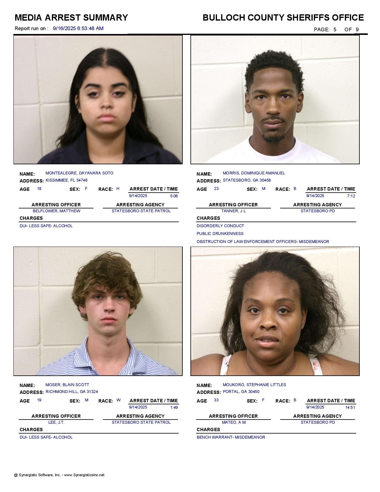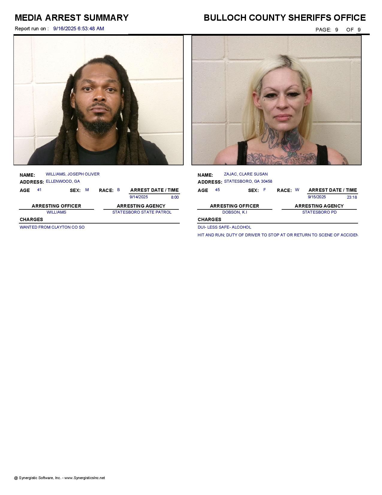 The Bulloch Co Jail Booking & Incident Report 09/16/25 details arrests from Bulloch Co., Statesboro, Brooklet, Portal, Register, and the Georgia State Patrol. Incident reports are from the Sheriff’s Office only.