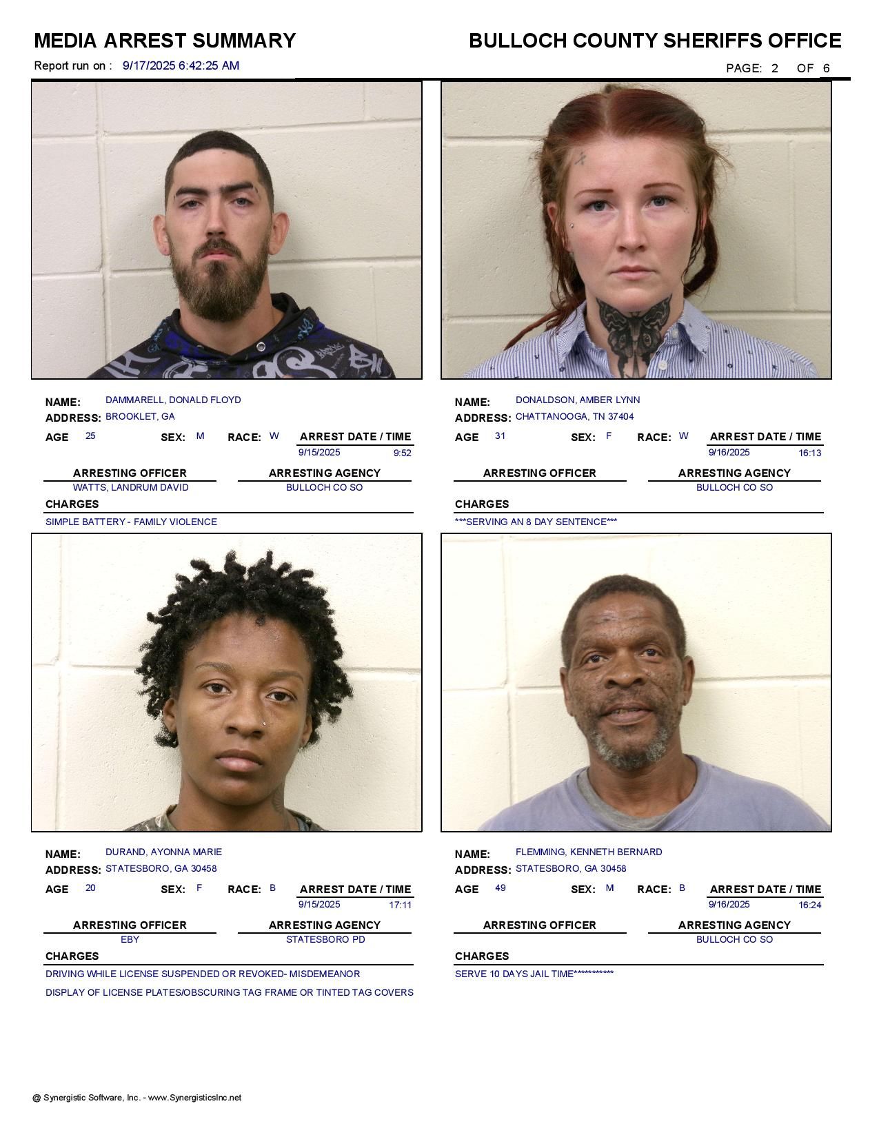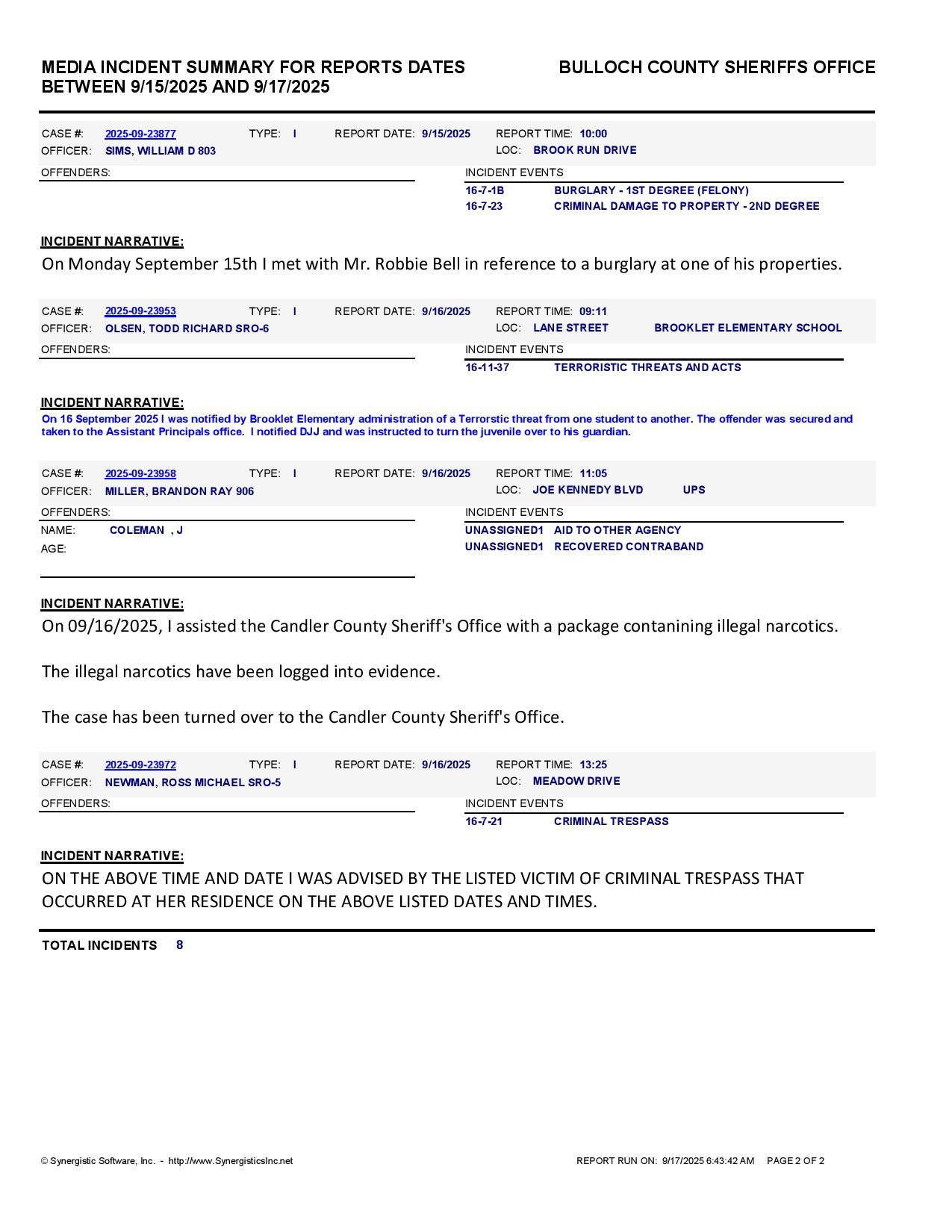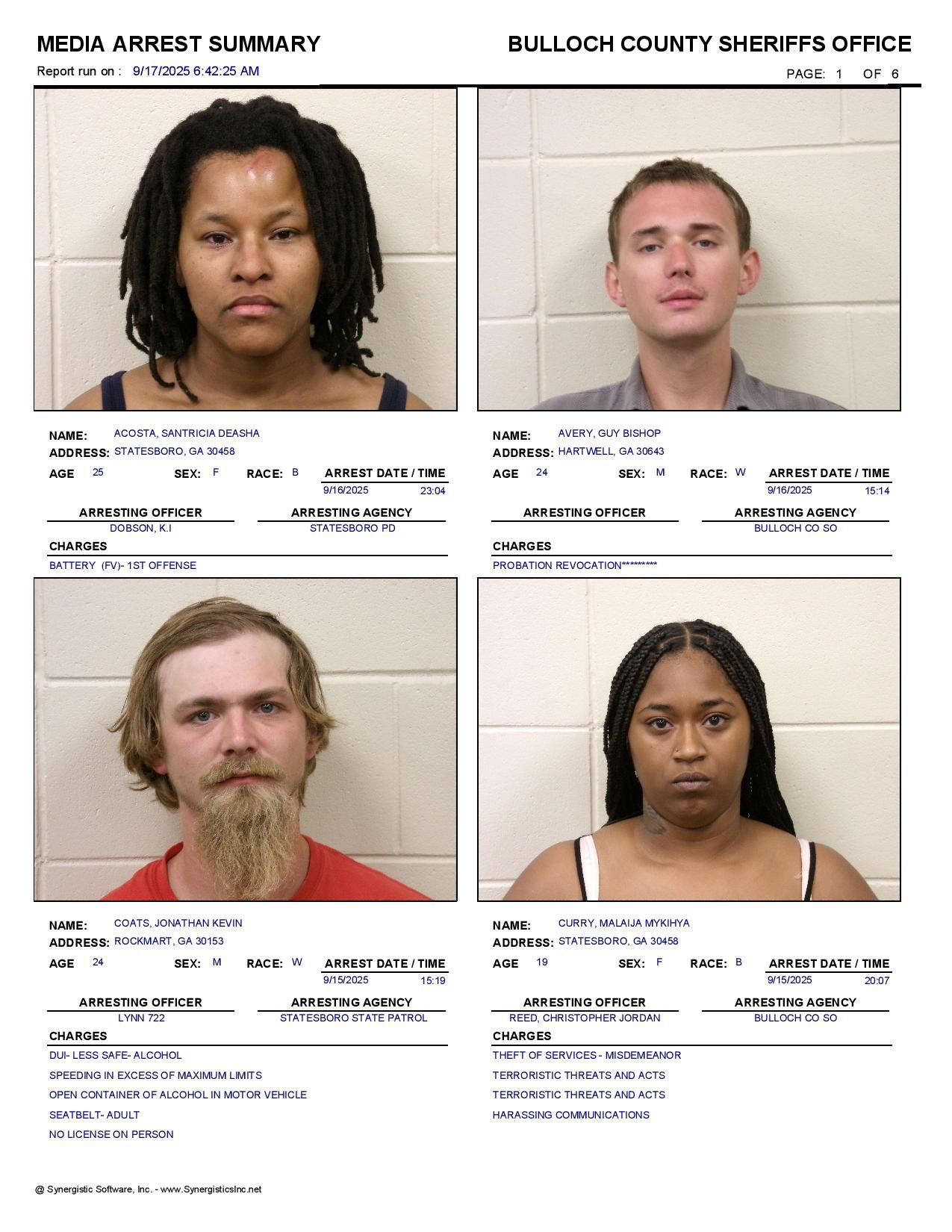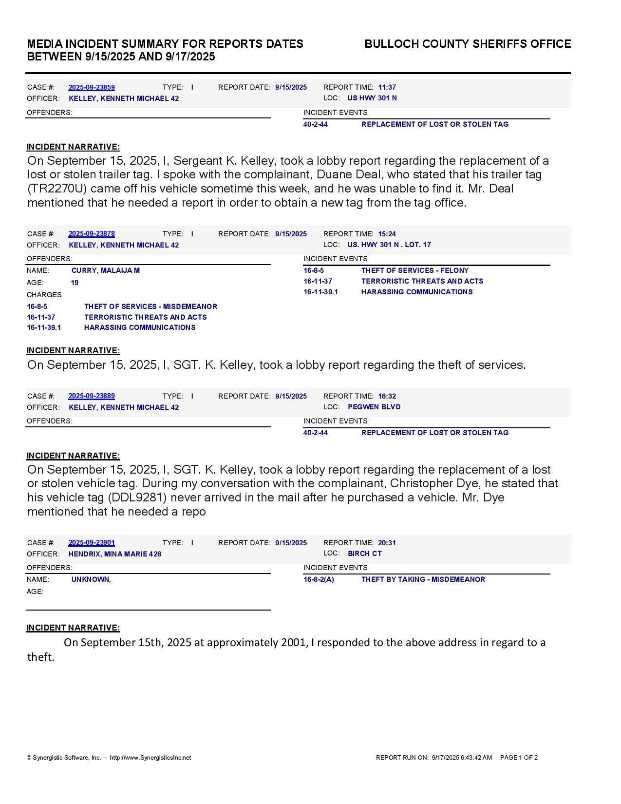 The Bulloch Co Jail Booking & Incident Report 09/17/25 details arrests from Bulloch Co., Statesboro, Brooklet, Portal, Register, and the Georgia State Patrol. Incident reports are from the Sheriff’s Office only.