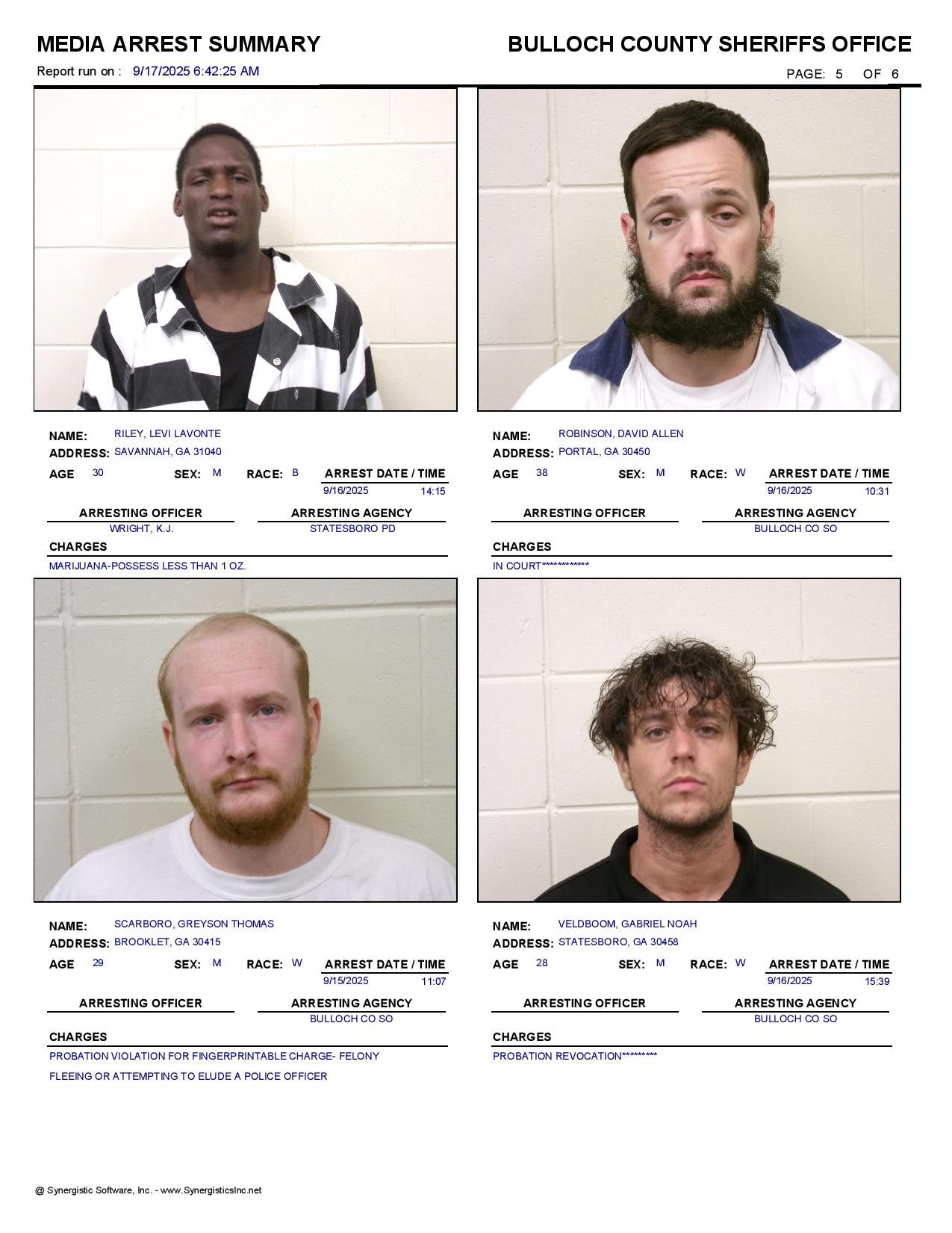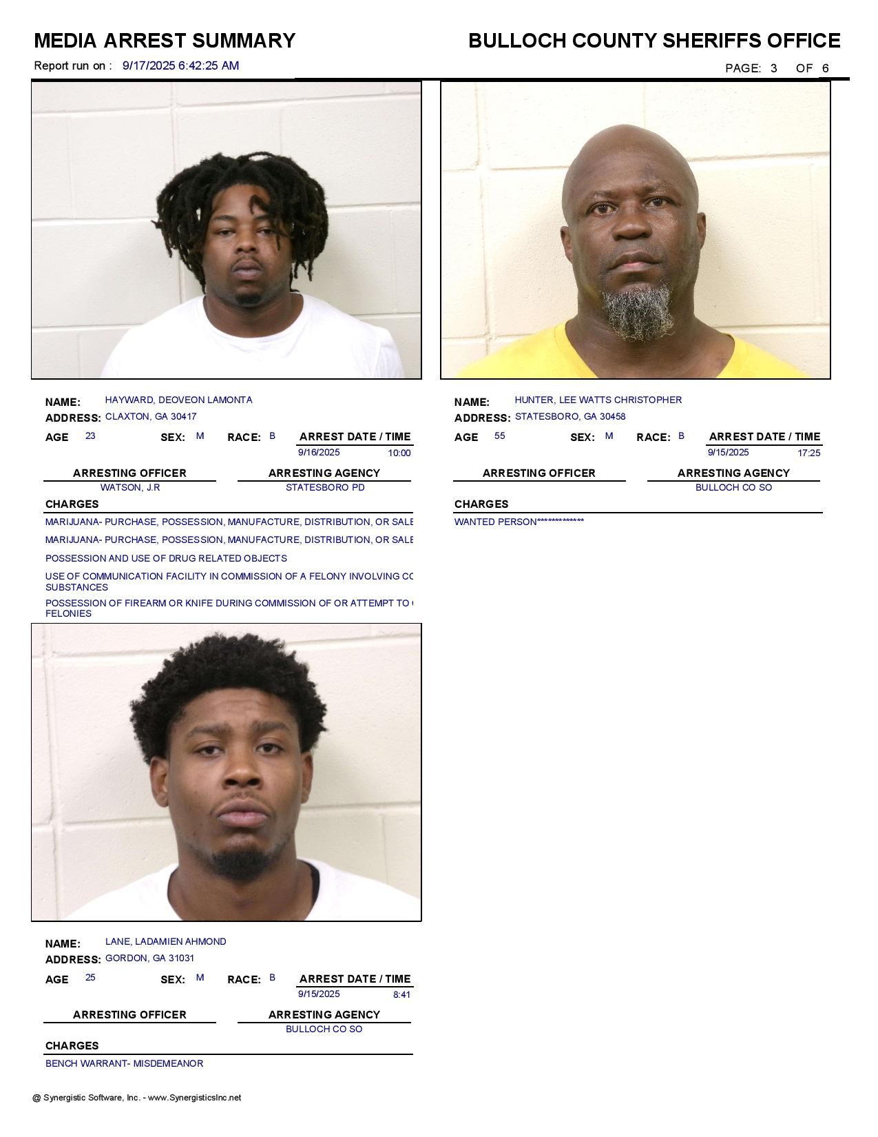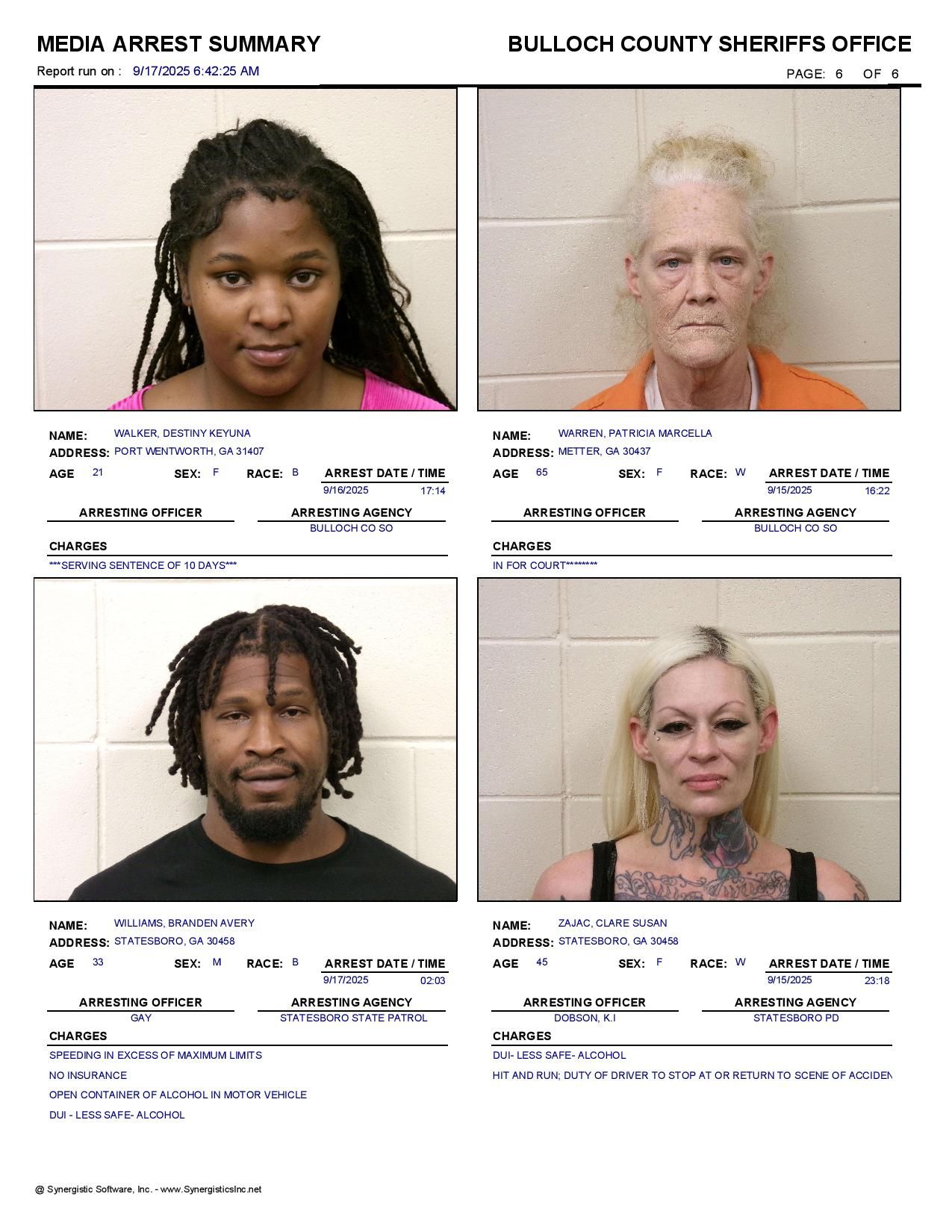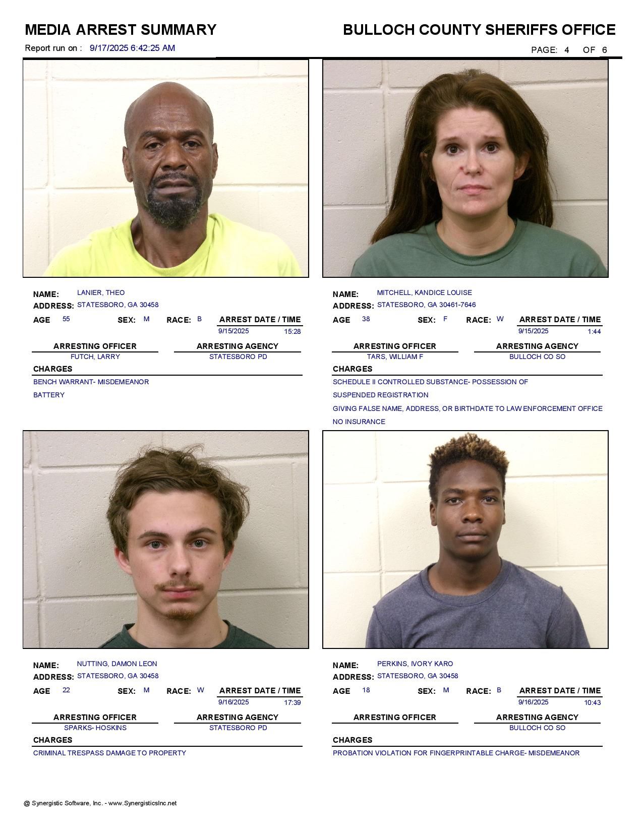 The Bulloch Co Jail Booking & Incident Report 09/17/25 details arrests from Bulloch Co., Statesboro, Brooklet, Portal, Register, and the Georgia State Patrol. Incident reports are from the Sheriff’s Office only.