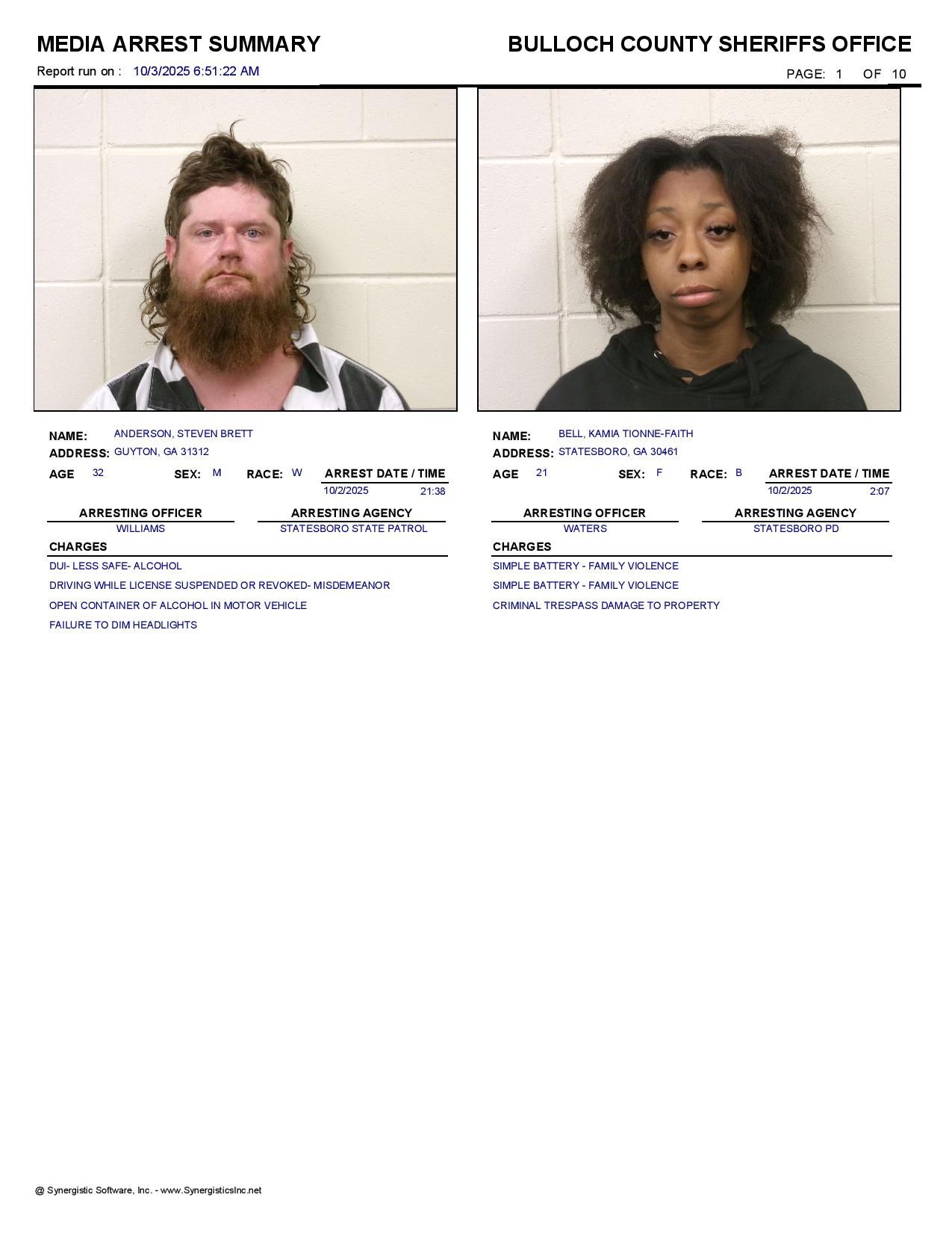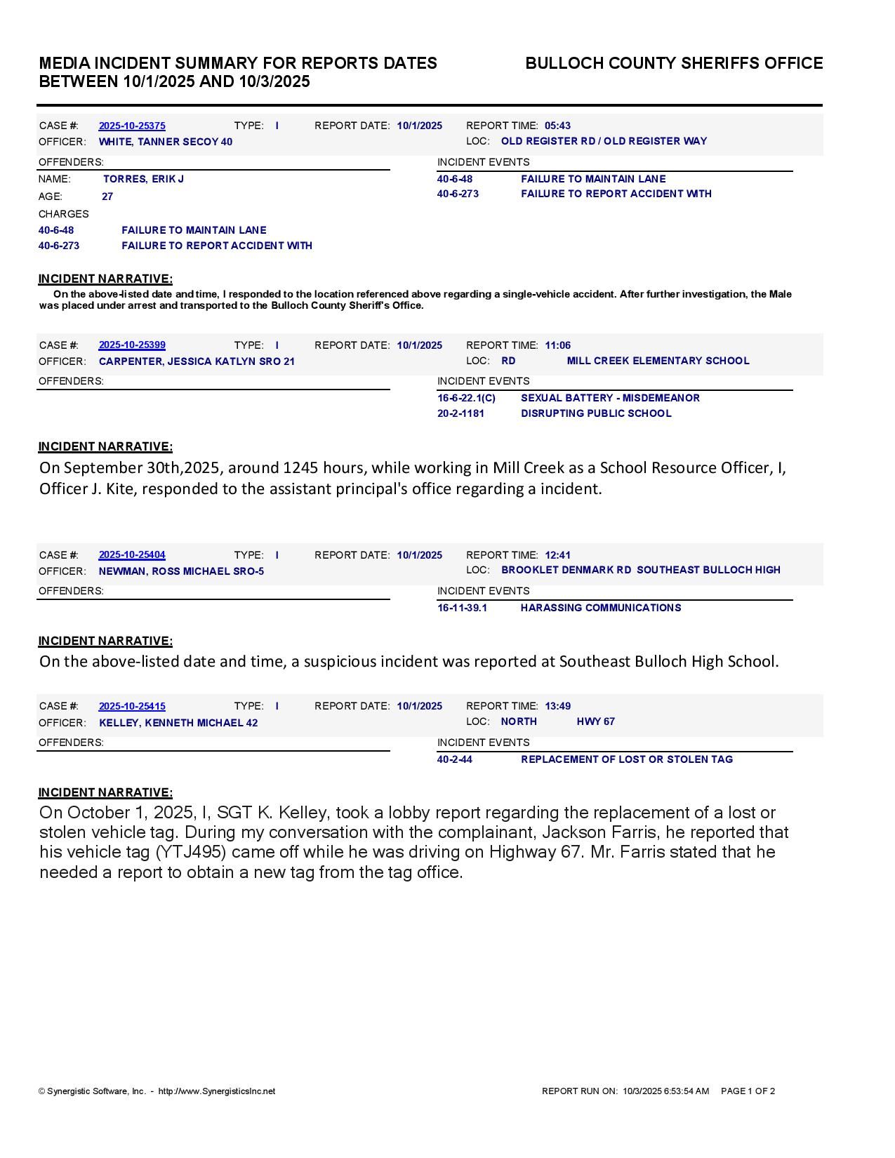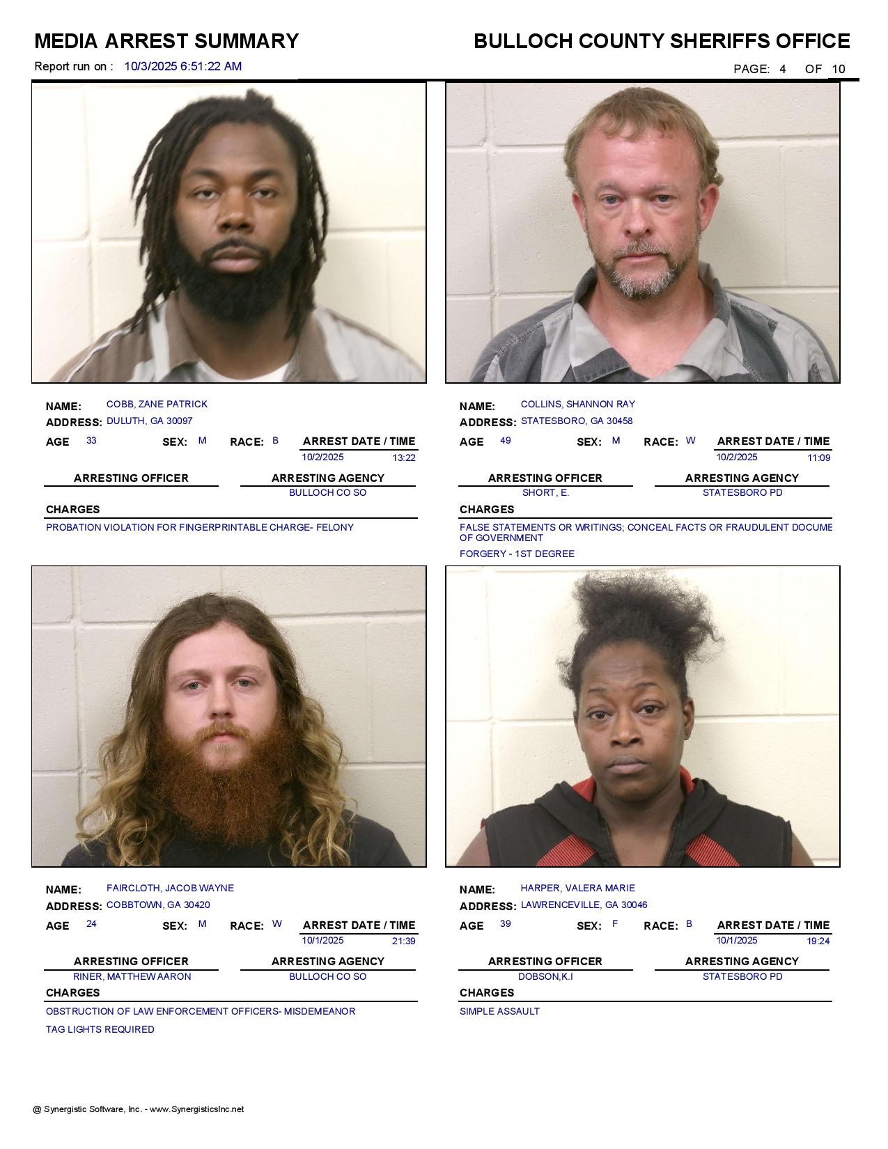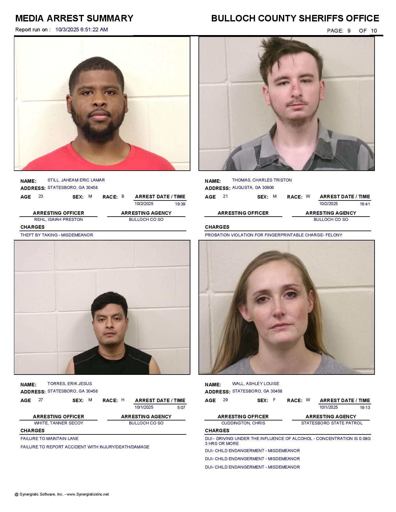 The Bulloch Co Jail Booking & Incident Report 10/03/25 details arrests from Bulloch Co., Statesboro, Brooklet, Portal, Register, and the Georgia State Patrol. Incident reports are from the Sheriff’s Office only.