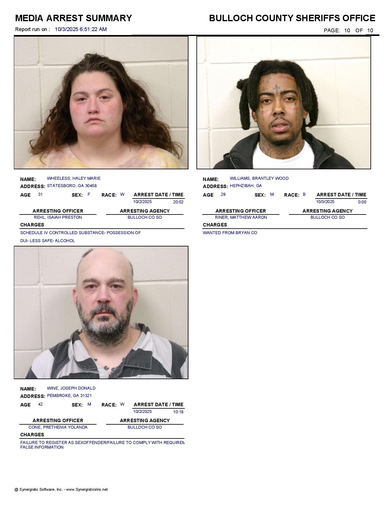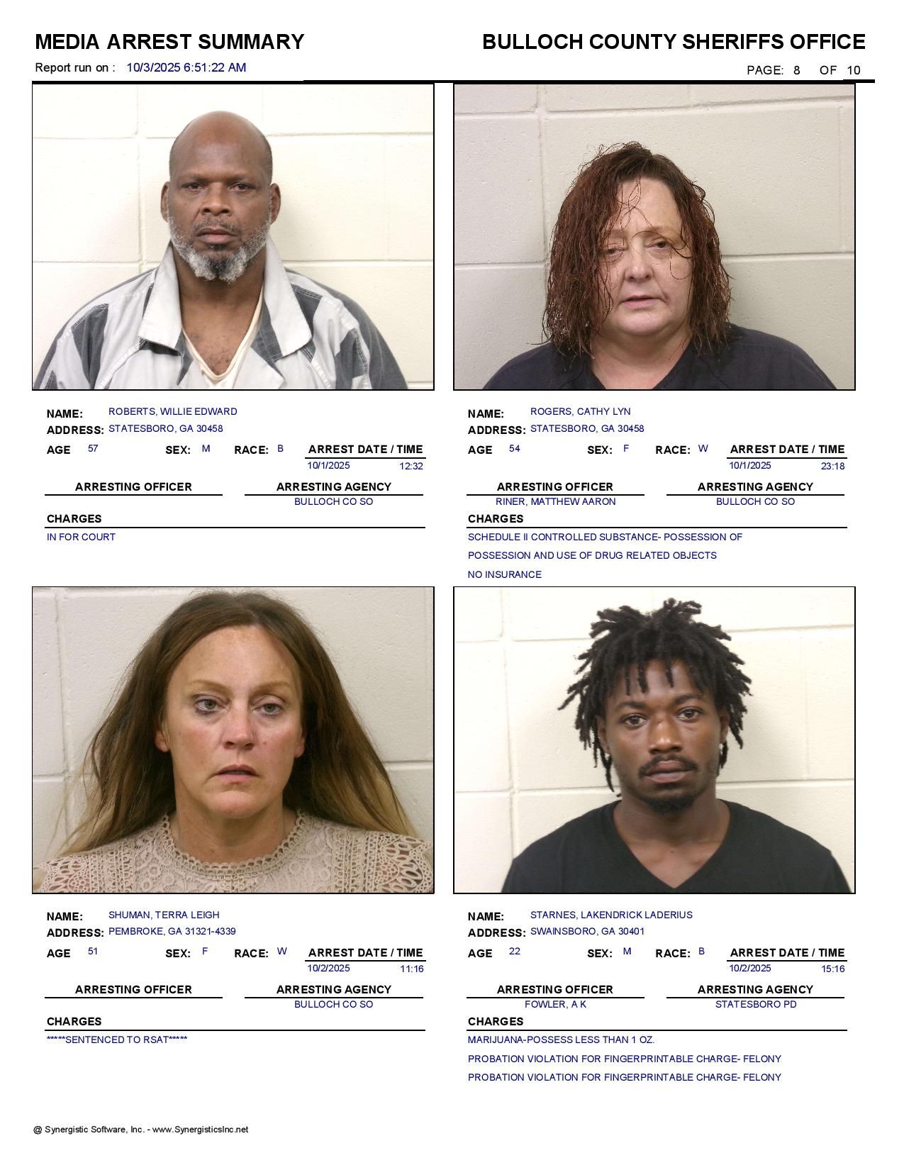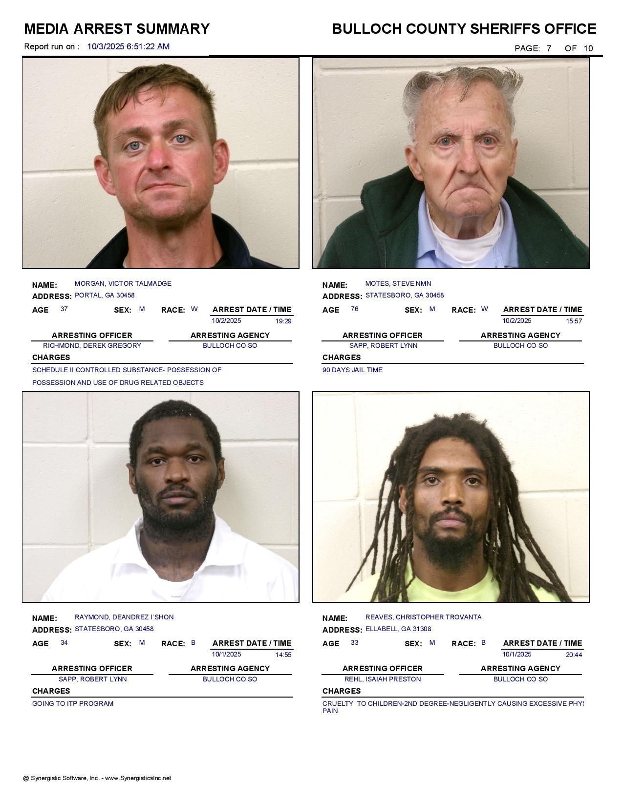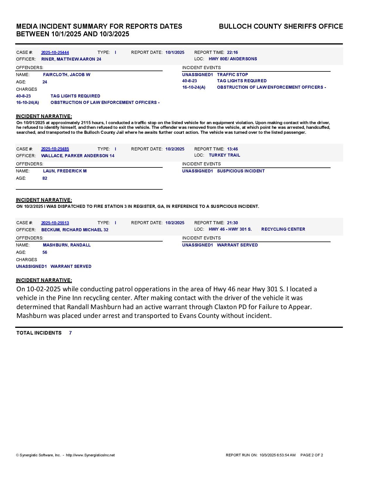 The Bulloch Co Jail Booking & Incident Report 10/03/25 details arrests from Bulloch Co., Statesboro, Brooklet, Portal, Register, and the Georgia State Patrol. Incident reports are from the Sheriff’s Office only.