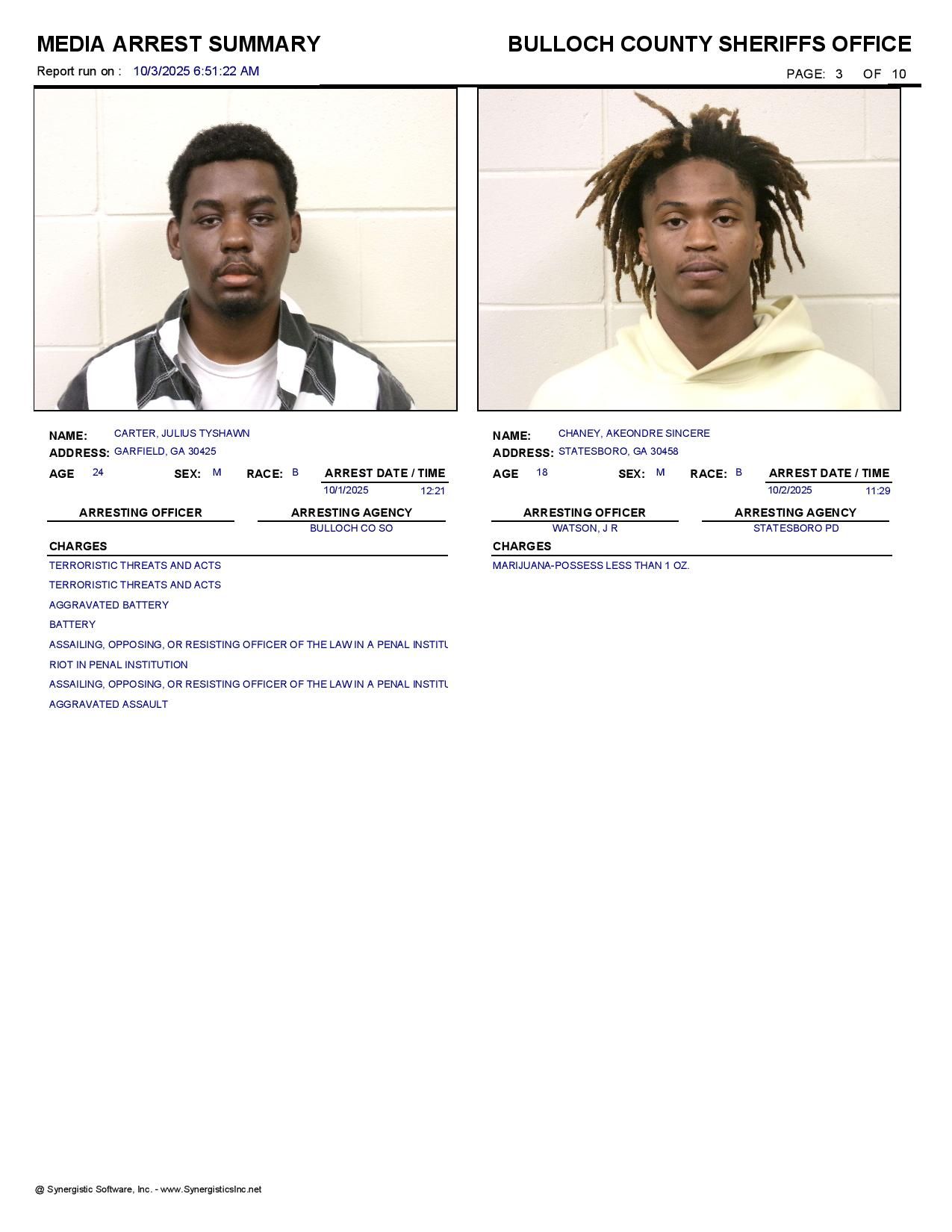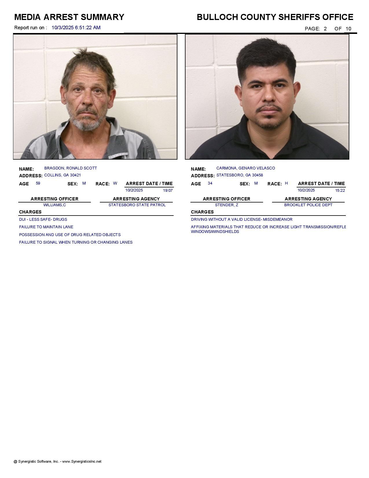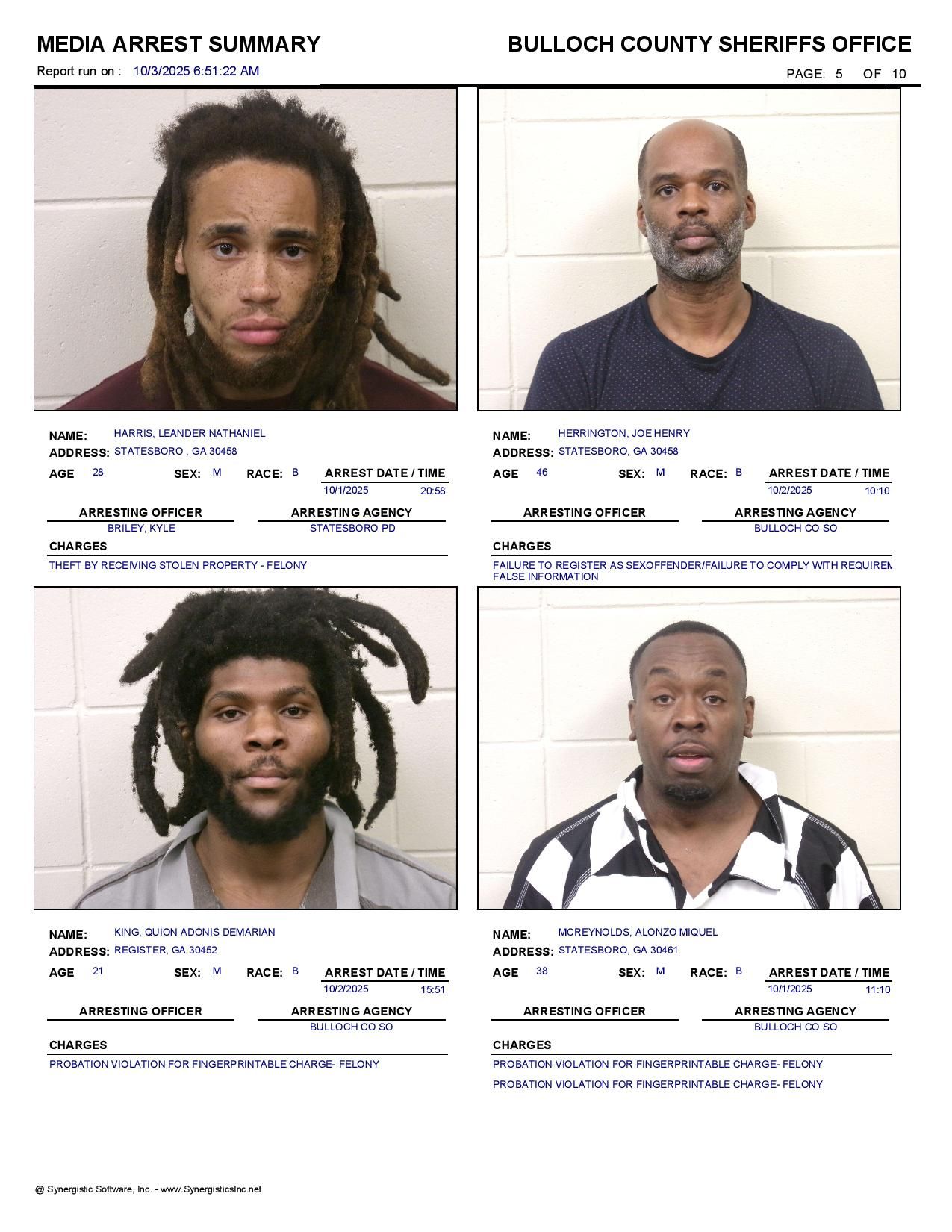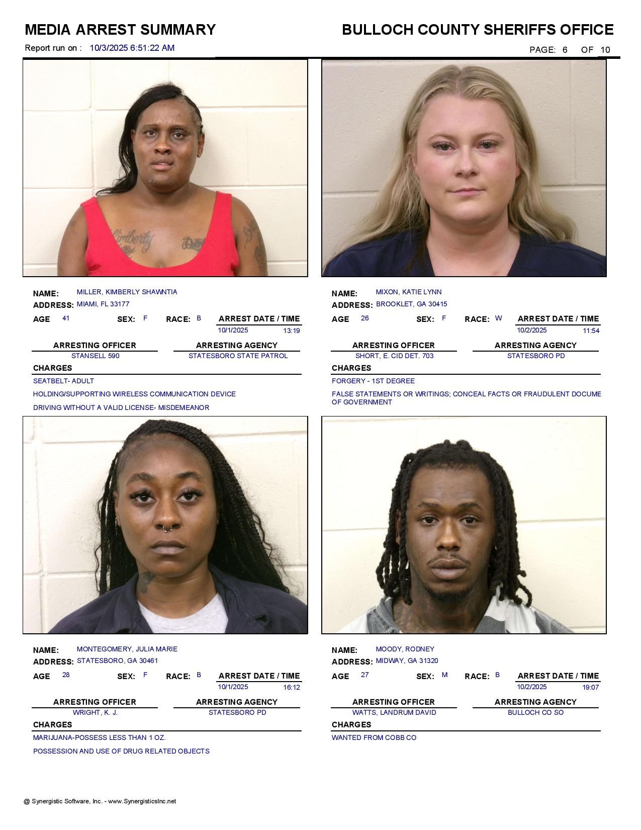 The Bulloch Co Jail Booking & Incident Report 10/03/25 details arrests from Bulloch Co., Statesboro, Brooklet, Portal, Register, and the Georgia State Patrol. Incident reports are from the Sheriff’s Office only.