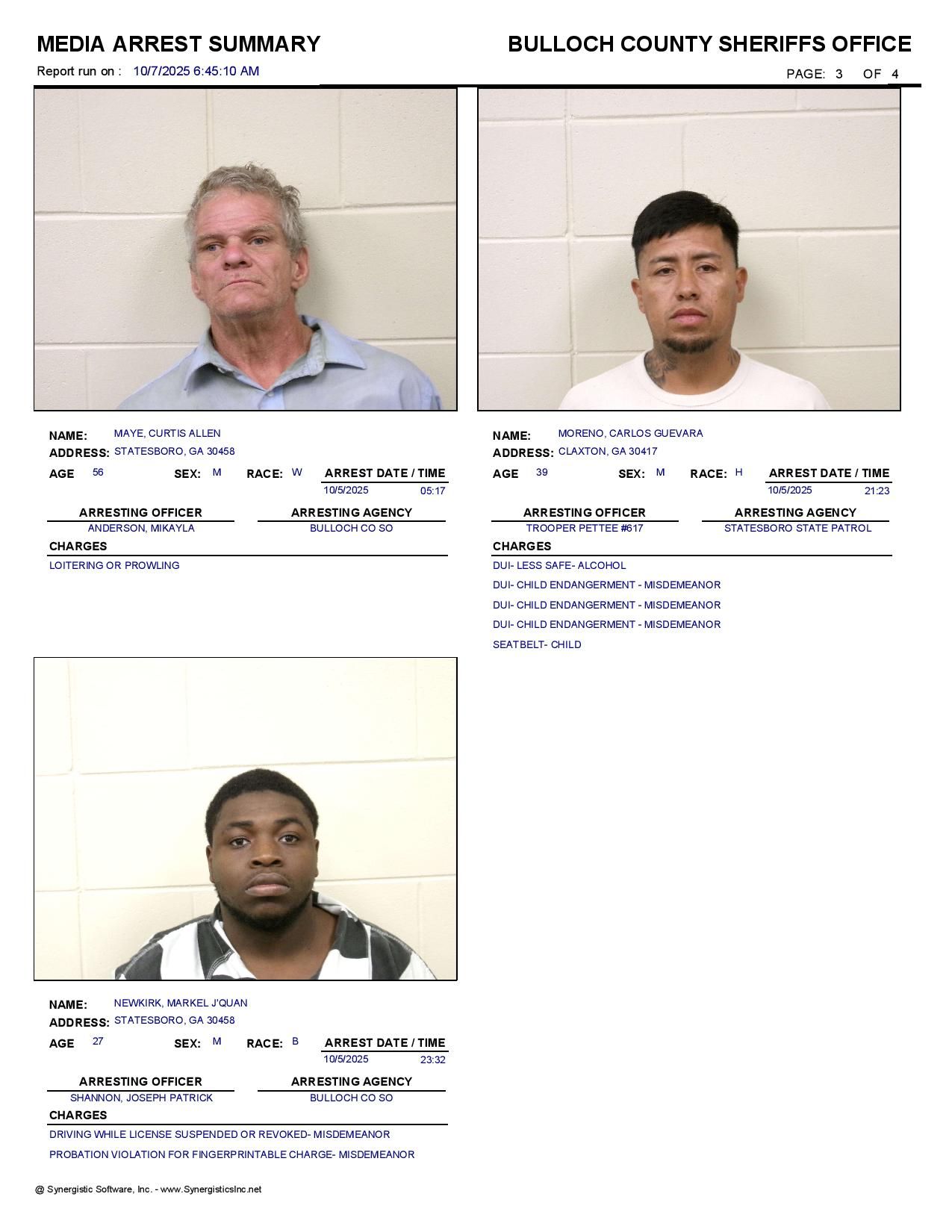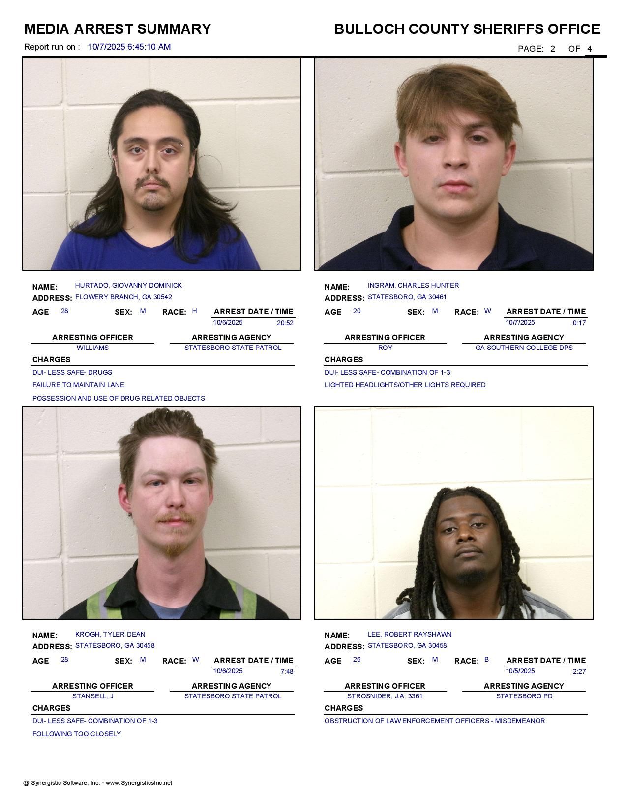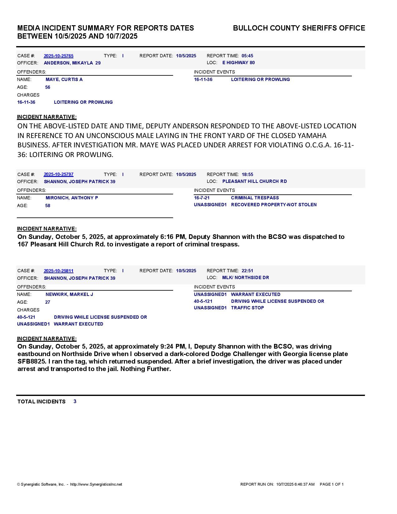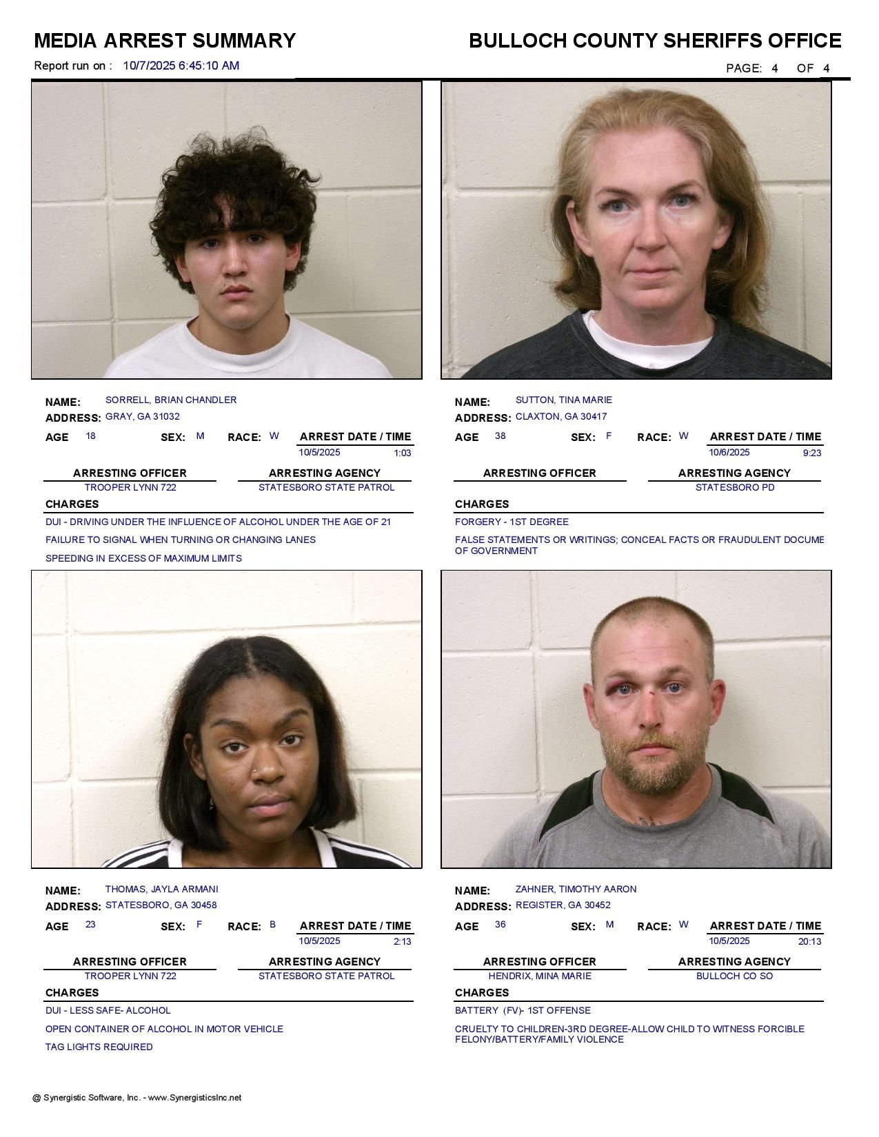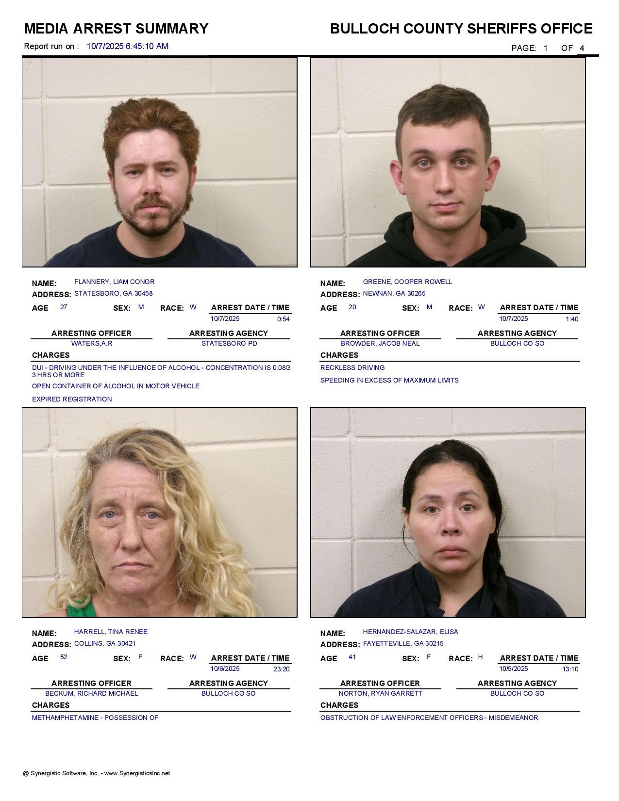 The Bulloch Co Jail Booking & Incident Report 10/07/25 details arrests from Bulloch Co., Statesboro, Brooklet, Portal, Register, and the Georgia State Patrol. Incident reports are from the Sheriff’s Office only.