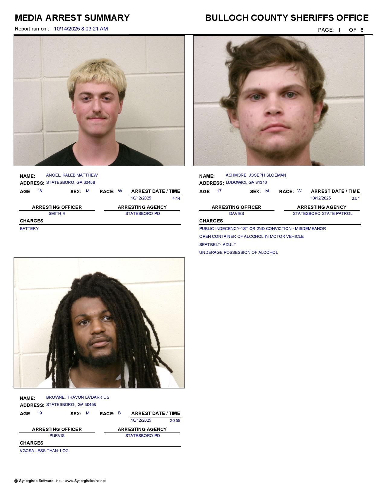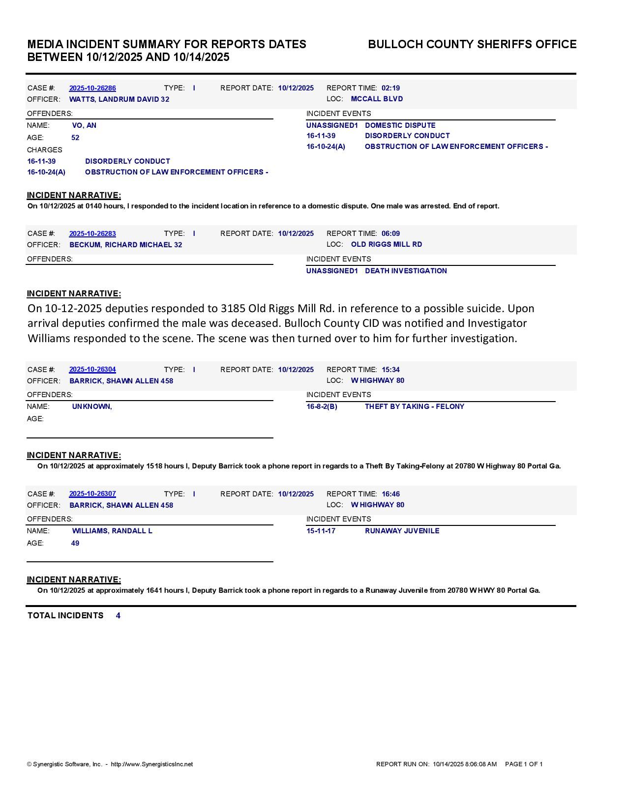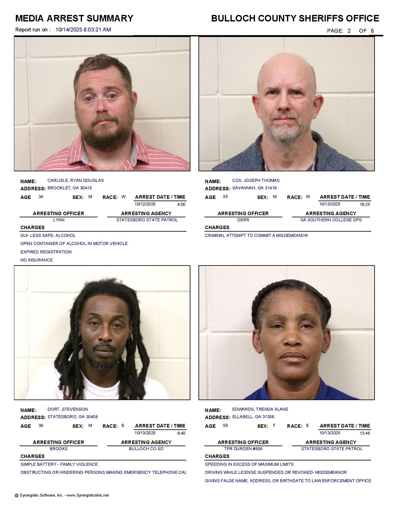 The Bulloch Co Jail Booking & Incident Report 10/14/25 details arrests from Bulloch Co., Statesboro, Brooklet, Portal, Register, and the Georgia State Patrol. Incident reports are from the Sheriff’s Office only.