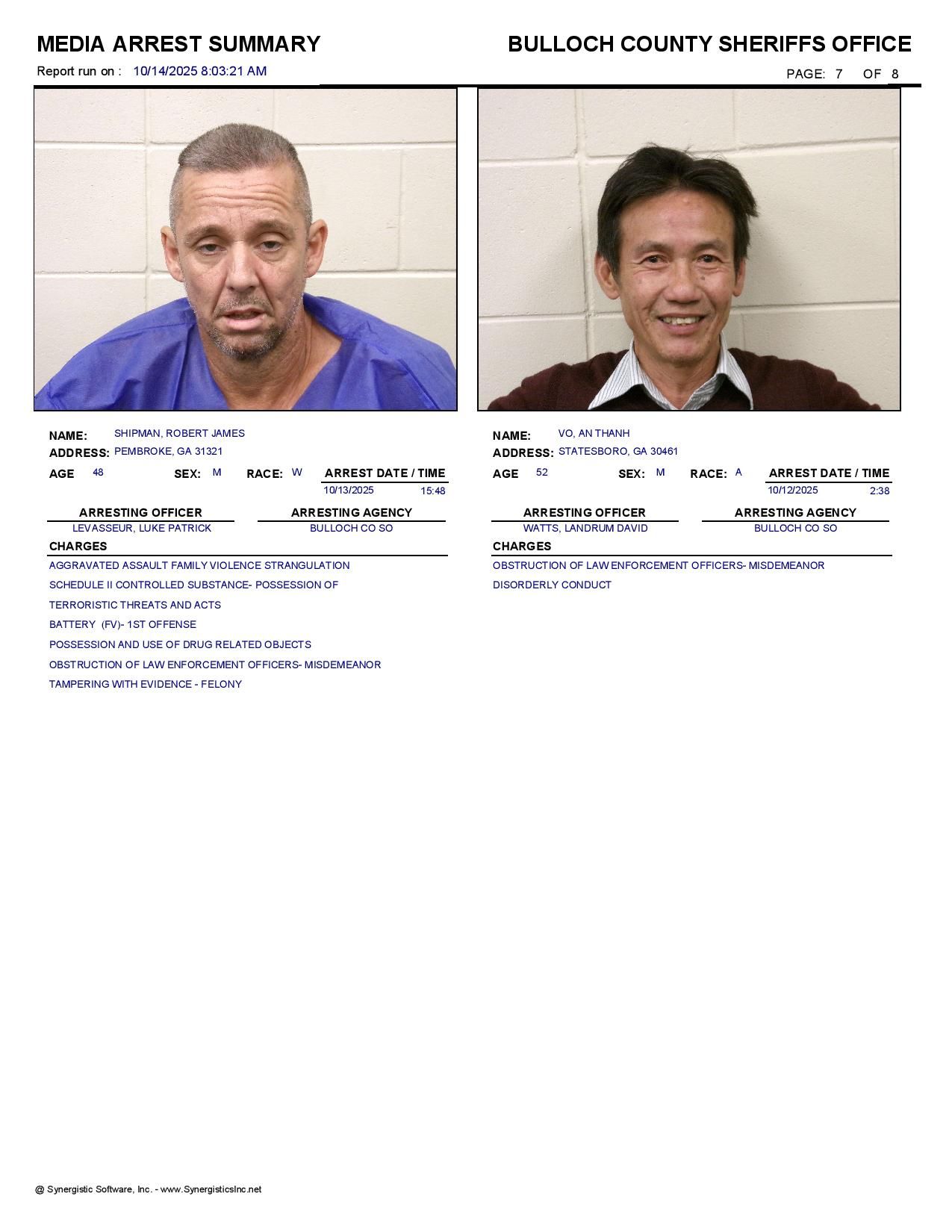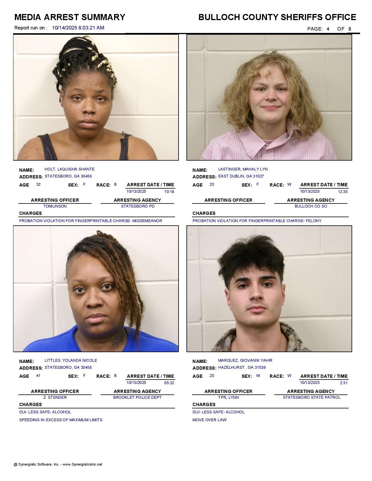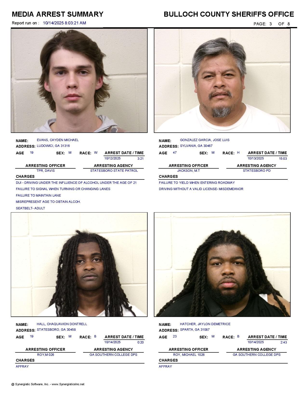 The Bulloch Co Jail Booking & Incident Report 10/14/25 details arrests from Bulloch Co., Statesboro, Brooklet, Portal, Register, and the Georgia State Patrol. Incident reports are from the Sheriff’s Office only.