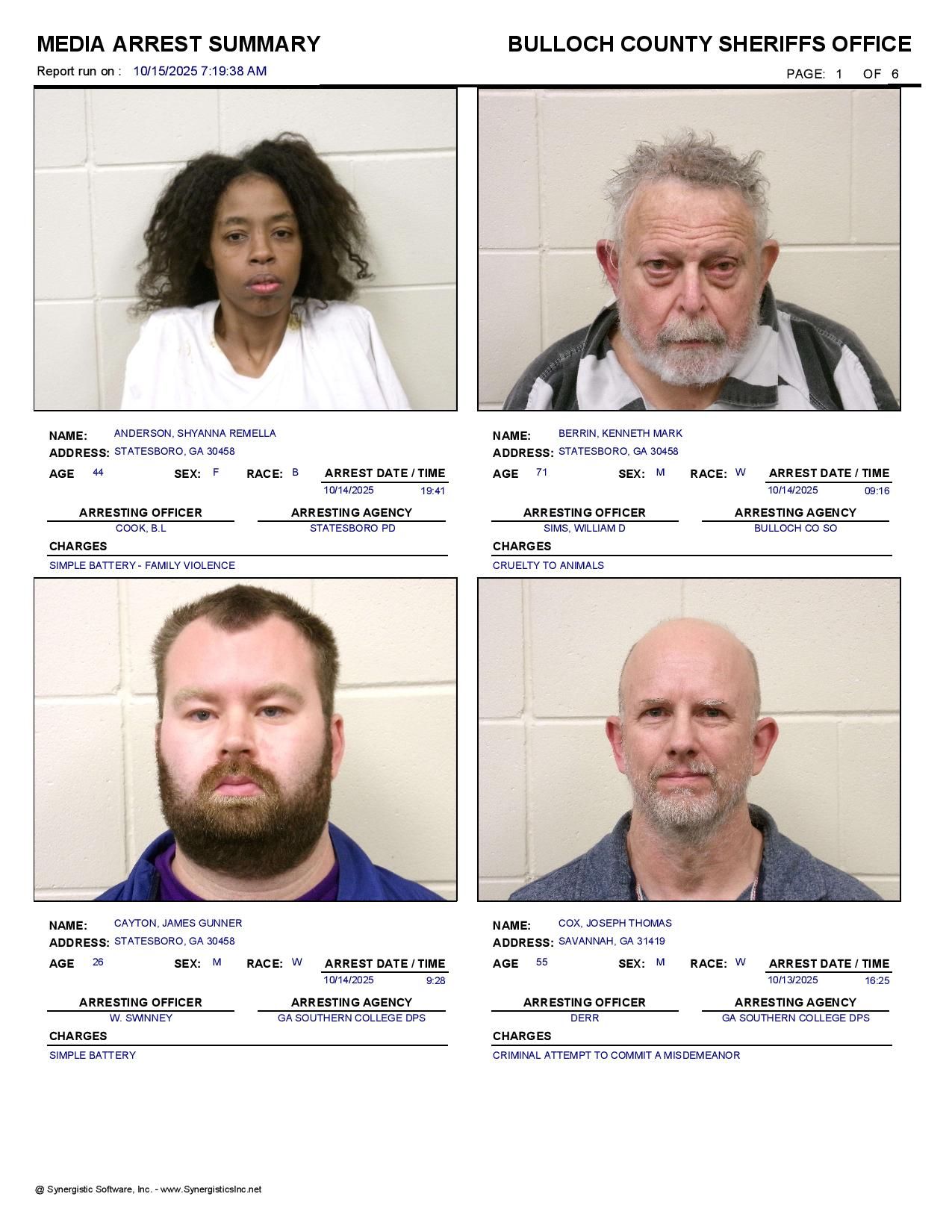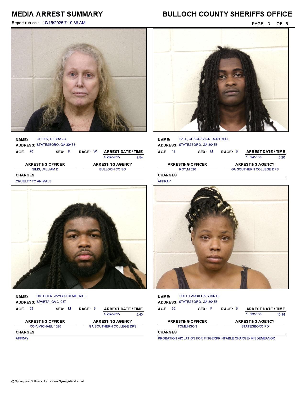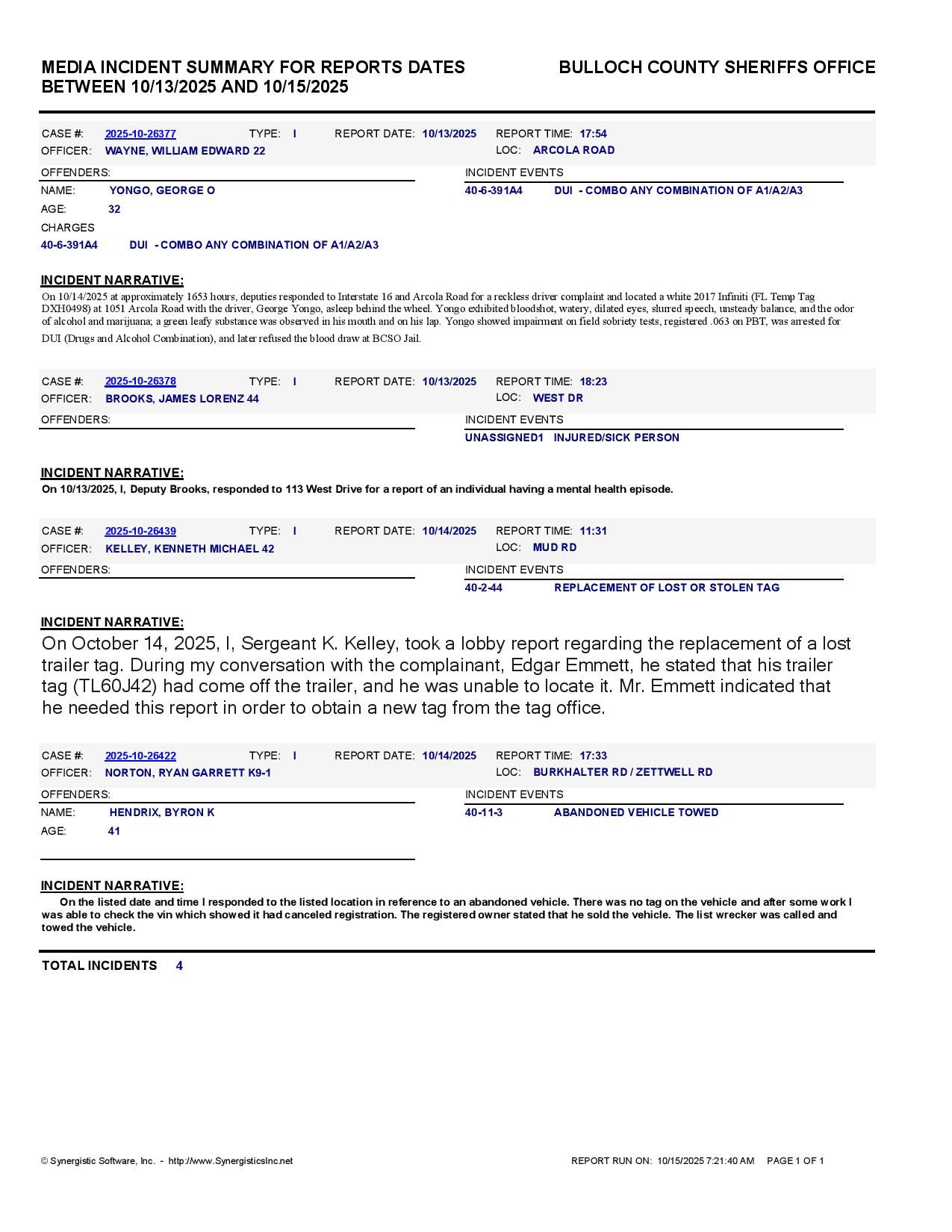 The Bulloch Co Jail Booking & Incident Report 10/15/25 details arrests from Bulloch Co., Statesboro, Brooklet, Portal, Register, and the Georgia State Patrol. Incident reports are from the Sheriff’s Office only.