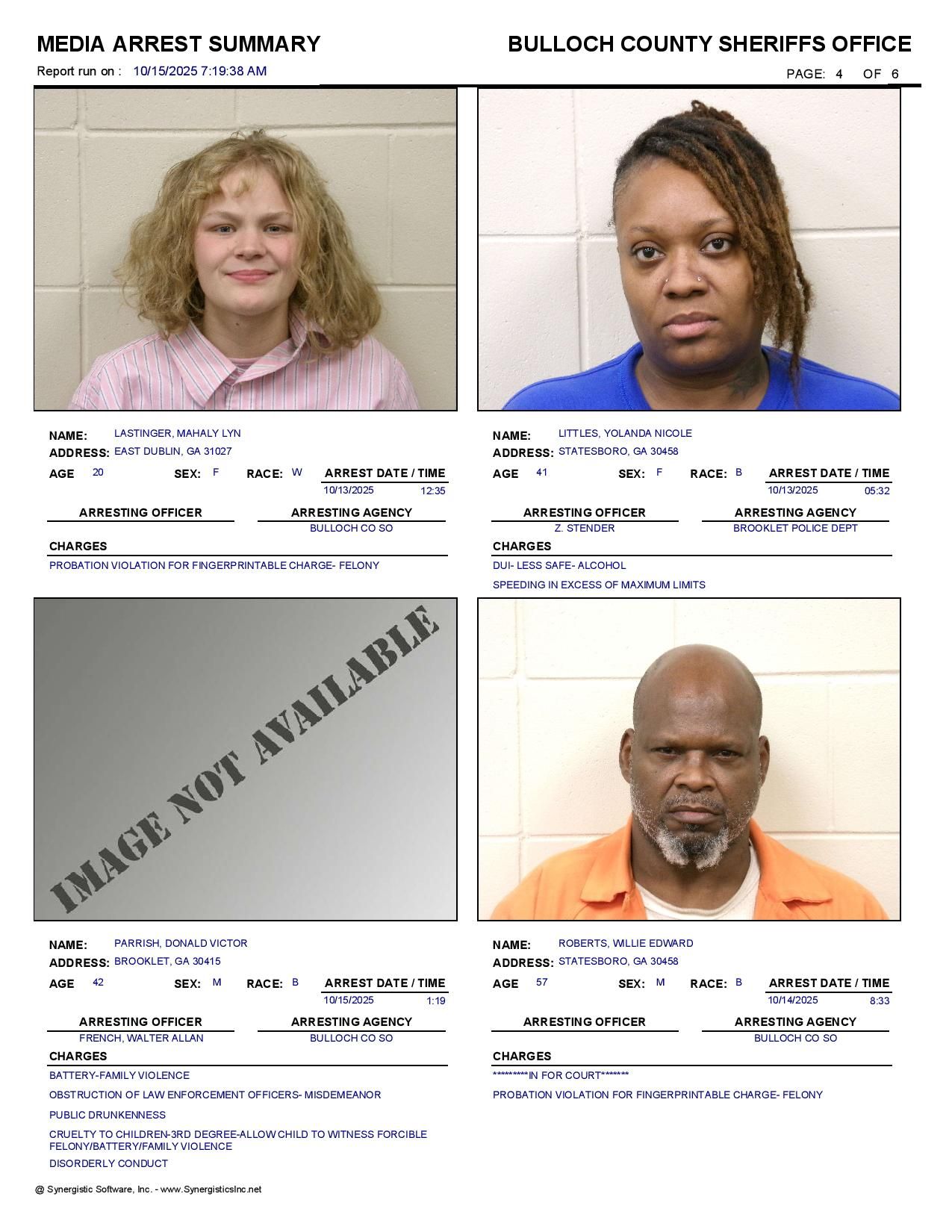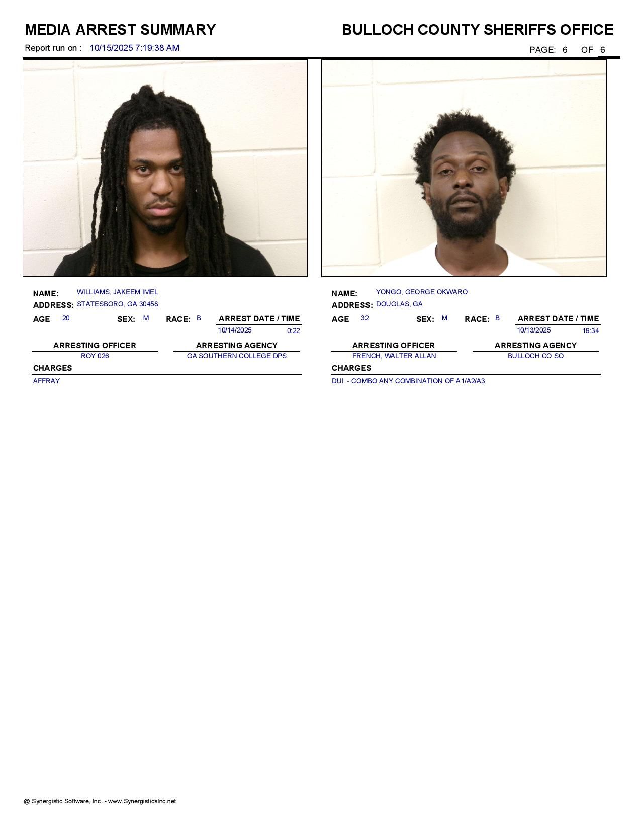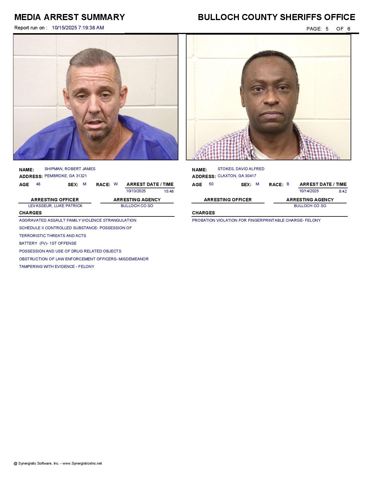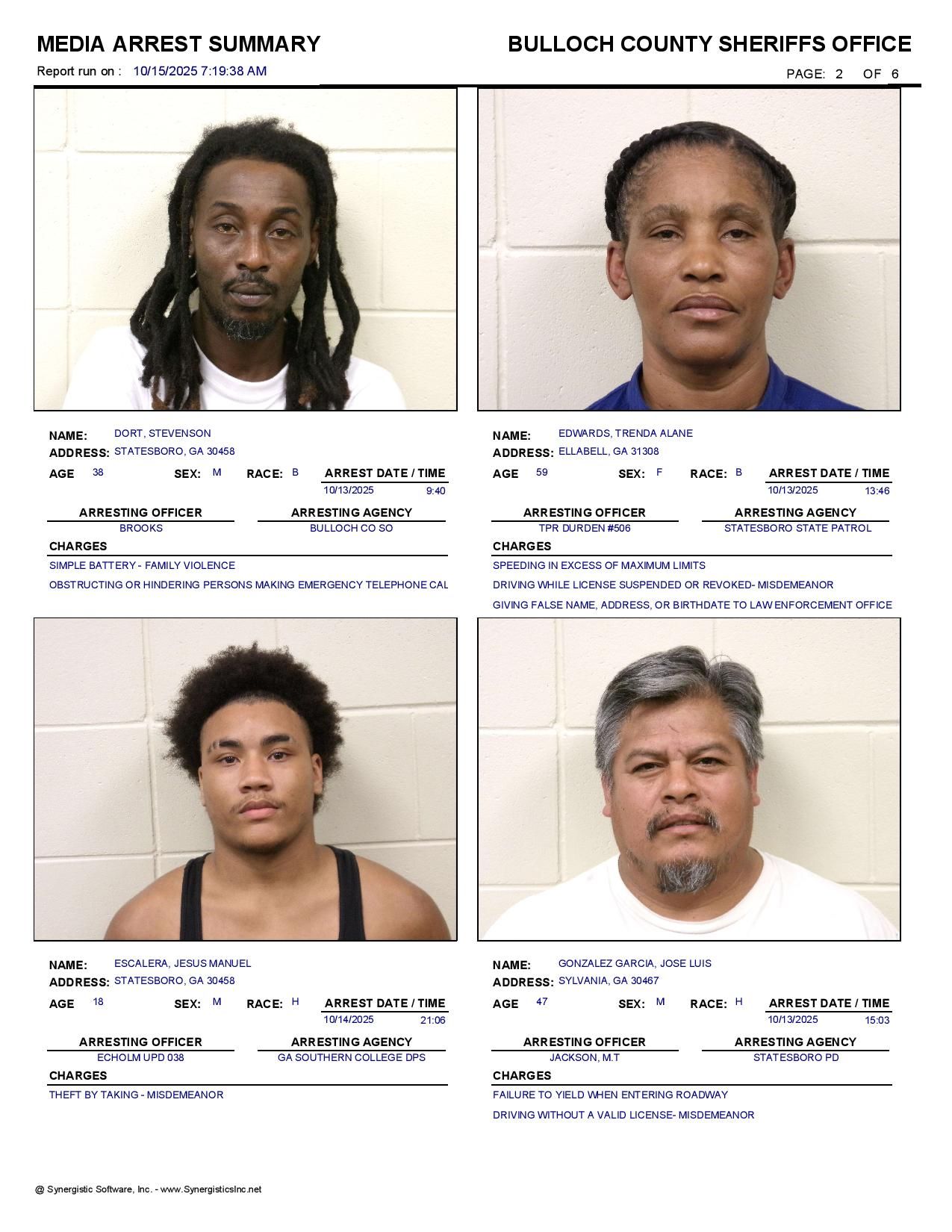 The Bulloch Co Jail Booking & Incident Report 10/15/25 details arrests from Bulloch Co., Statesboro, Brooklet, Portal, Register, and the Georgia State Patrol. Incident reports are from the Sheriff’s Office only.