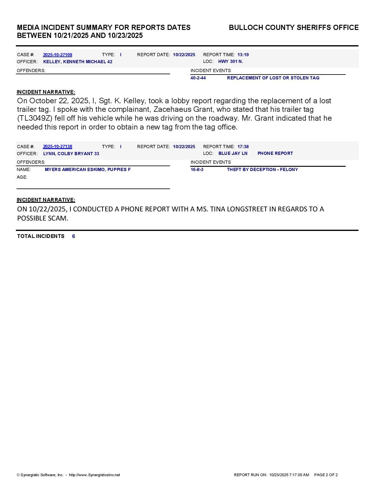 The Bulloch Co Jail Booking & Incident Report 10/23/25 details arrests from Bulloch Co., Statesboro, Brooklet, Portal, Register, and the Georgia State Patrol. Incident reports are from the Sheriff’s Office only.