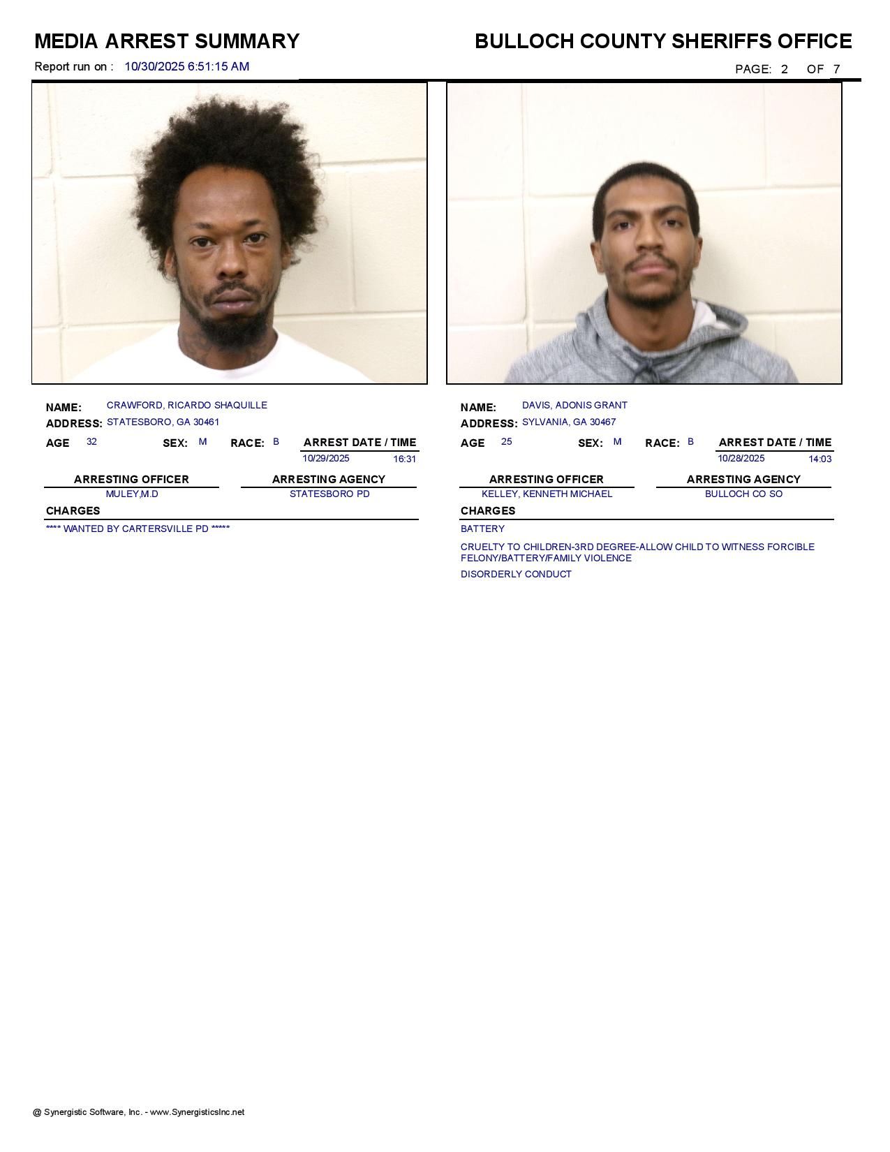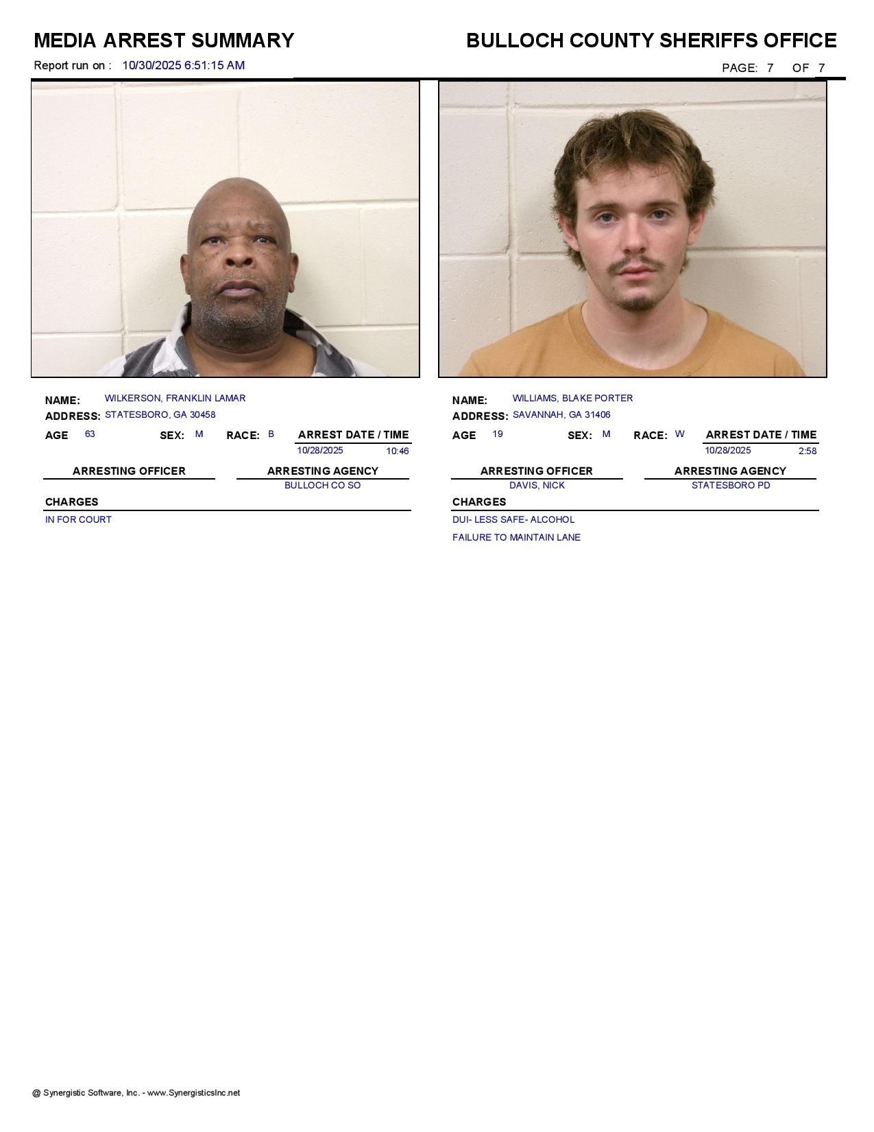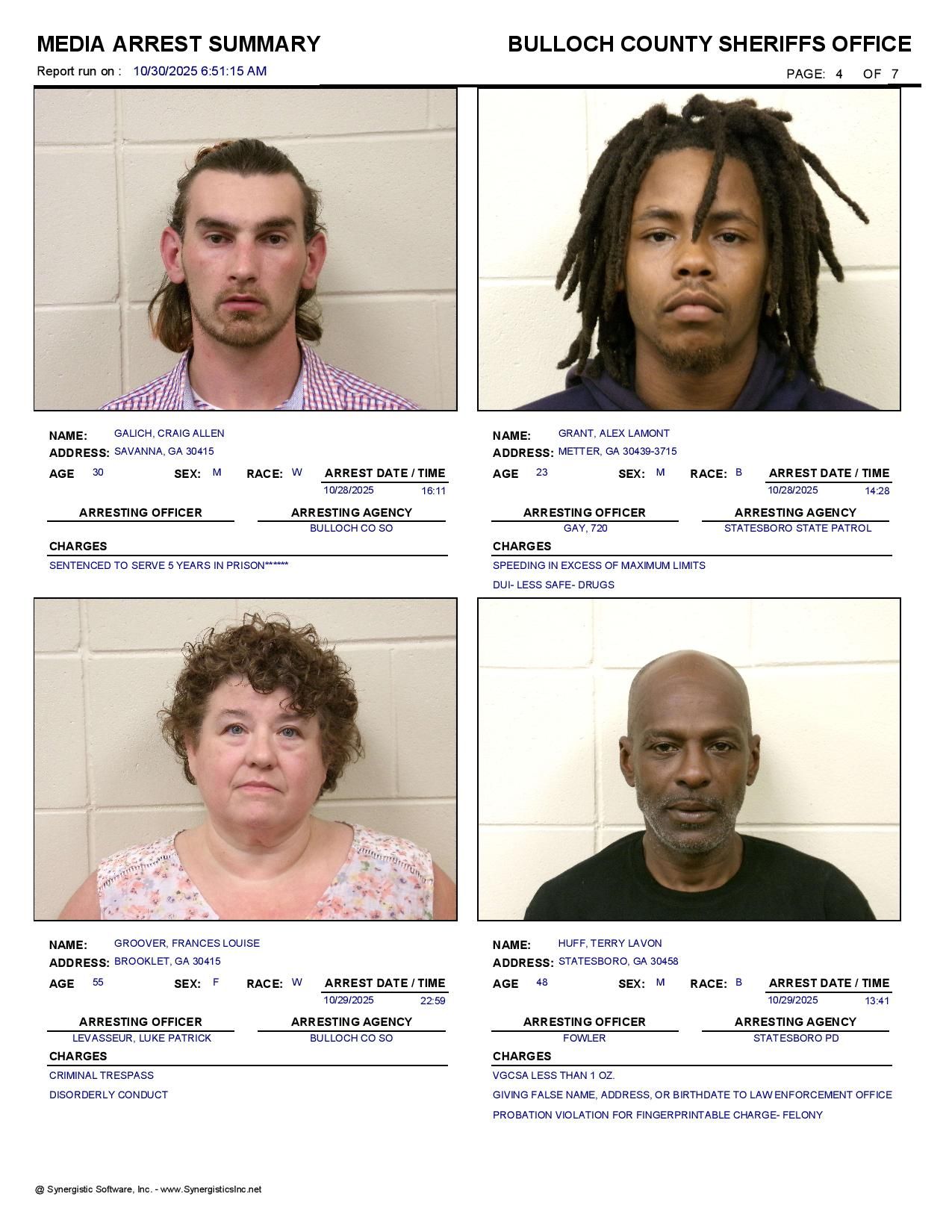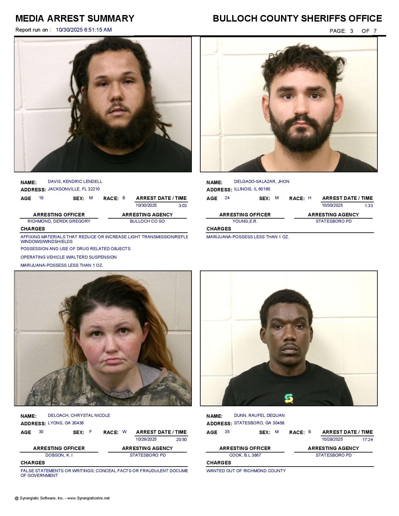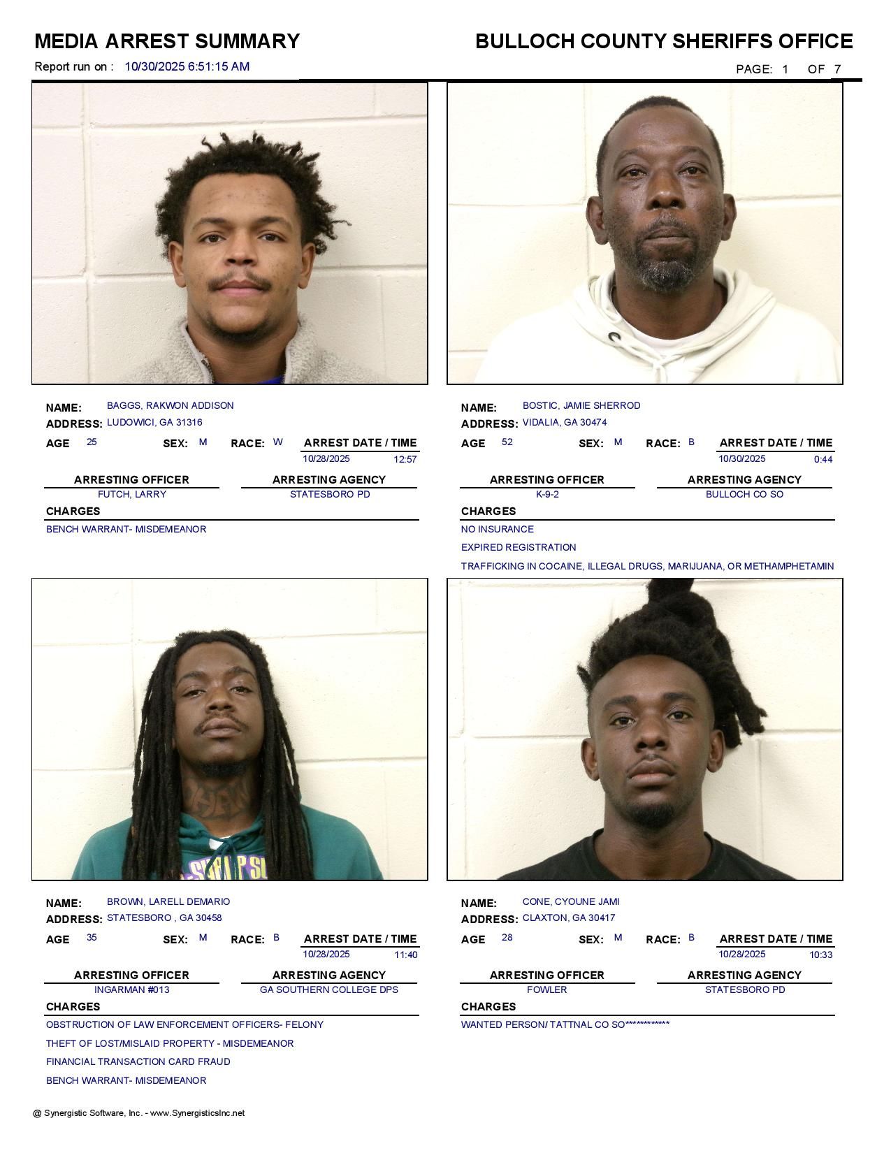 The Bulloch Co Jail Booking & Incident Report 10/30/25 details arrests from Bulloch Co., Statesboro, Brooklet, Portal, Register, and the Georgia State Patrol. Incident reports are from the Sheriff’s Office only.