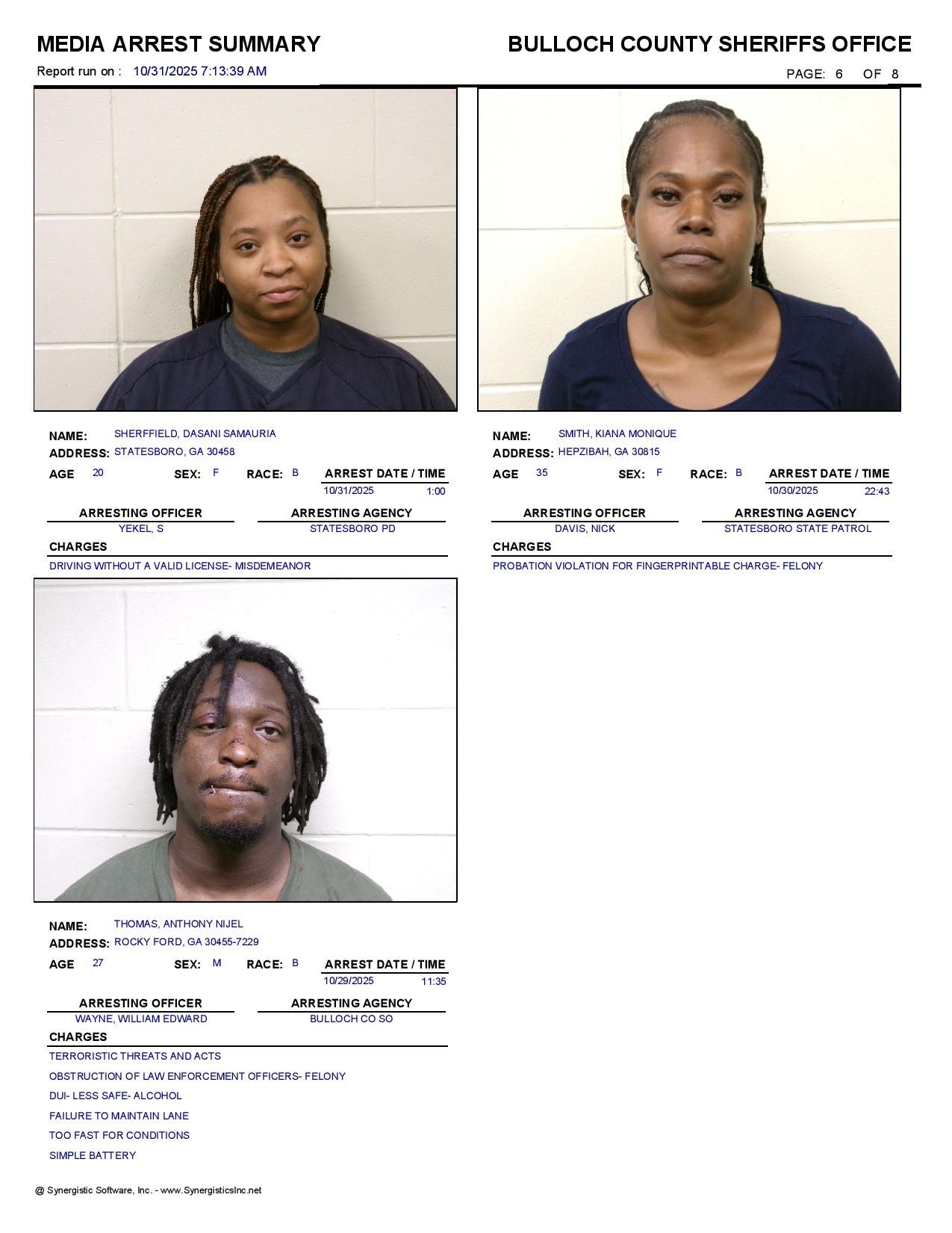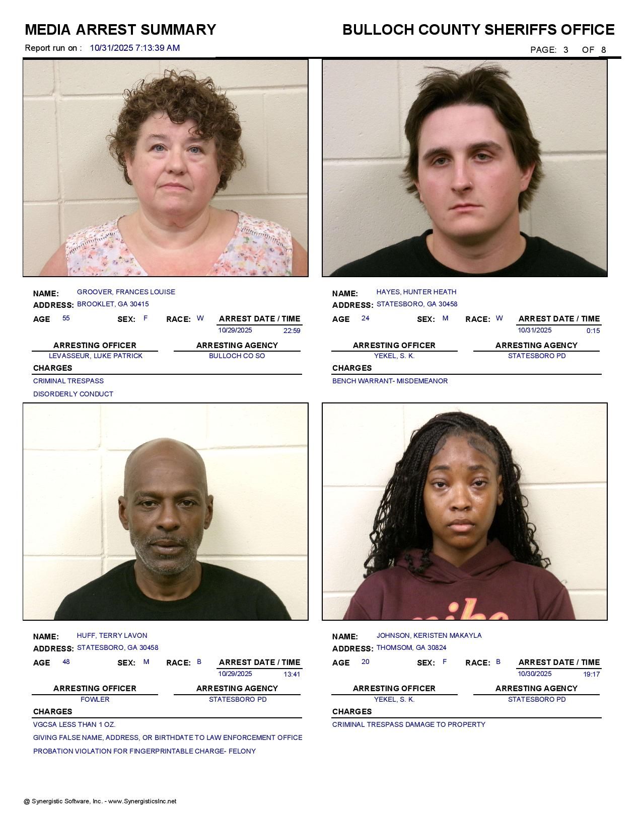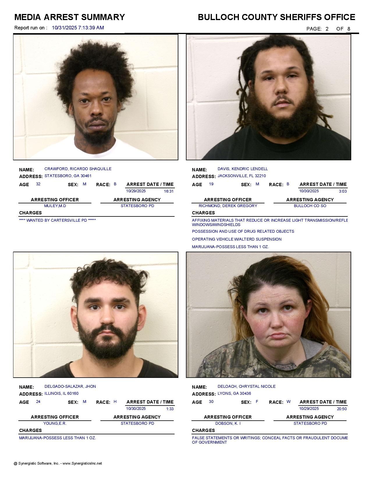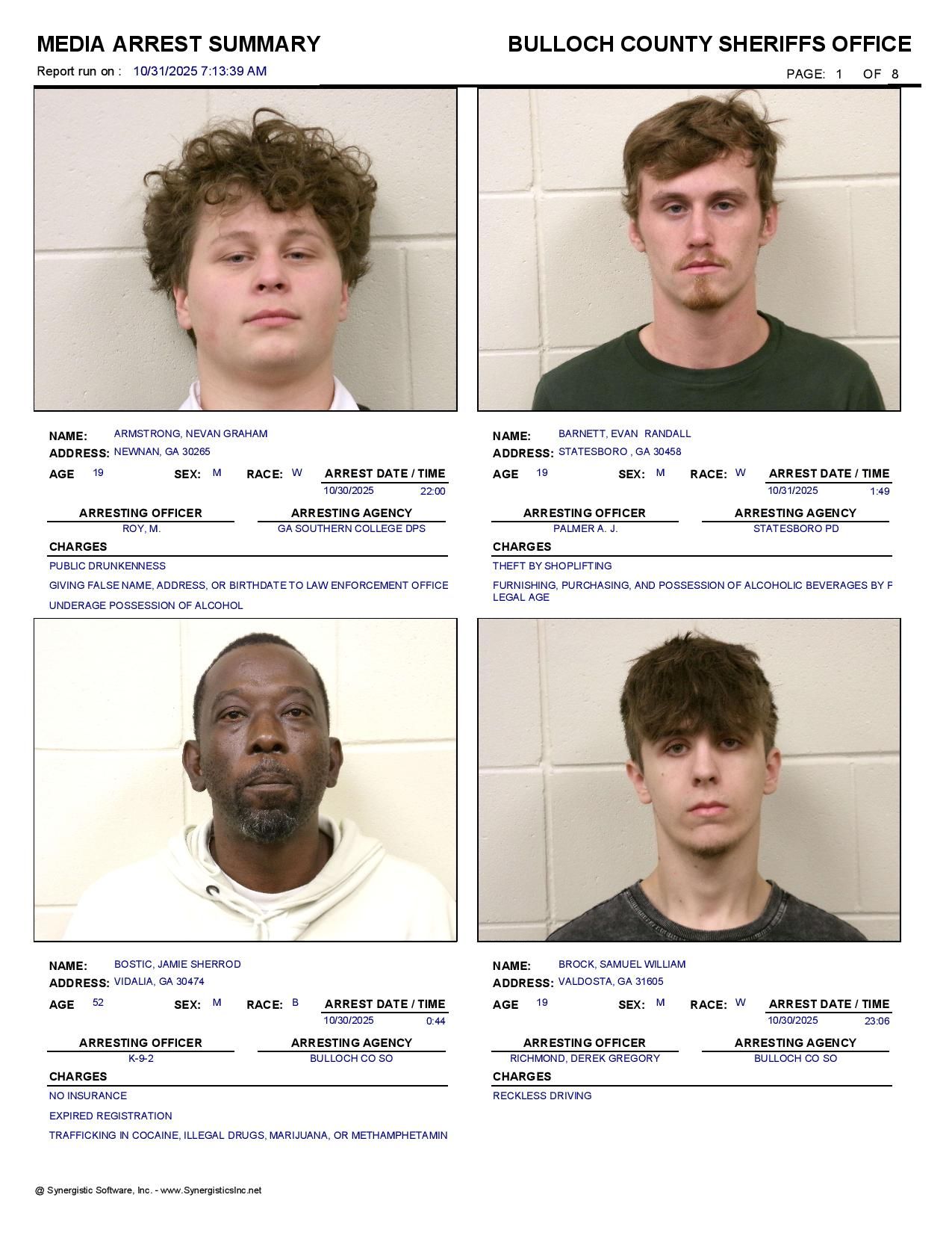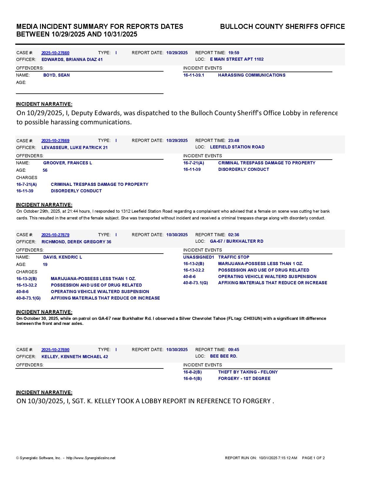 The Bulloch Co Jail Booking & Incident Report 10/31/25 details arrests from Bulloch Co., Statesboro, Brooklet, Portal, Register, and the Georgia State Patrol. Incident reports are from the Sheriff’s Office only.