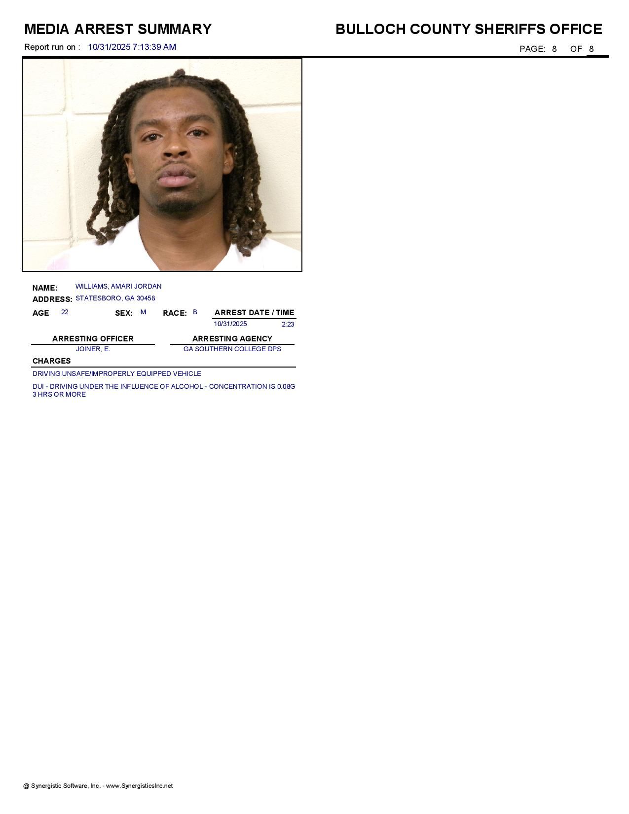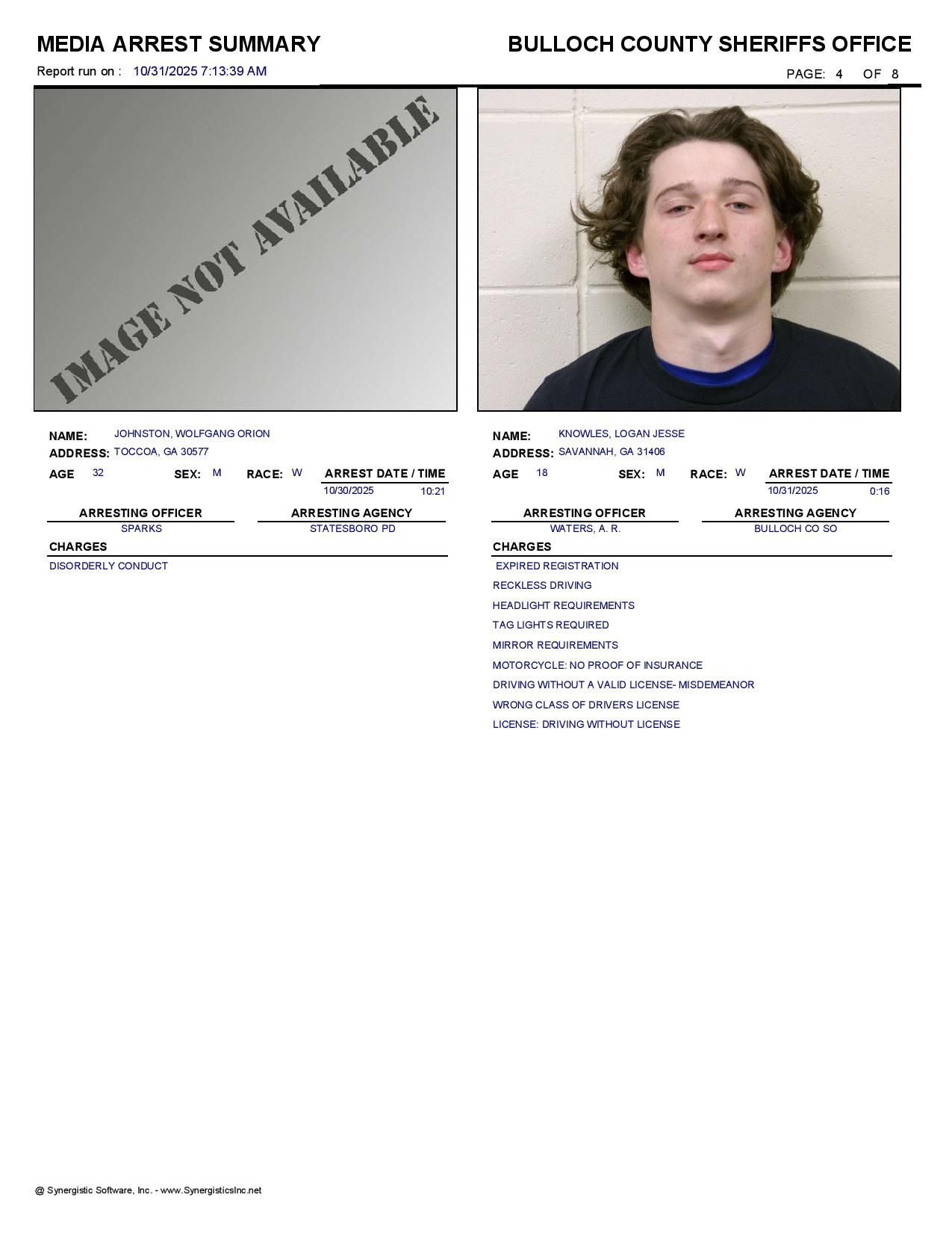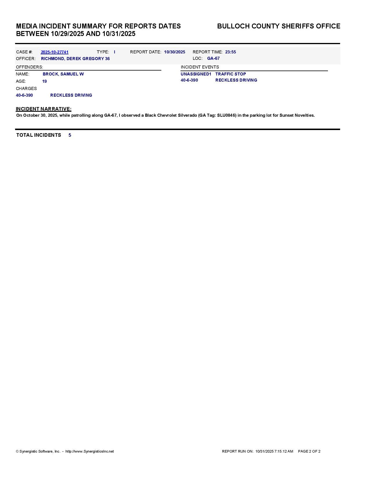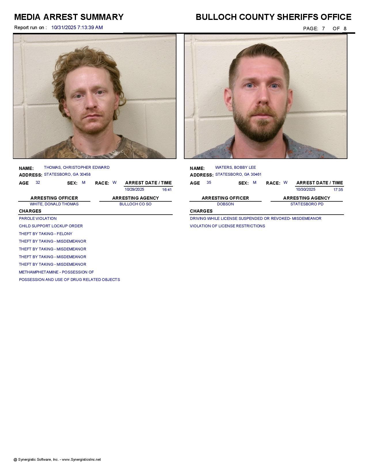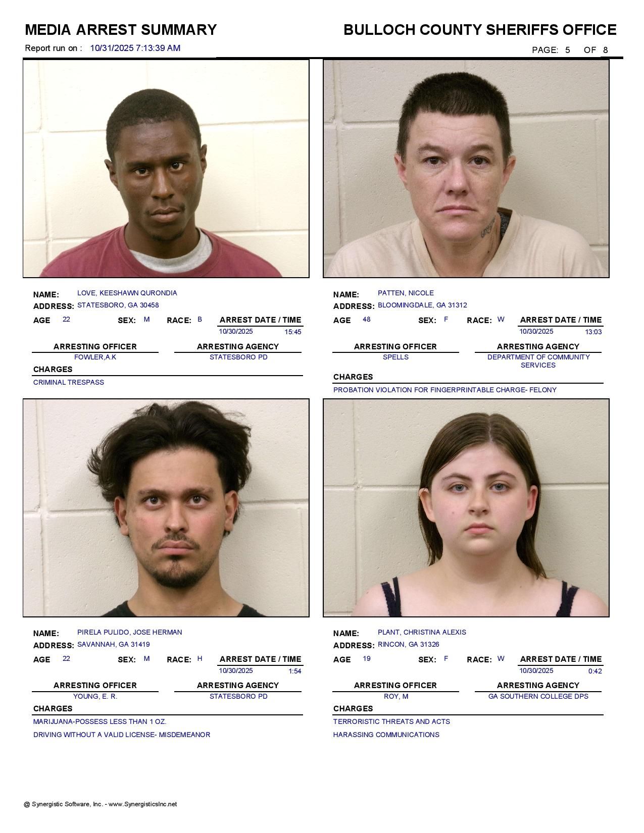 The Bulloch Co Jail Booking & Incident Report 10/31/25 details arrests from Bulloch Co., Statesboro, Brooklet, Portal, Register, and the Georgia State Patrol. Incident reports are from the Sheriff’s Office only.
