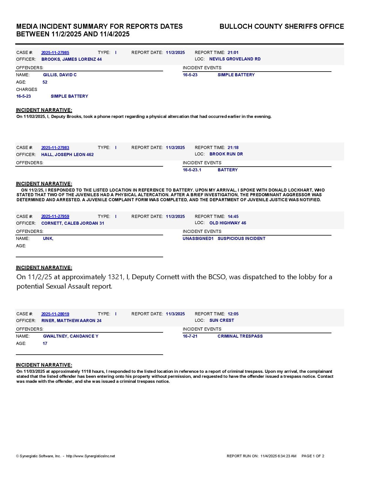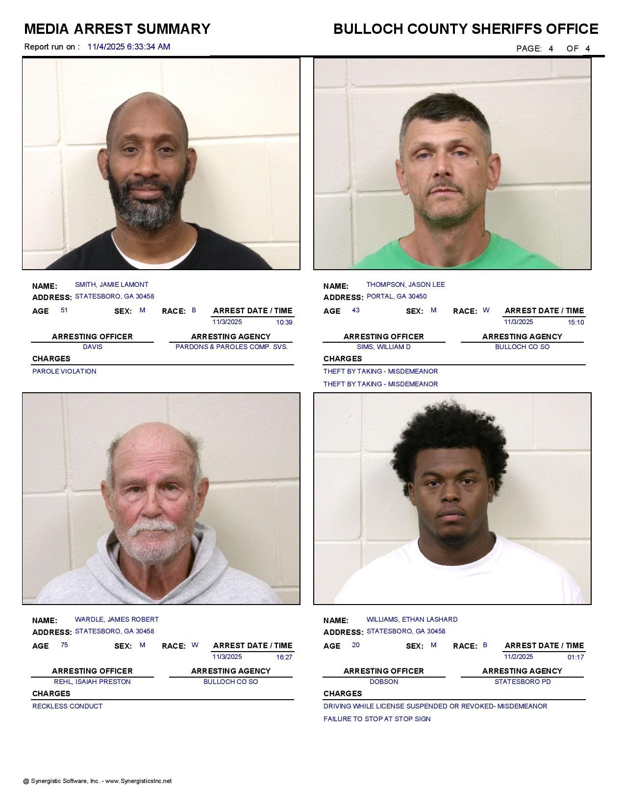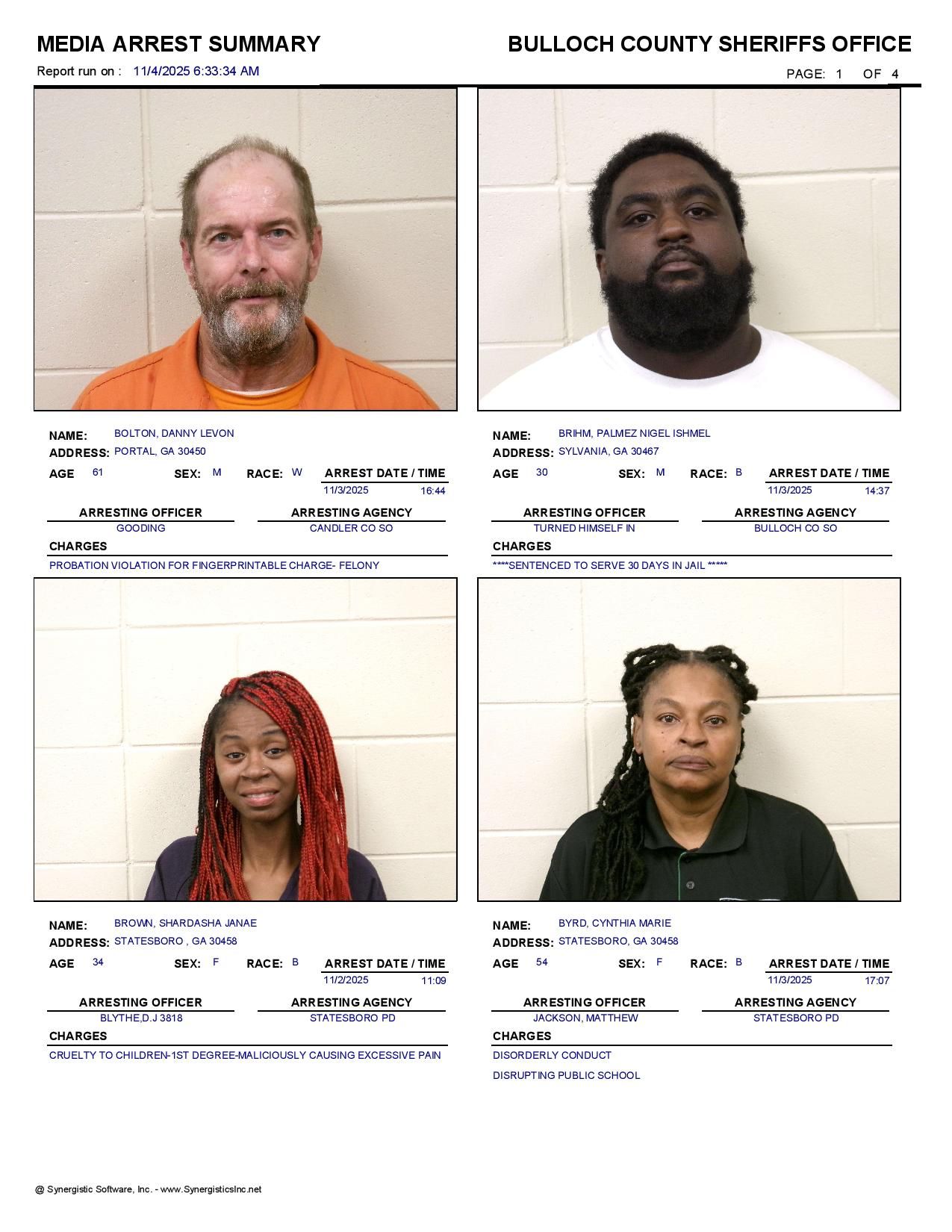 The Bulloch Co Jail Booking & Incident Report 11/04/25 details arrests from Bulloch Co., Statesboro, Brooklet, Portal, Register, and the Georgia State Patrol. Incident reports are from the Sheriff’s Office only.