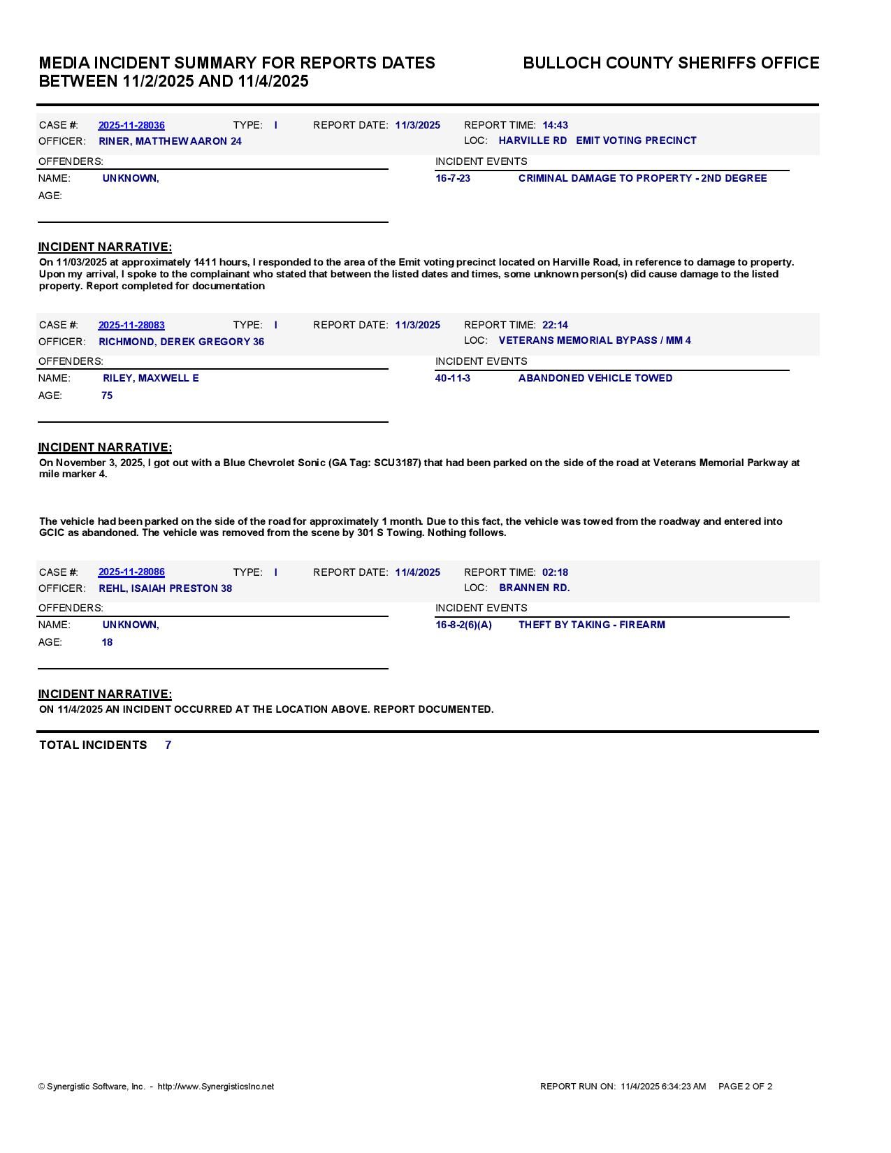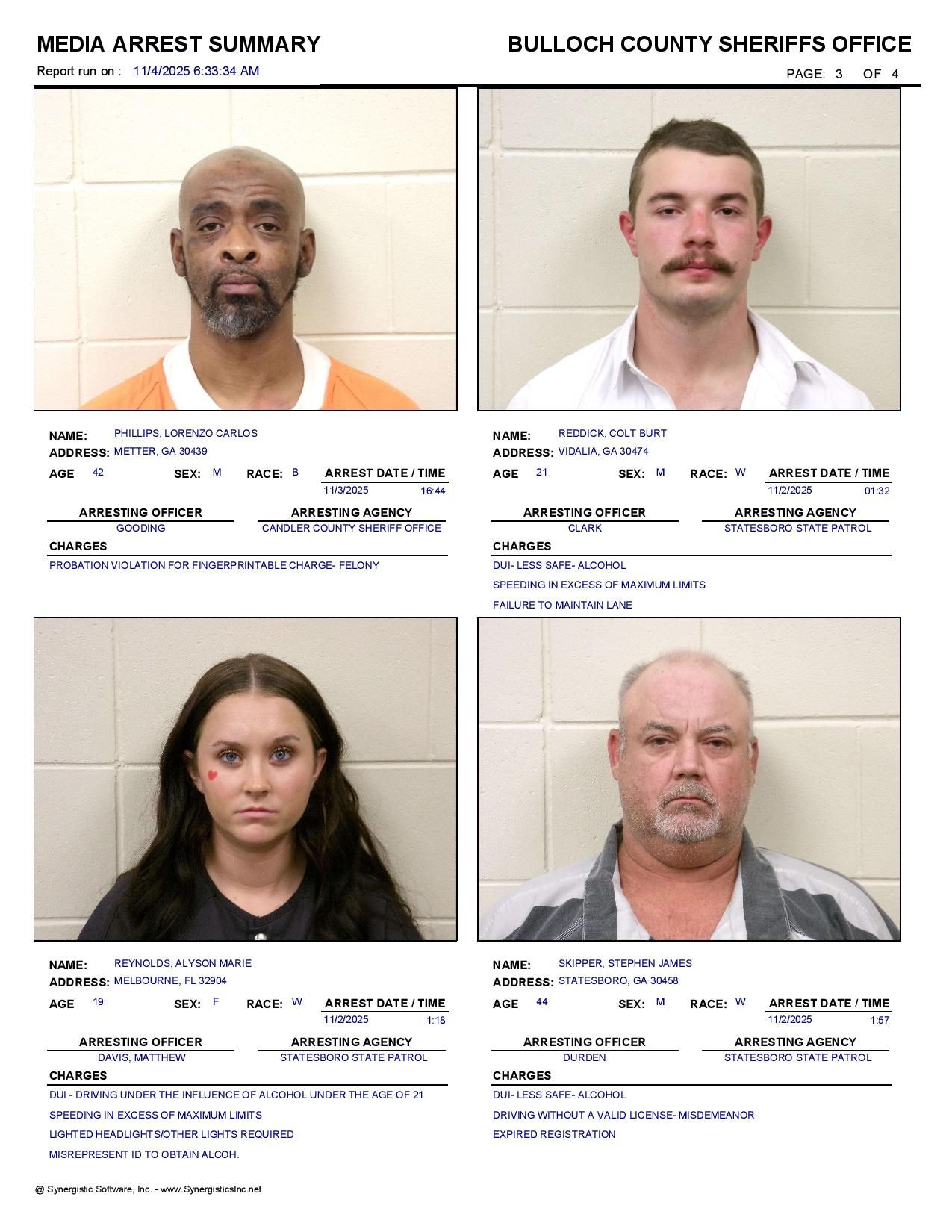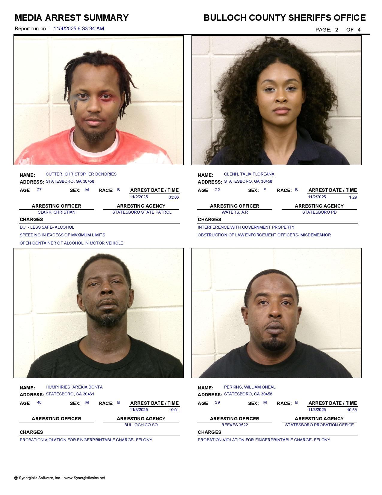 The Bulloch Co Jail Booking & Incident Report 11/04/25 details arrests from Bulloch Co., Statesboro, Brooklet, Portal, Register, and the Georgia State Patrol. Incident reports are from the Sheriff’s Office only.
