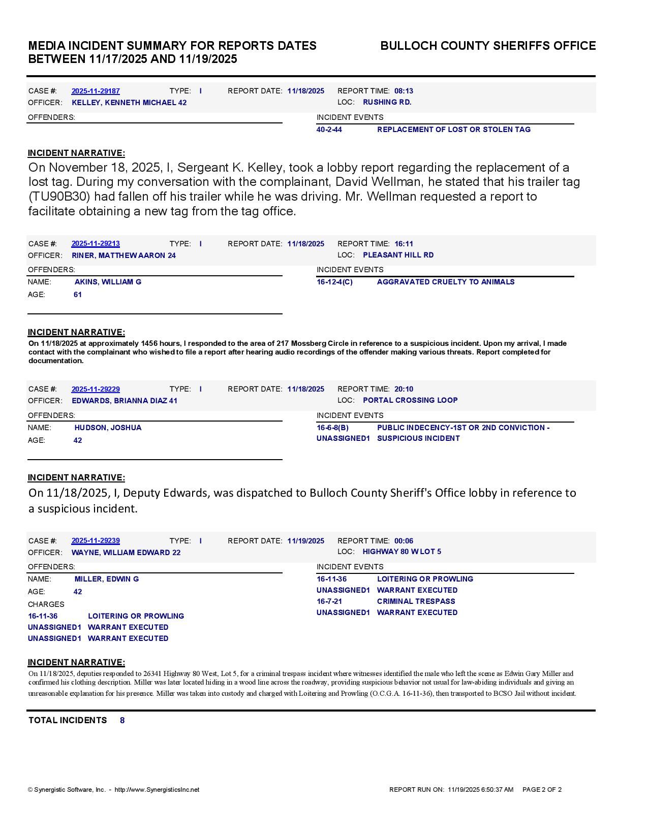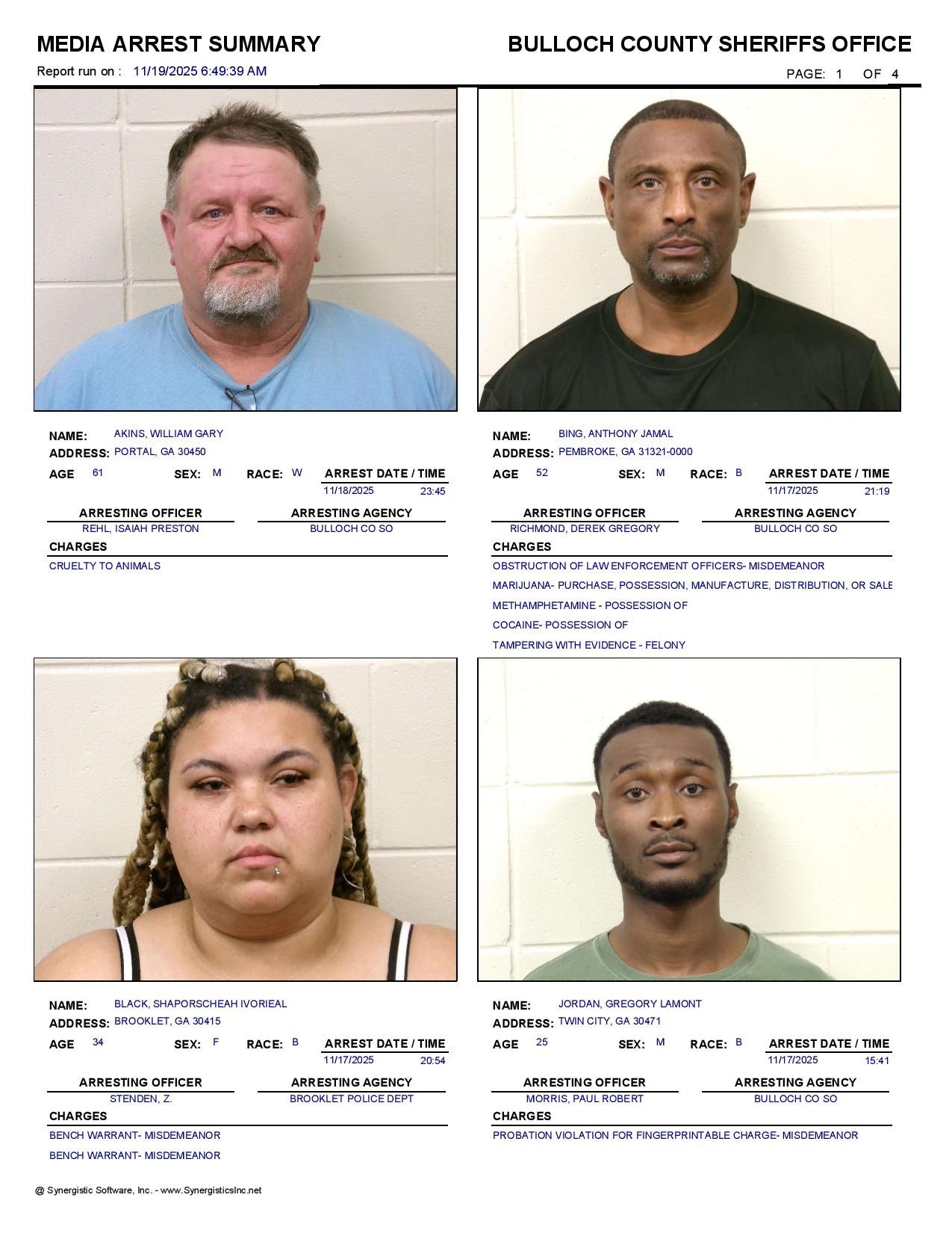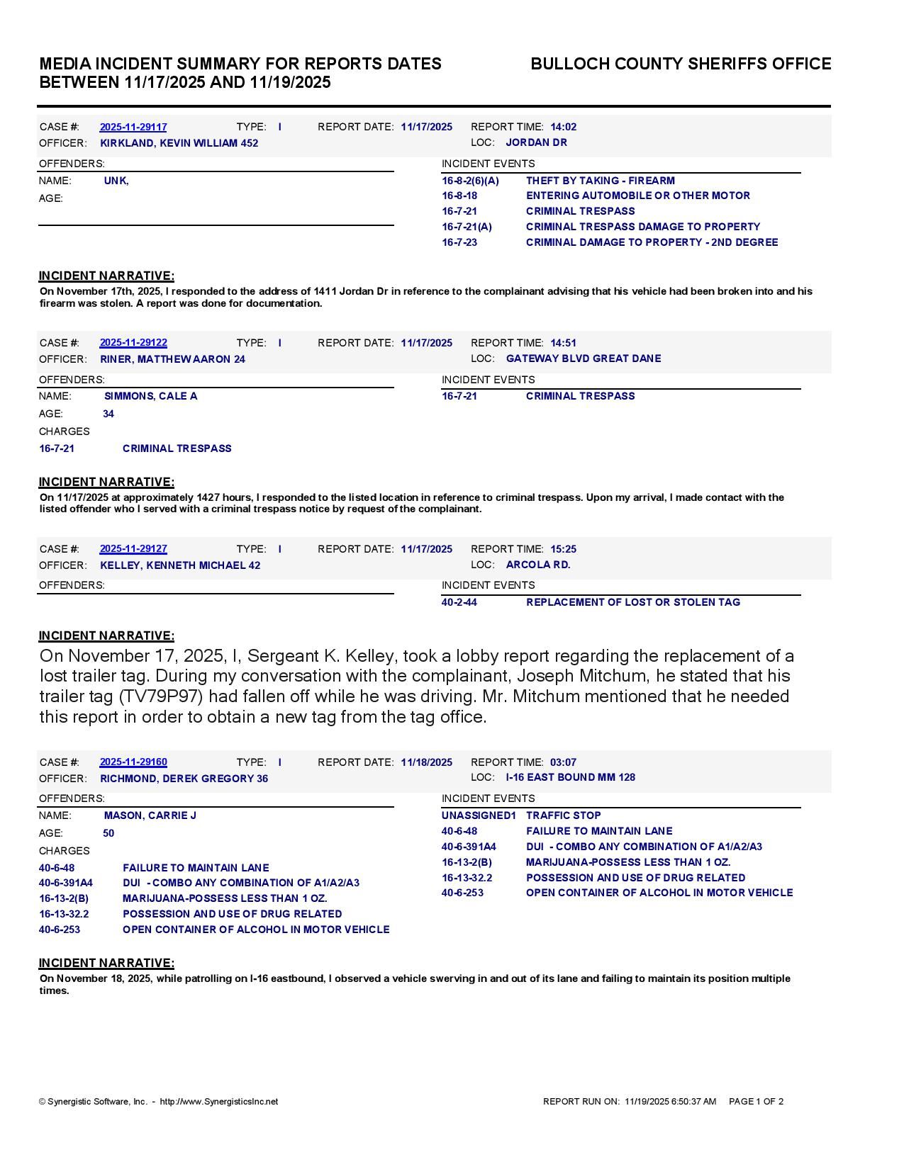 The Bulloch Co Jail Booking & Incident Report 11/19/25 details arrests from Bulloch Co., Statesboro, Brooklet, Portal, Register, and the Georgia State Patrol. Incident reports are from the Sheriff’s Office only.