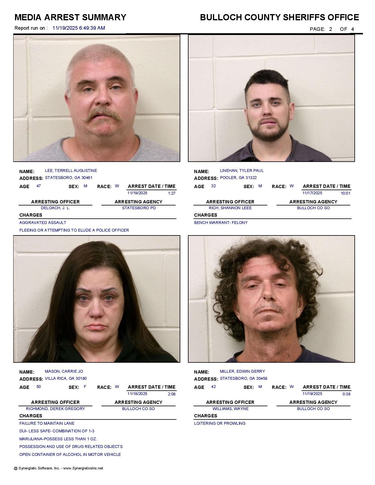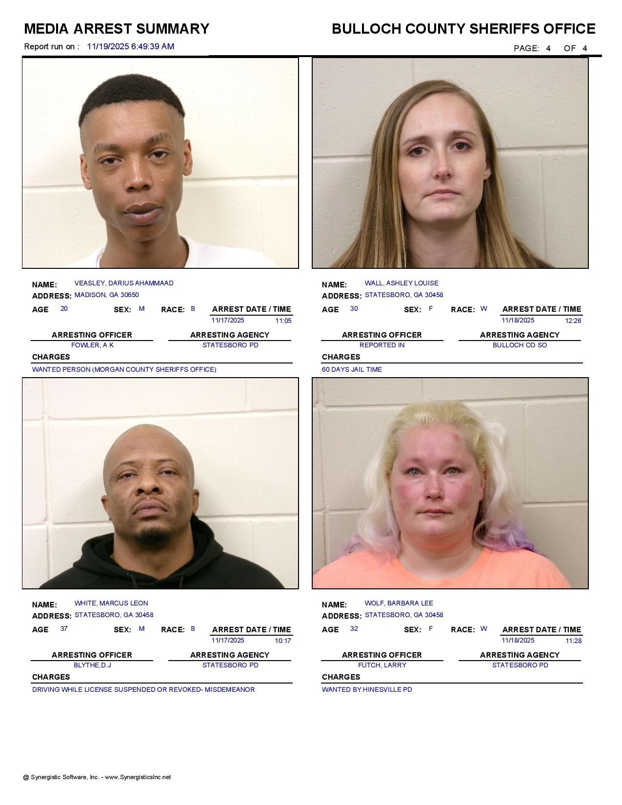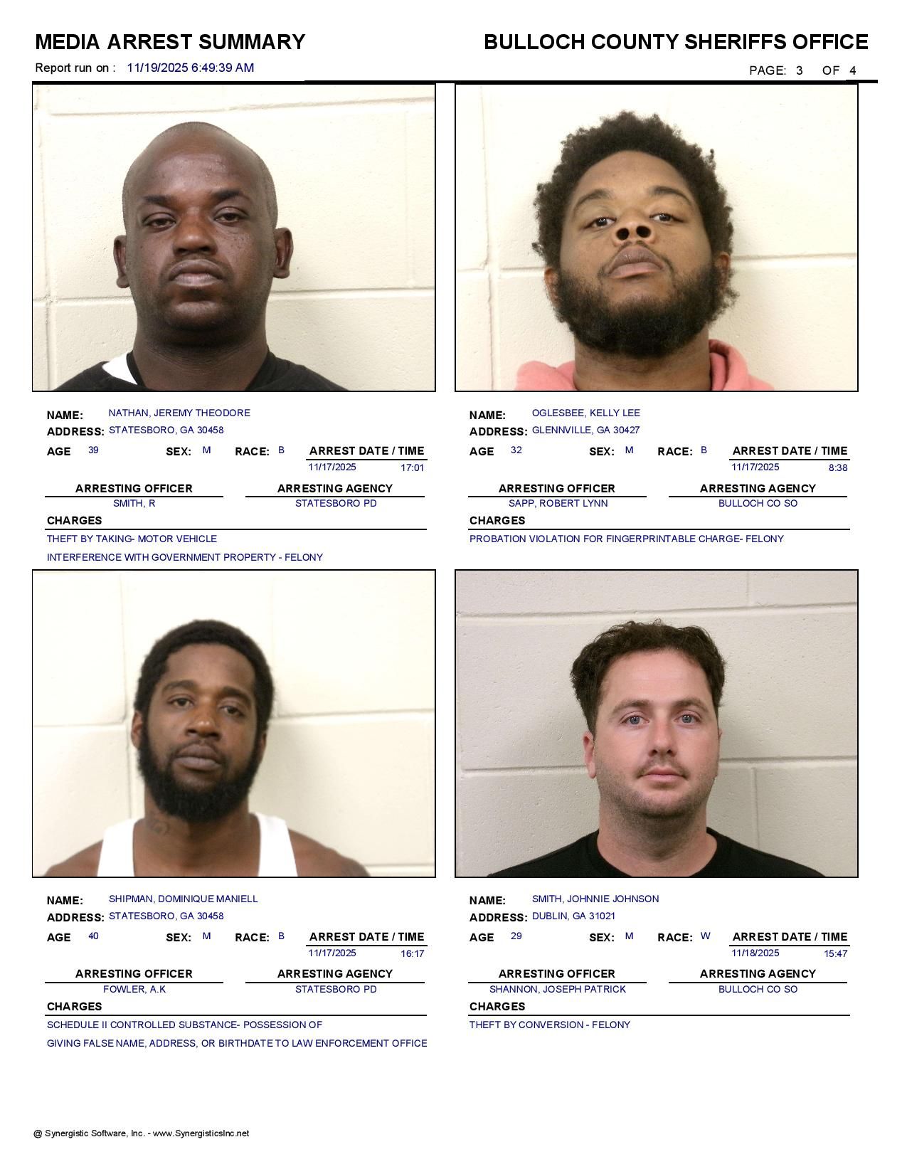 The Bulloch Co Jail Booking & Incident Report 11/19/25 details arrests from Bulloch Co., Statesboro, Brooklet, Portal, Register, and the Georgia State Patrol. Incident reports are from the Sheriff’s Office only.