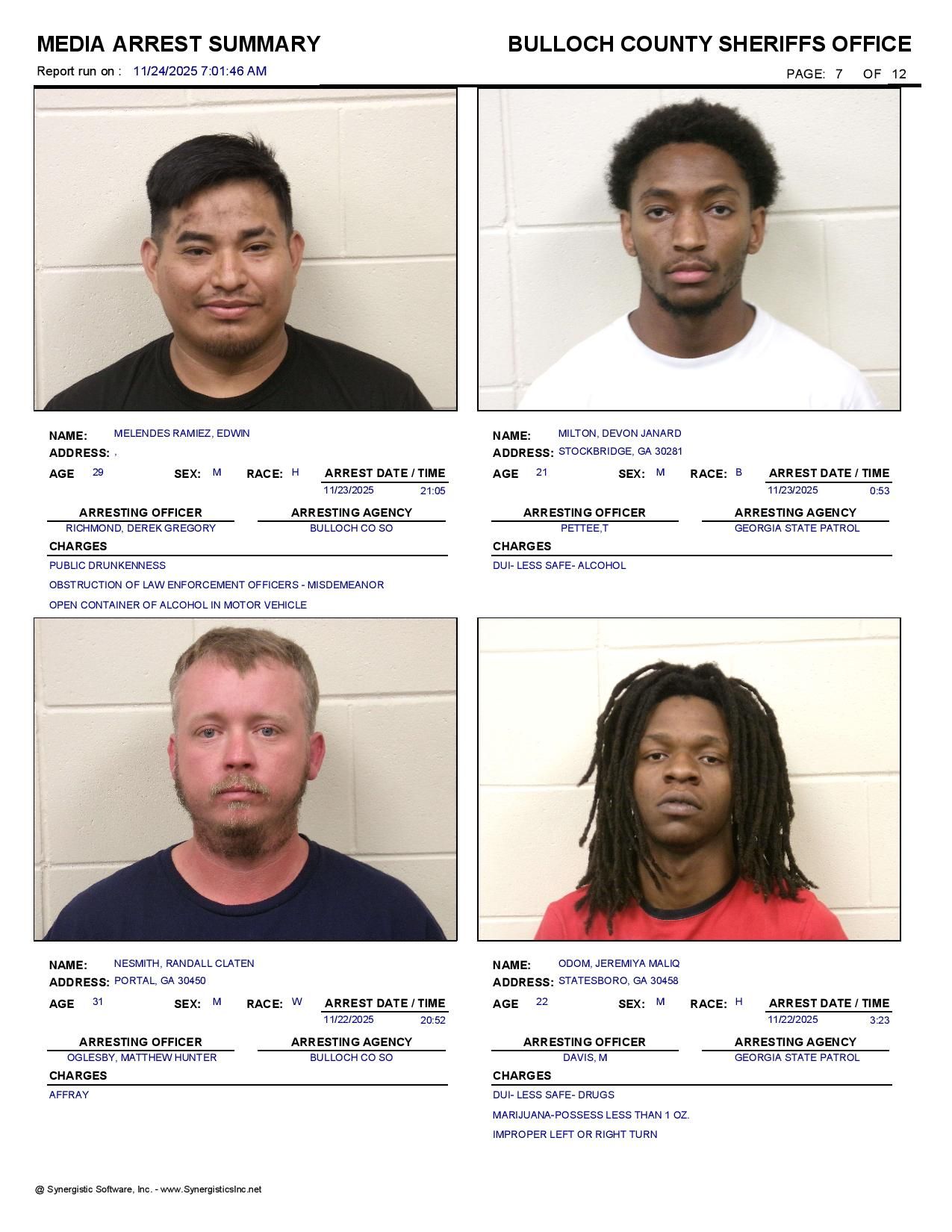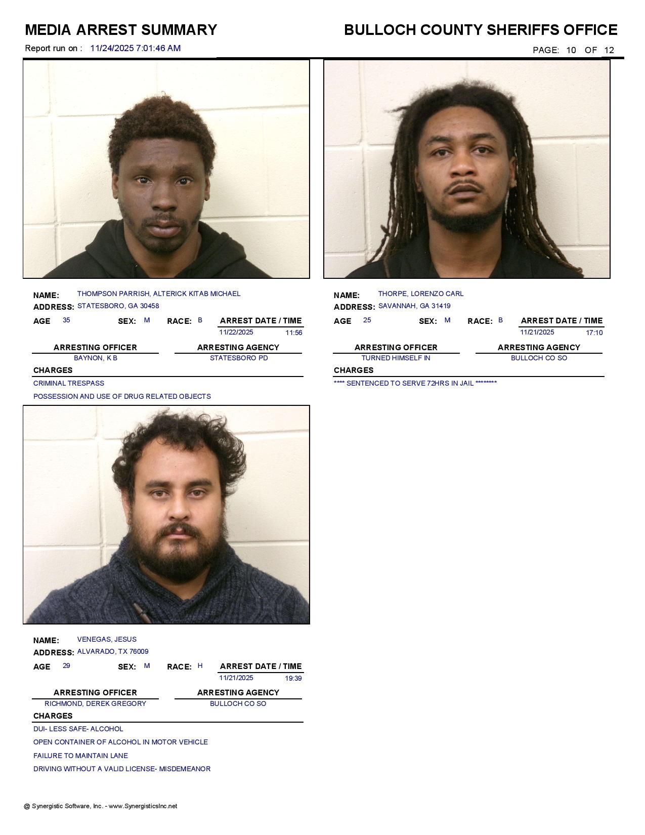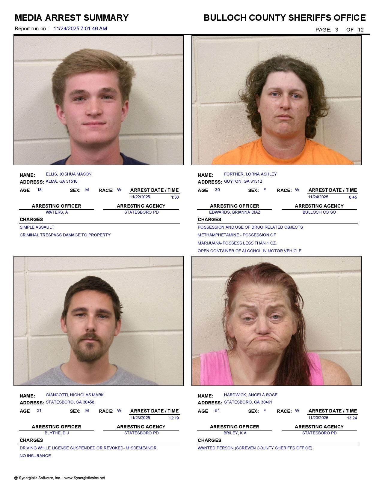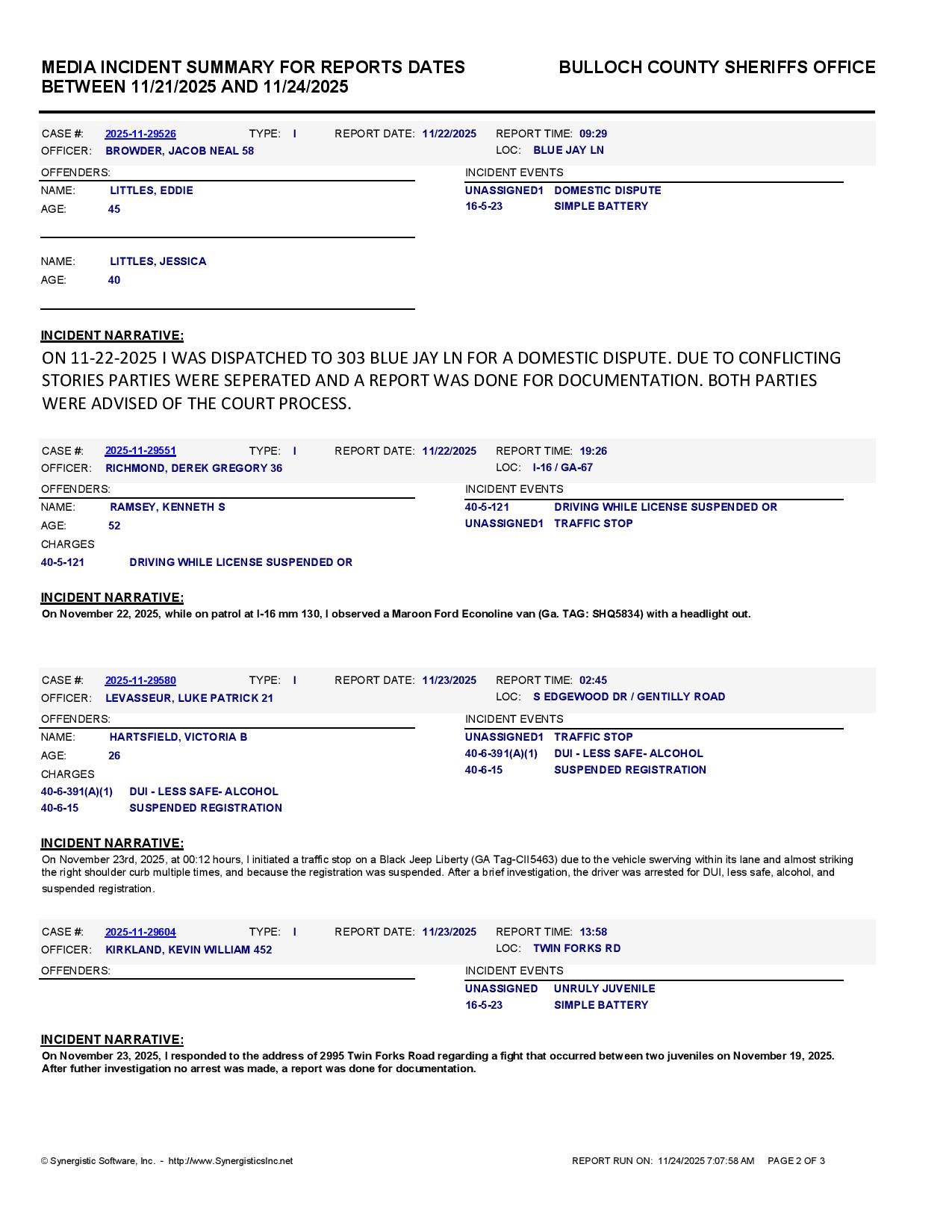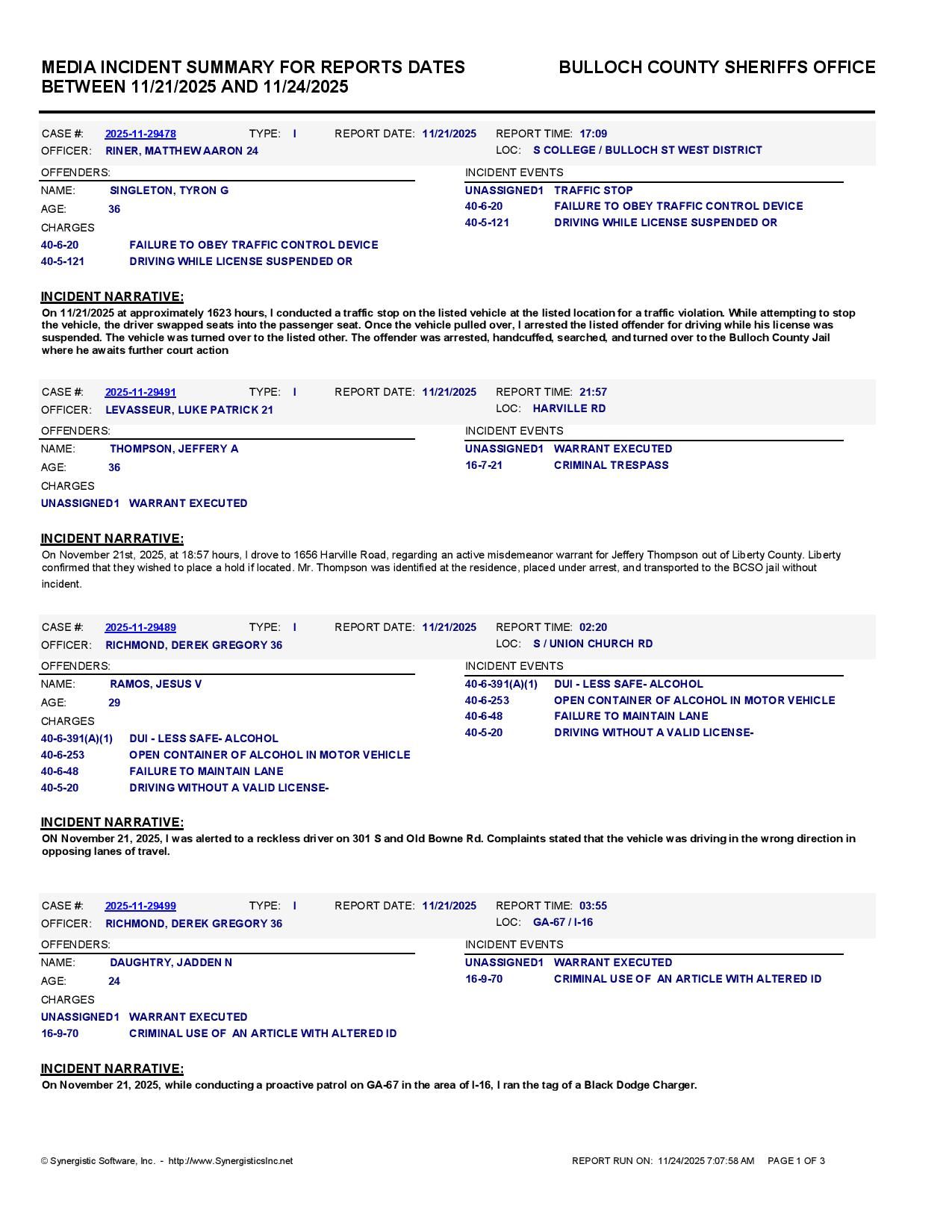 The Bulloch Co Jail Booking & Incident Report 11/24/25 details arrests from Bulloch Co., Statesboro, Brooklet, Portal, Register, and the Georgia State Patrol. Incident reports are from the Sheriff’s Office only.
