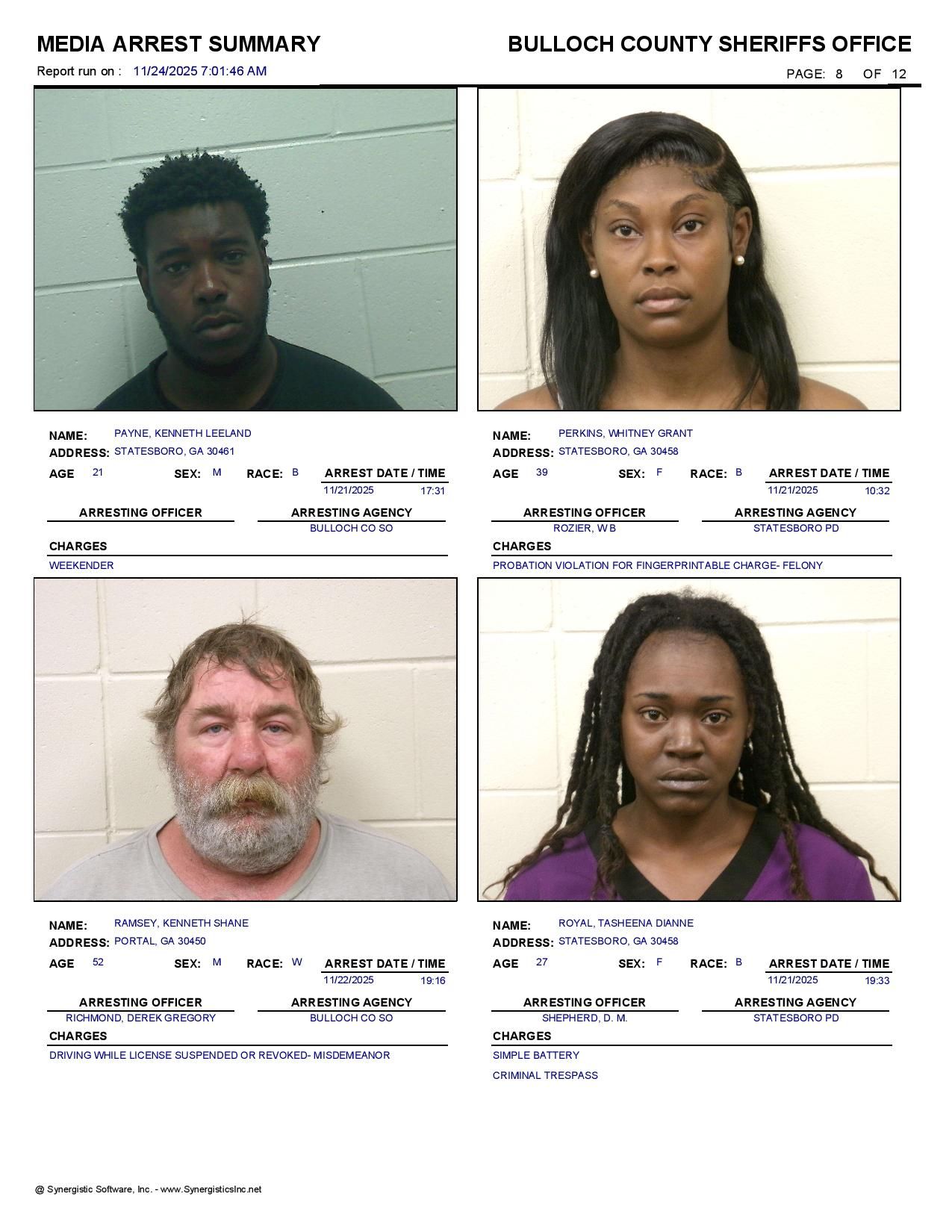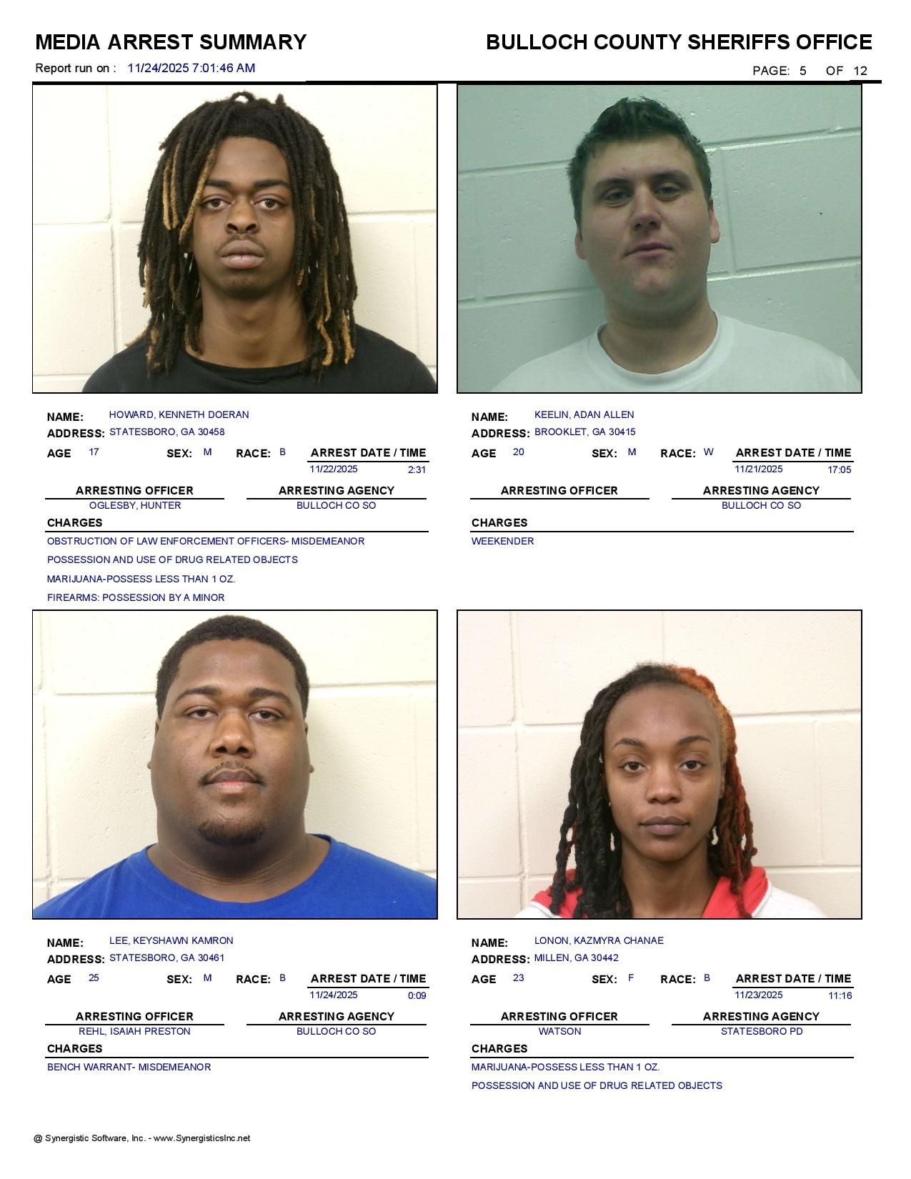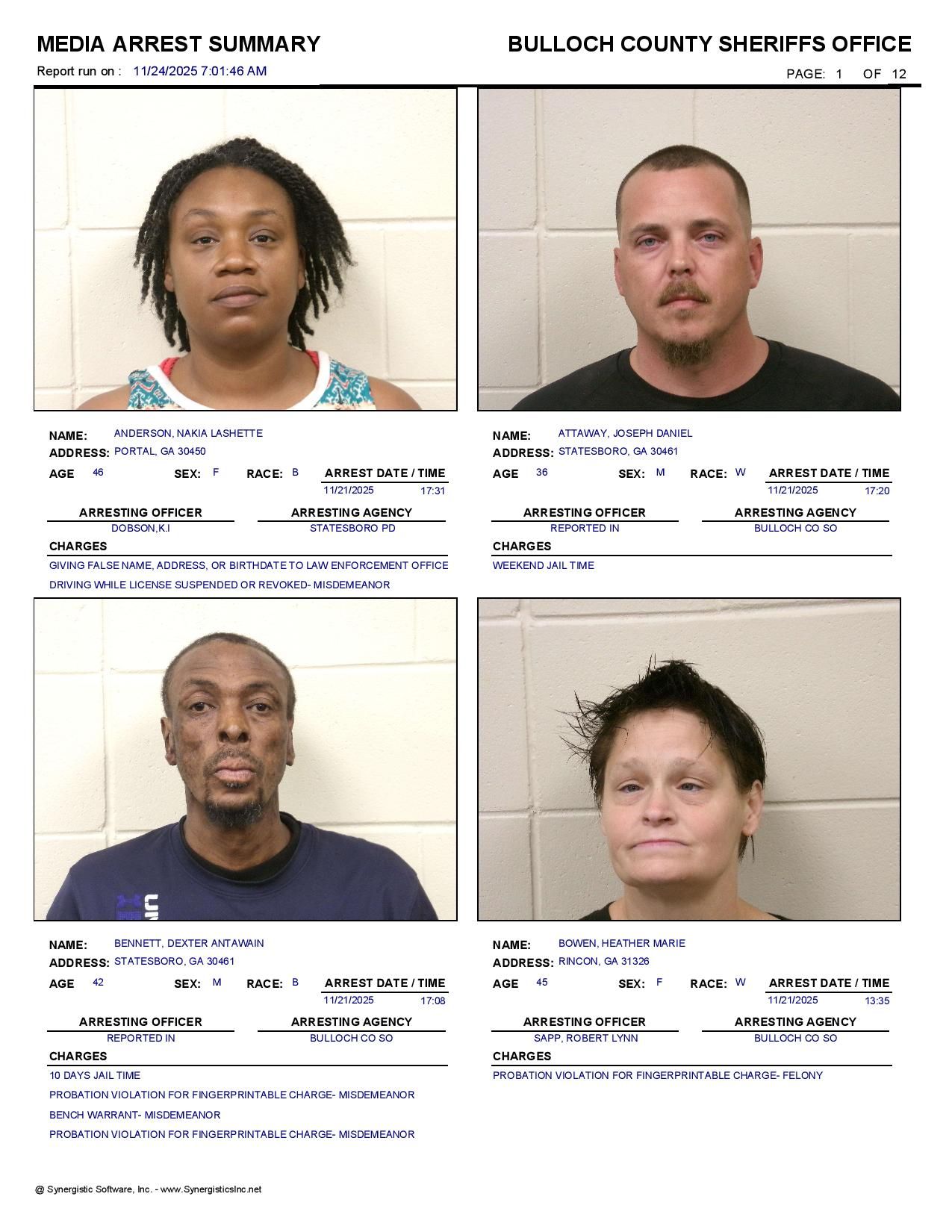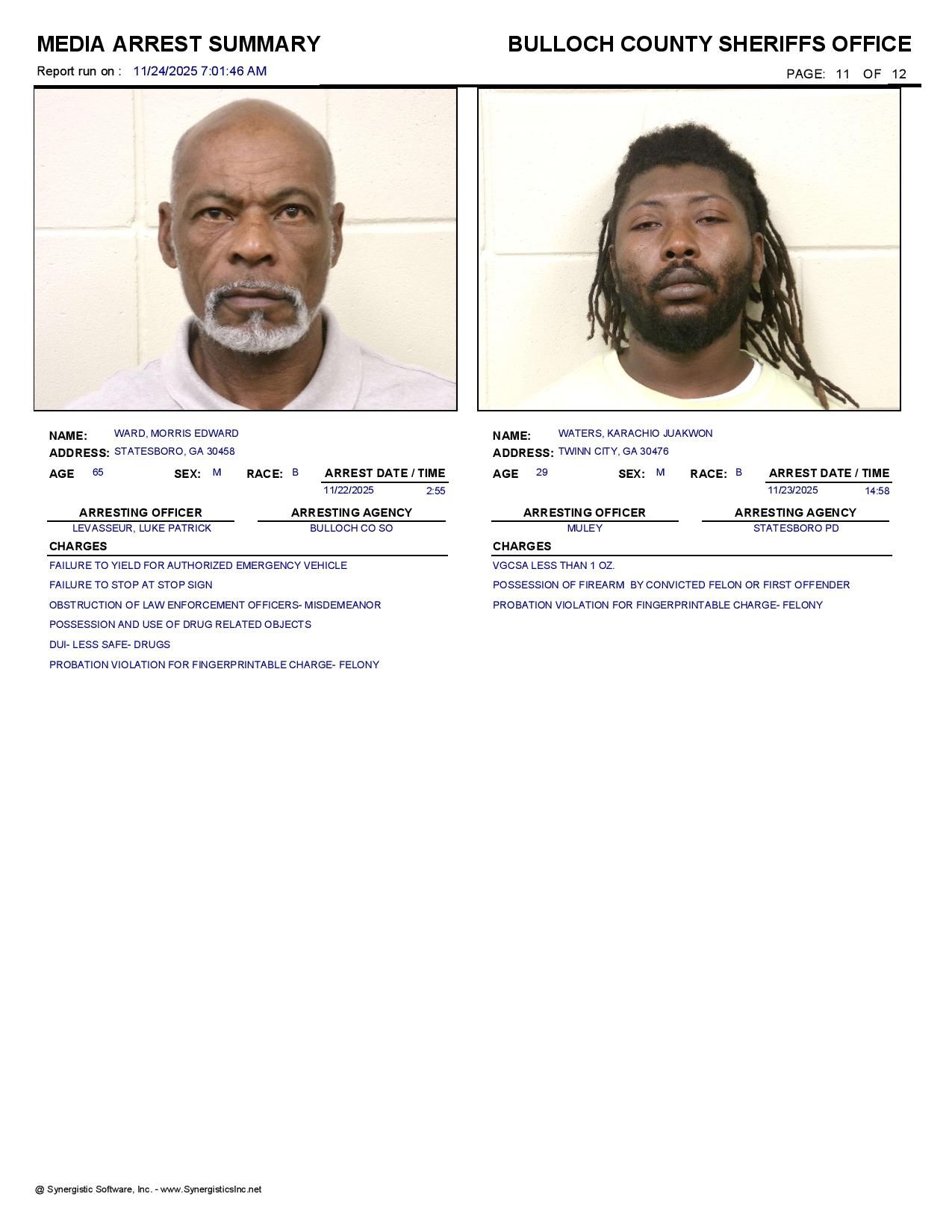 The Bulloch Co Jail Booking & Incident Report 11/24/25 details arrests from Bulloch Co., Statesboro, Brooklet, Portal, Register, and the Georgia State Patrol. Incident reports are from the Sheriff’s Office only.