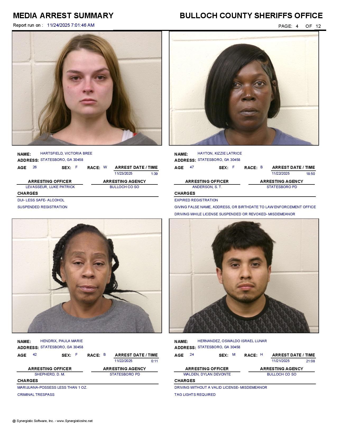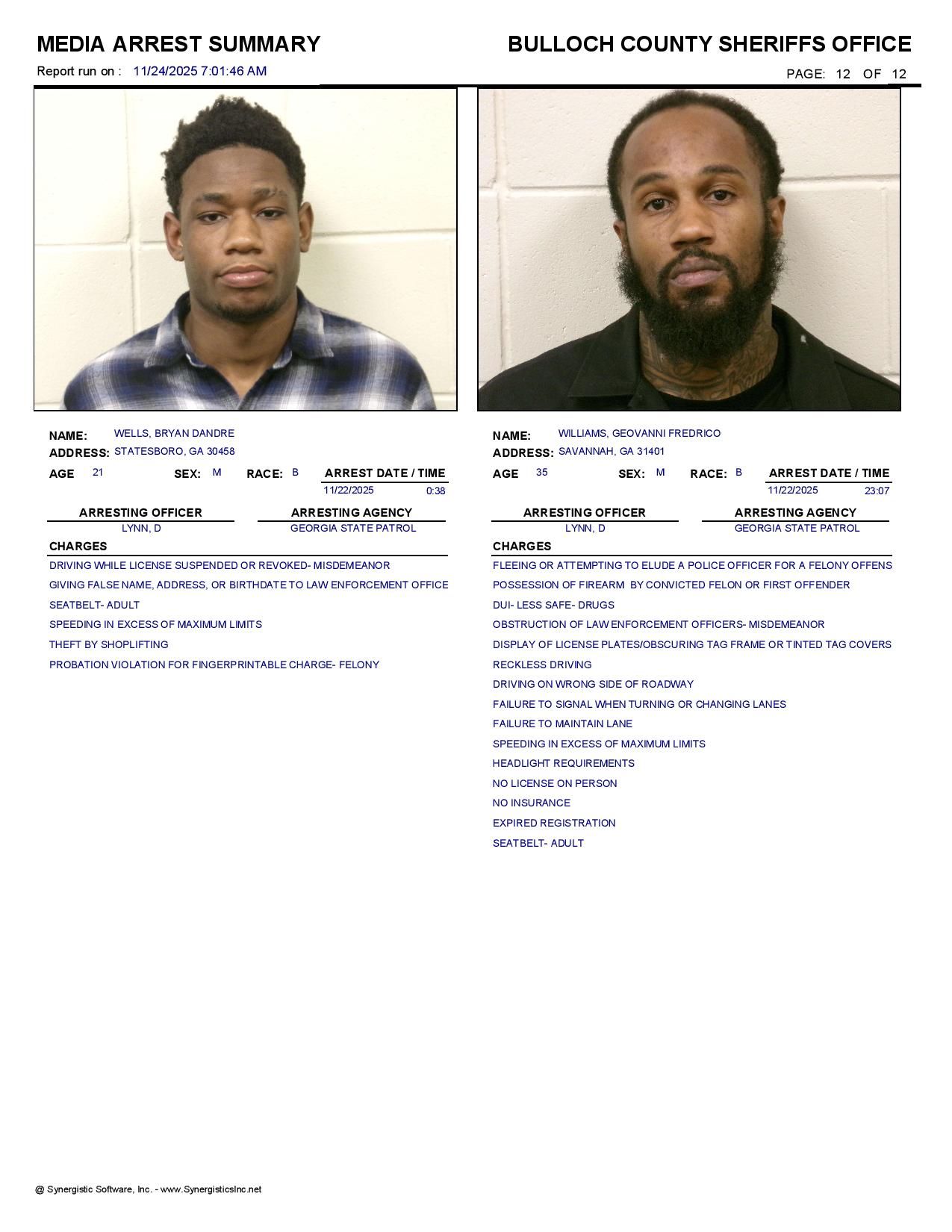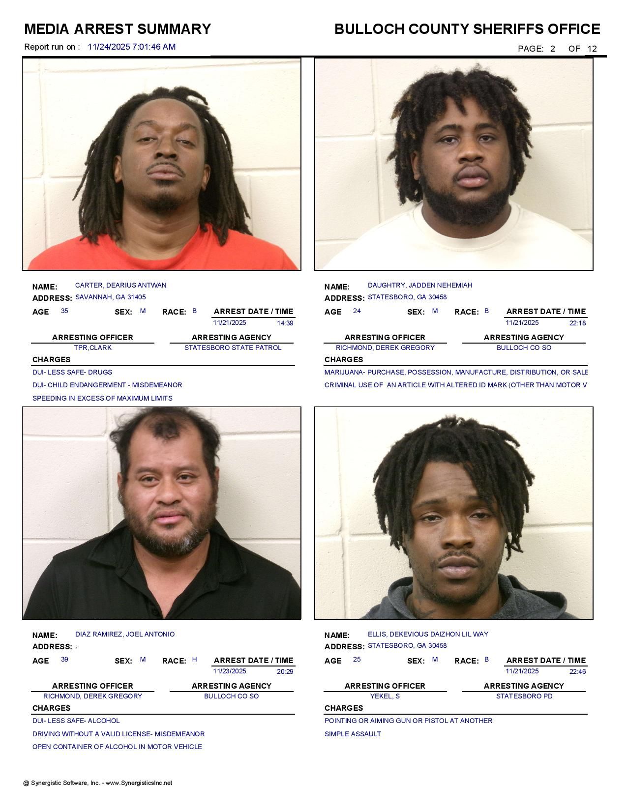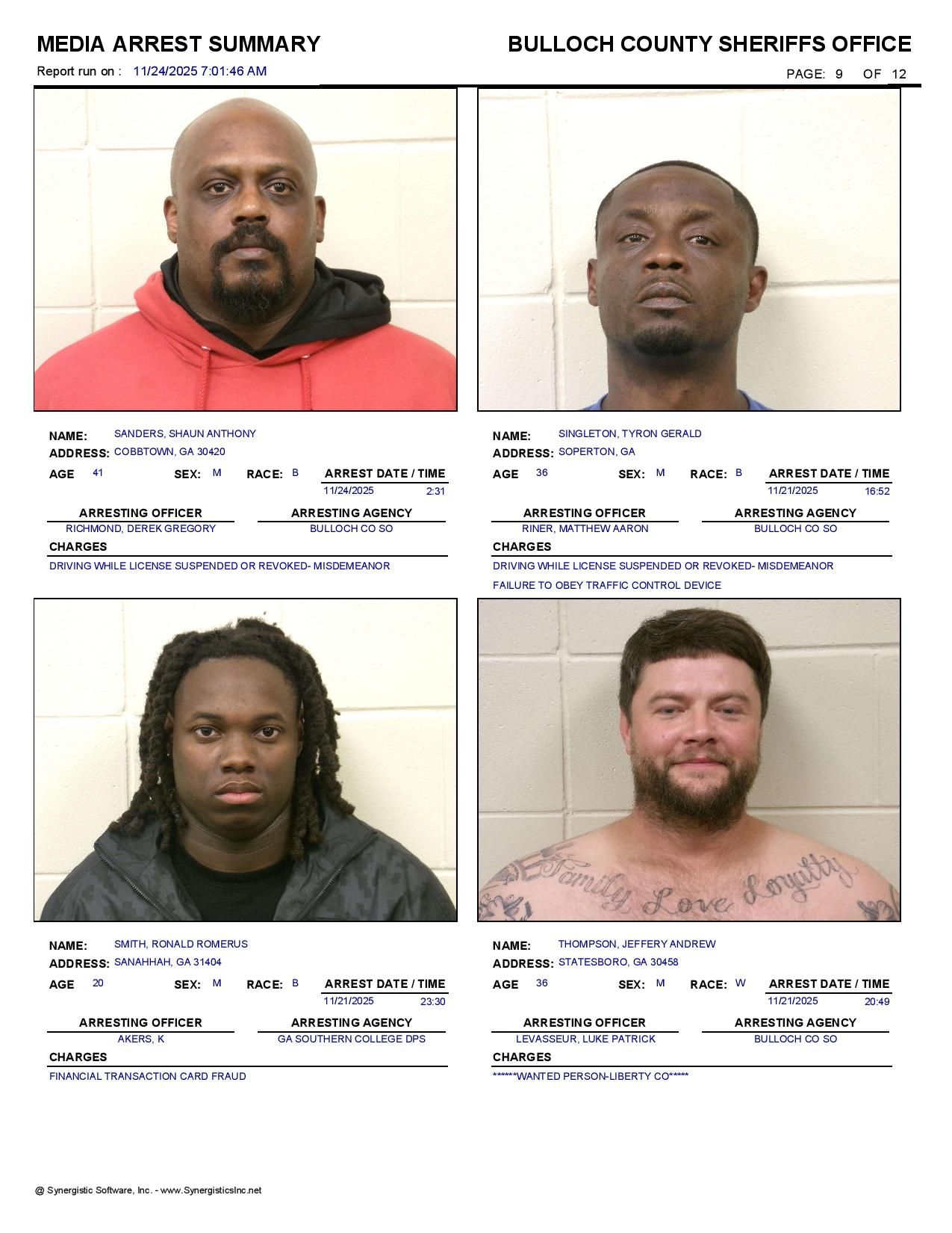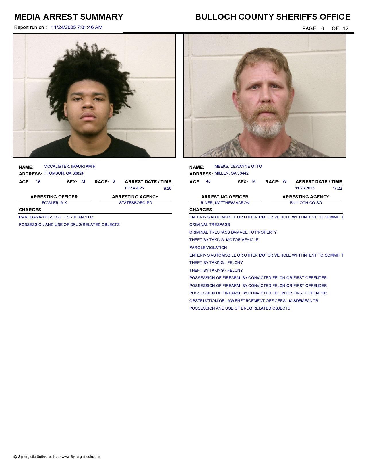 The Bulloch Co Jail Booking & Incident Report 11/24/25 details arrests from Bulloch Co., Statesboro, Brooklet, Portal, Register, and the Georgia State Patrol. Incident reports are from the Sheriff’s Office only.