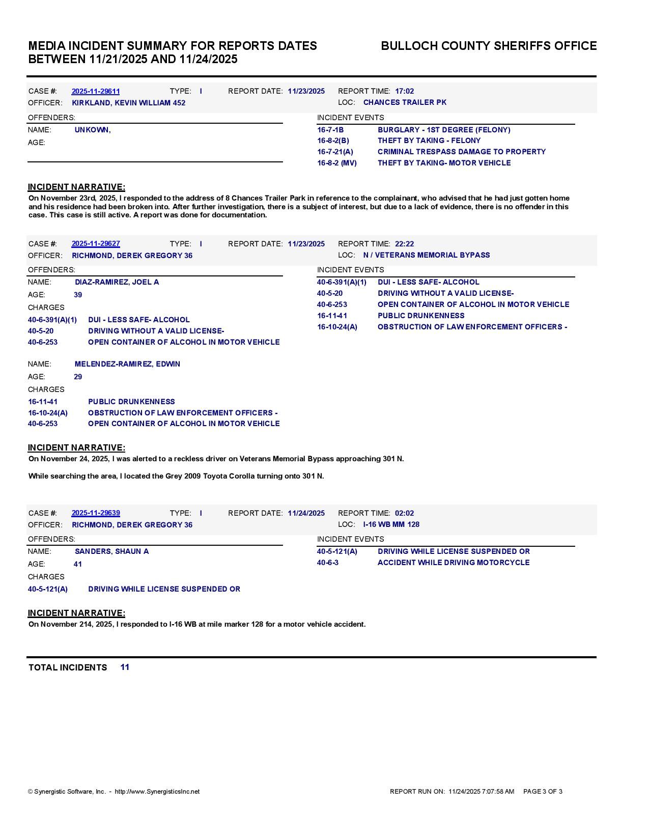 Bulloch Co. Jail Booking & Incident Report – 11/24/25