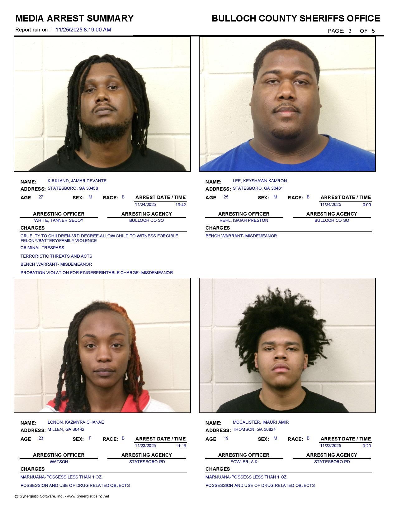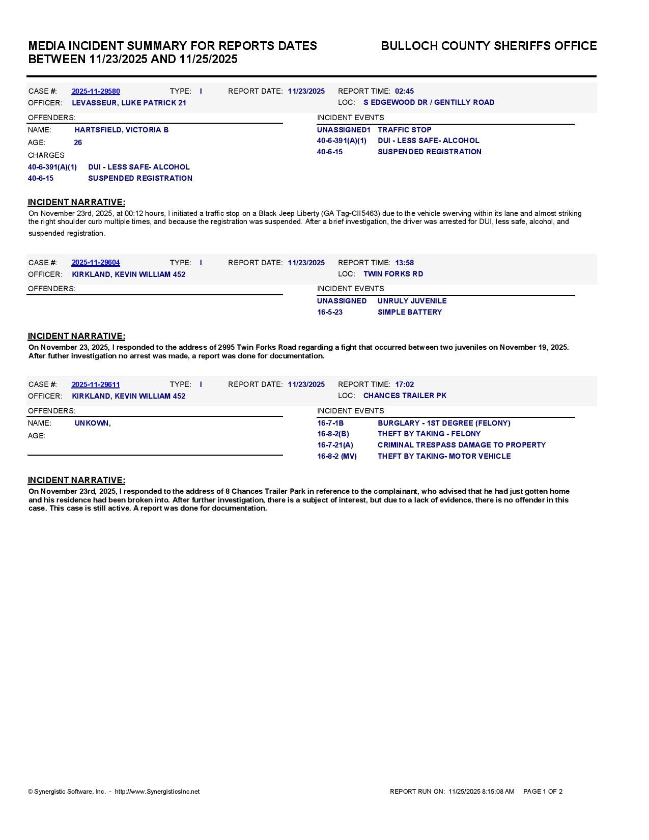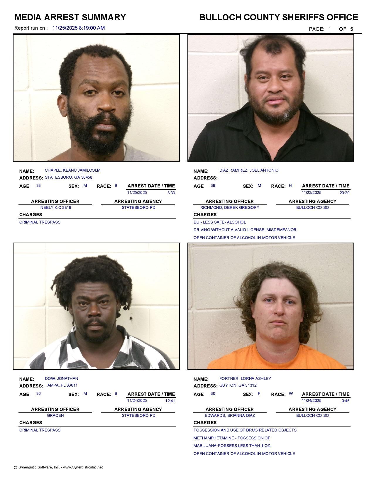 The Bulloch Co Jail Booking & Incident Report 11/25/25 details arrests from Bulloch Co., Statesboro, Brooklet, Portal, Register, and the Georgia State Patrol. Incident reports are from the Sheriff’s Office only.