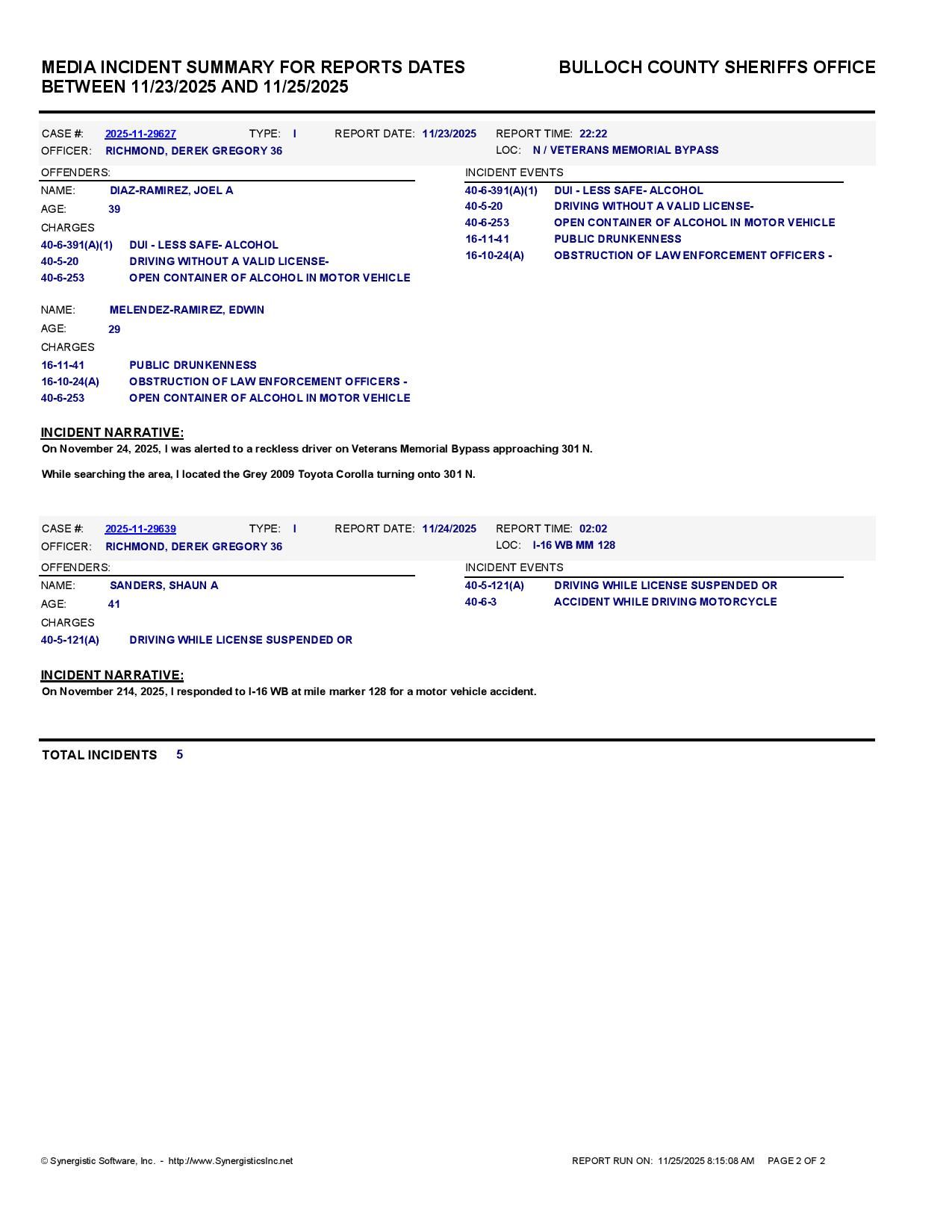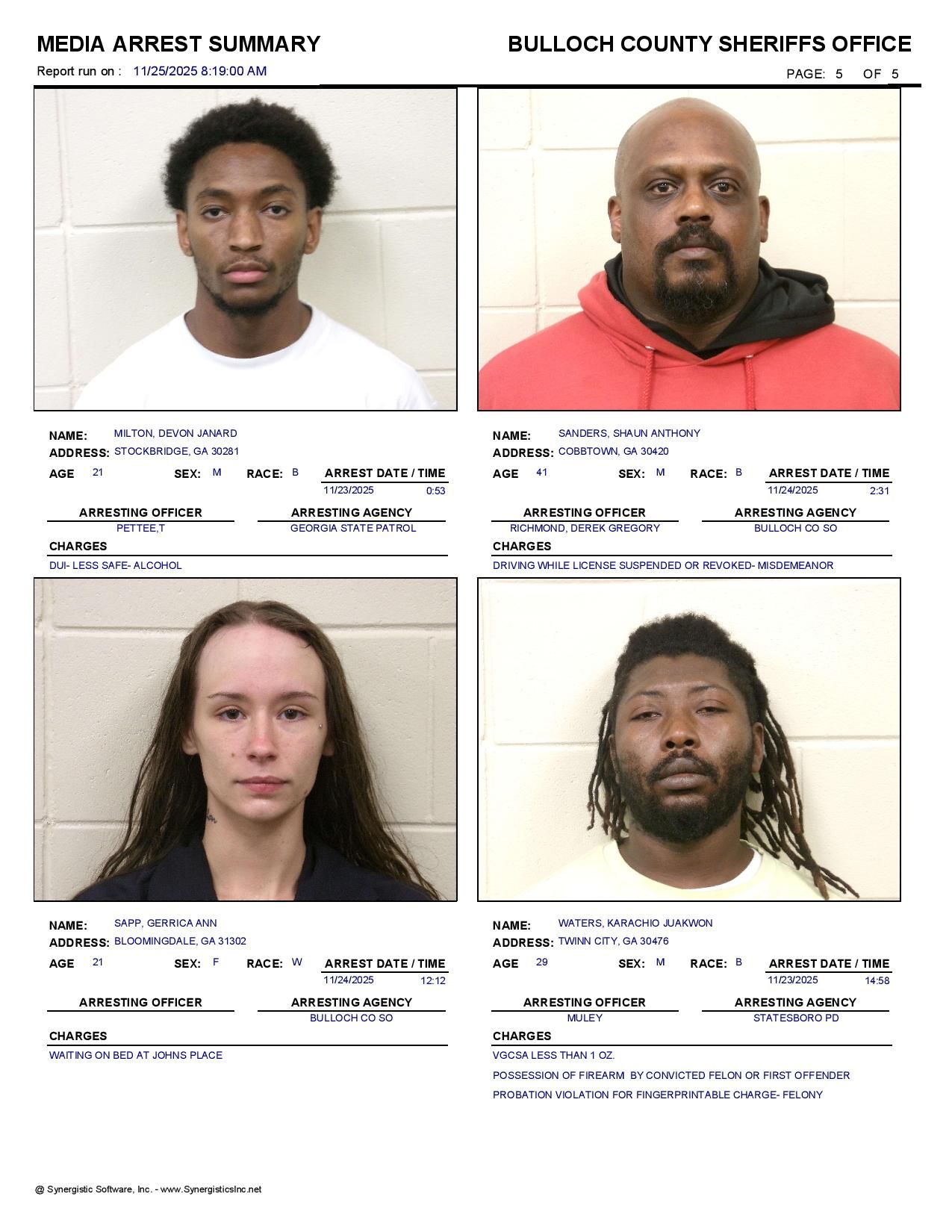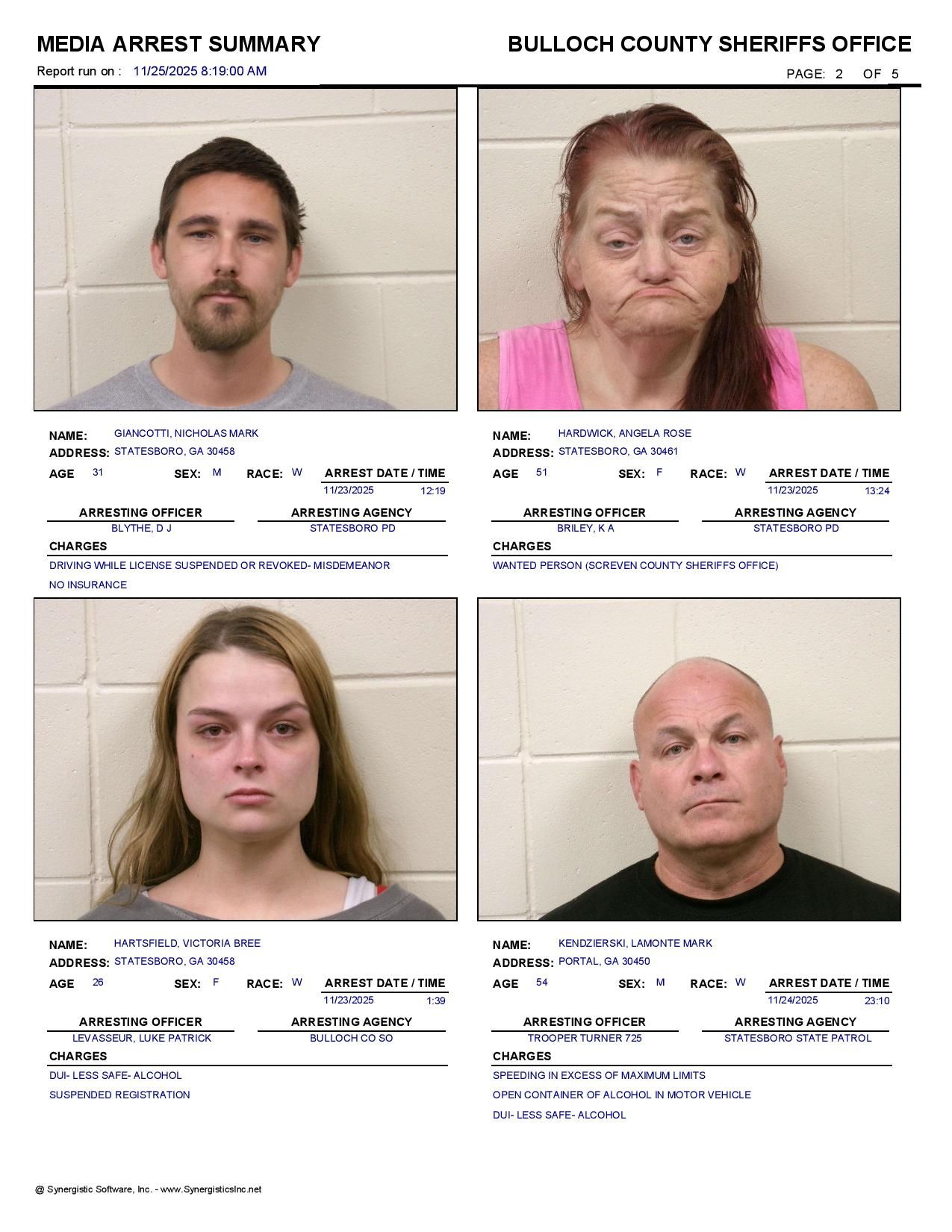 The Bulloch Co Jail Booking & Incident Report 11/25/25 details arrests from Bulloch Co., Statesboro, Brooklet, Portal, Register, and the Georgia State Patrol. Incident reports are from the Sheriff’s Office only.