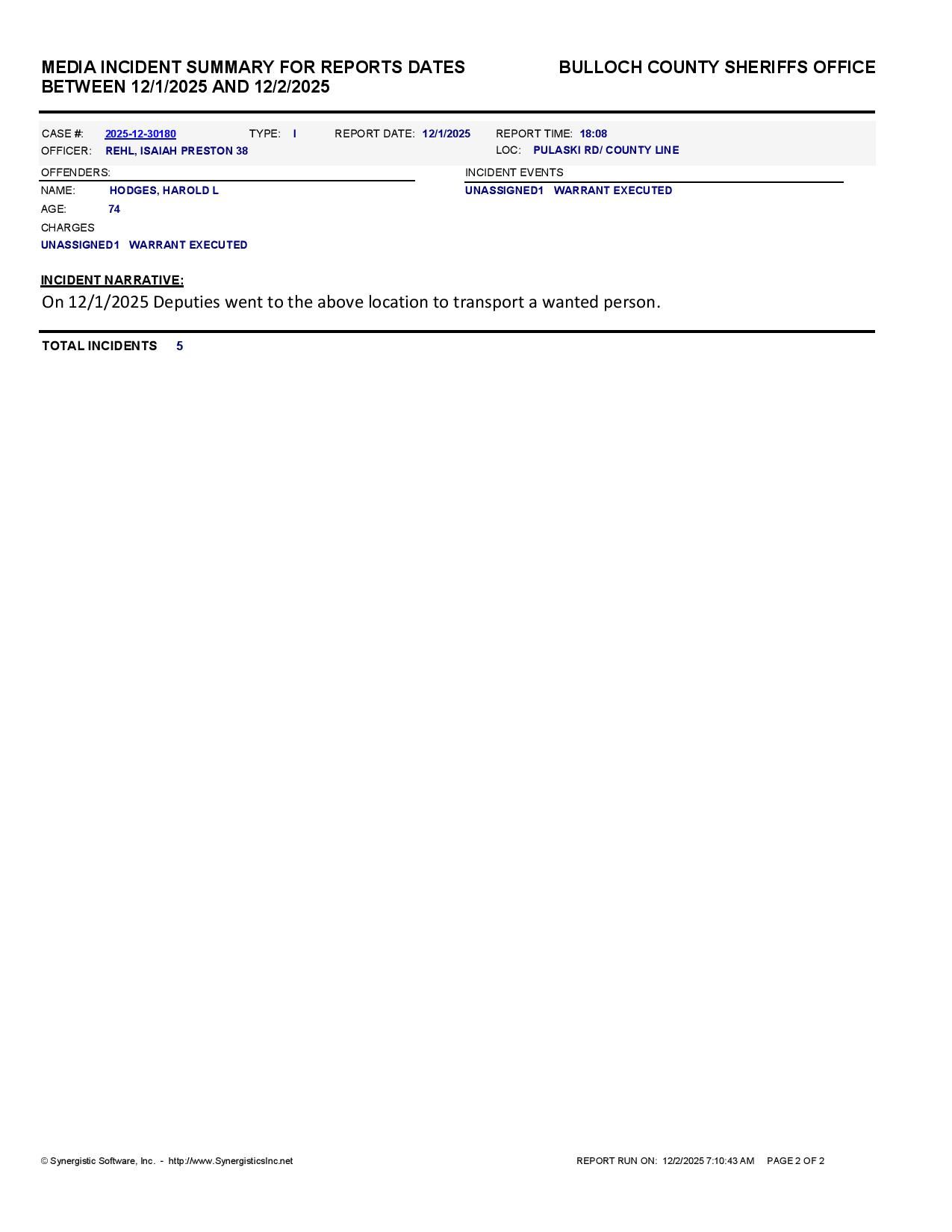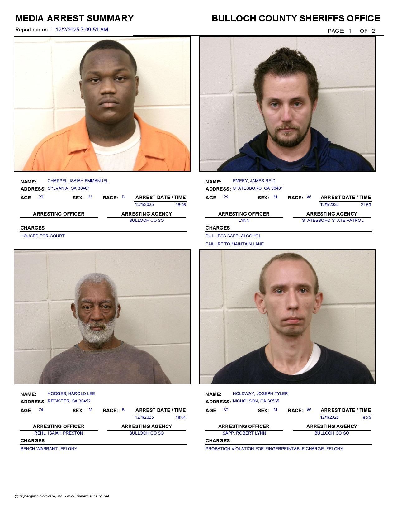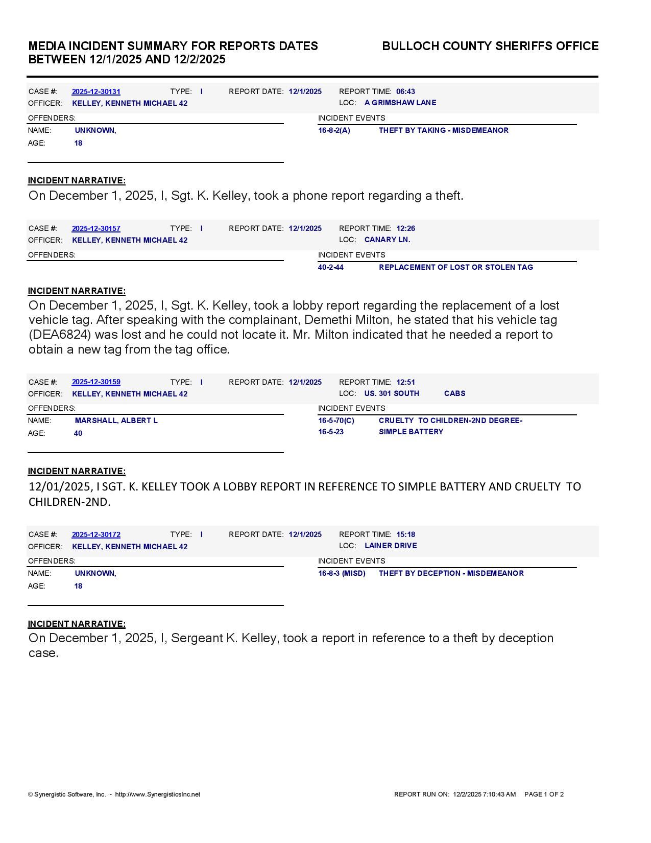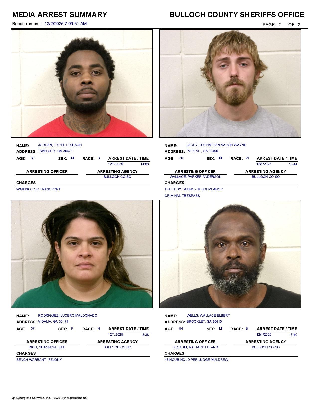 The Bulloch Co Jail Booking & Incident Report 12/02/25 details arrests from Bulloch Co., Statesboro, Brooklet, Portal, Register, and the Georgia State Patrol. Incident reports are from the Sheriff’s Office only.