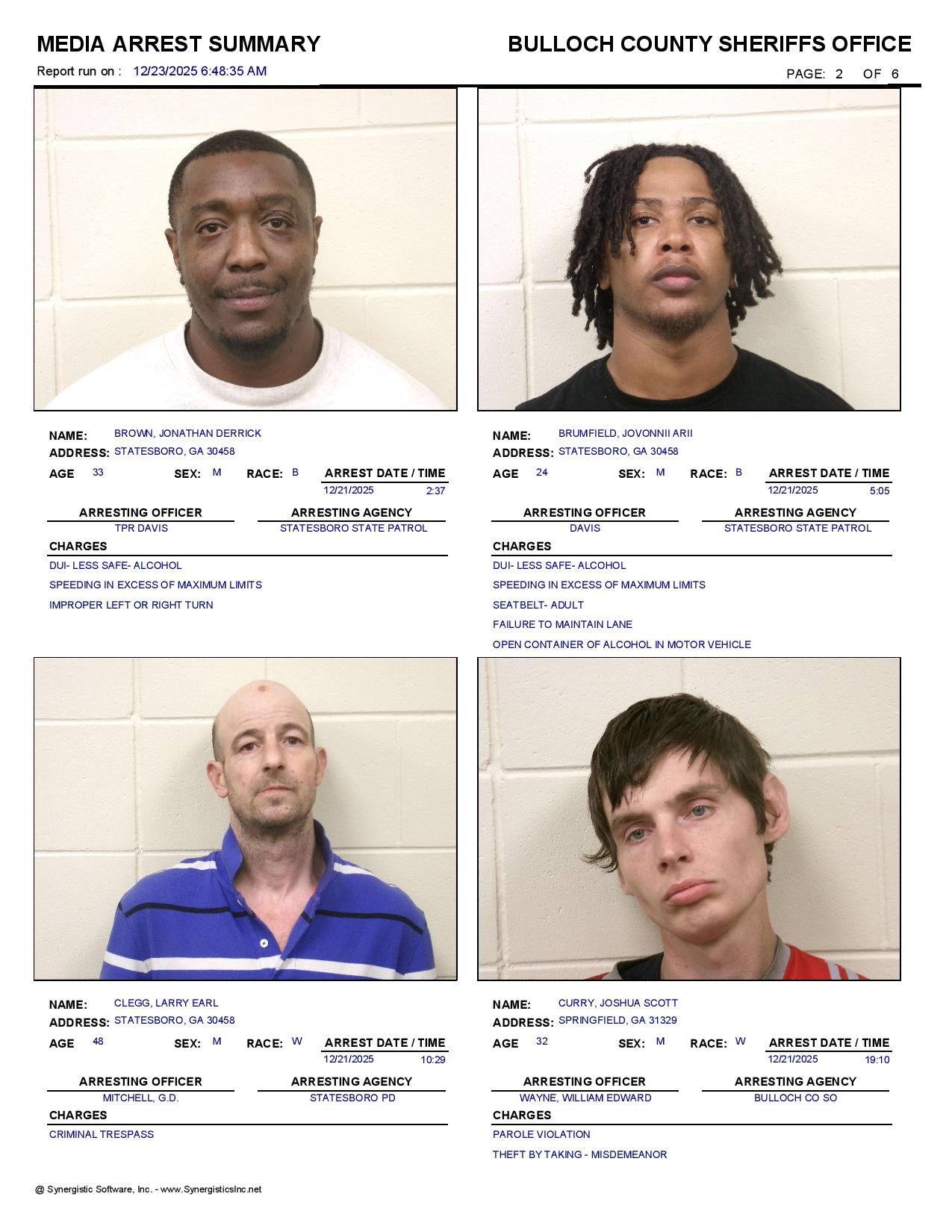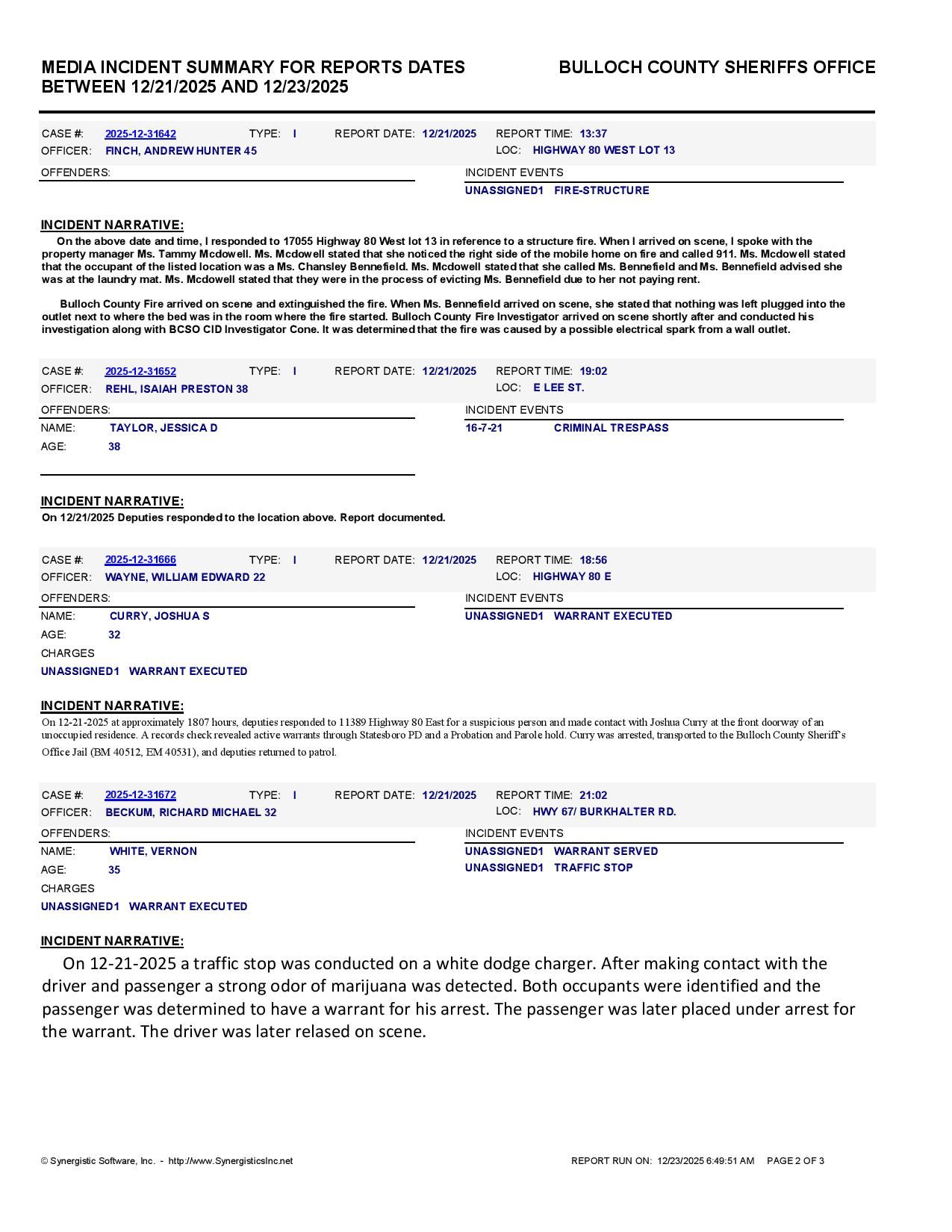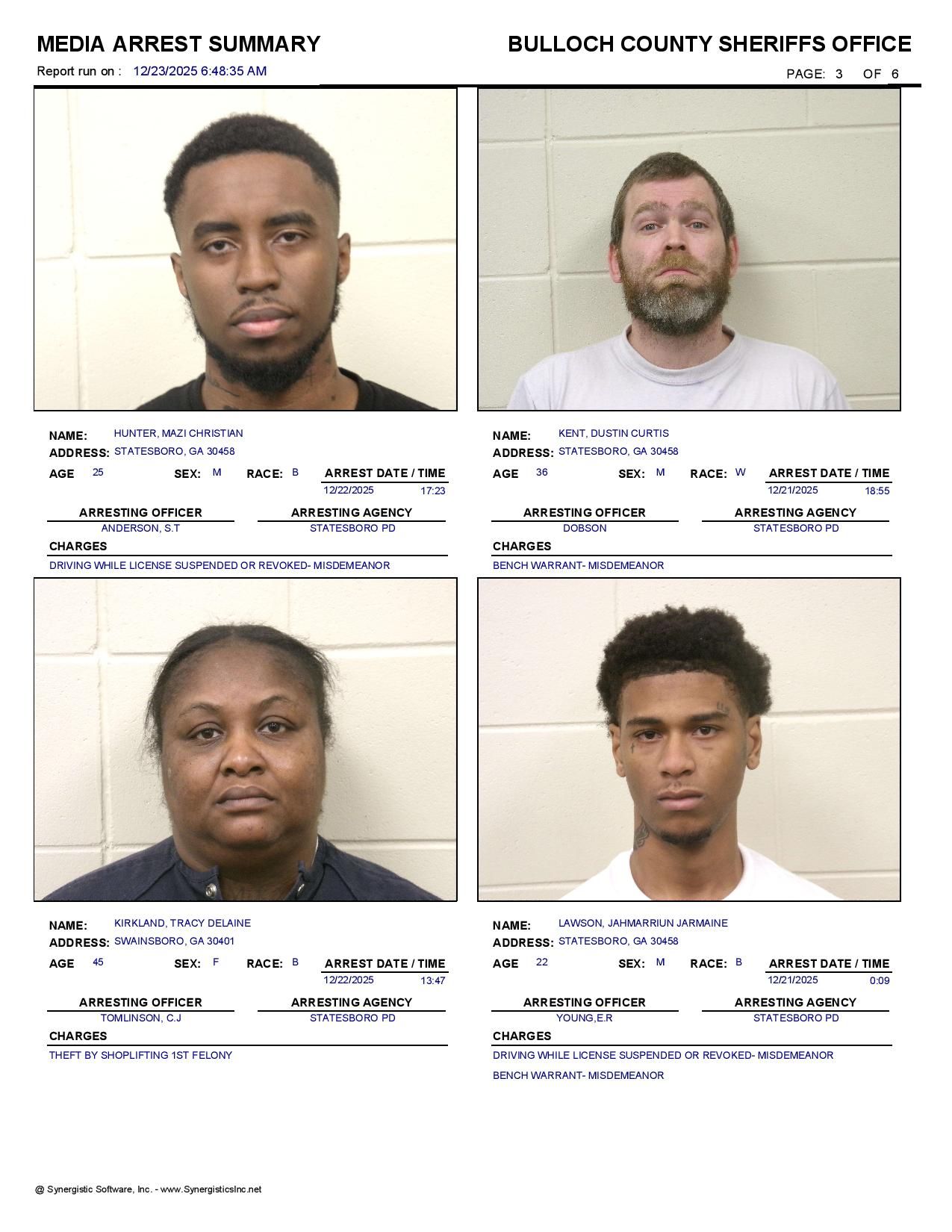 The Bulloch Co Jail Booking & Incident Report 12/23/25 details arrests from Bulloch Co., Statesboro, Brooklet, Portal, Register, and the Georgia State Patrol. Incident reports are from the Sheriff’s Office only.