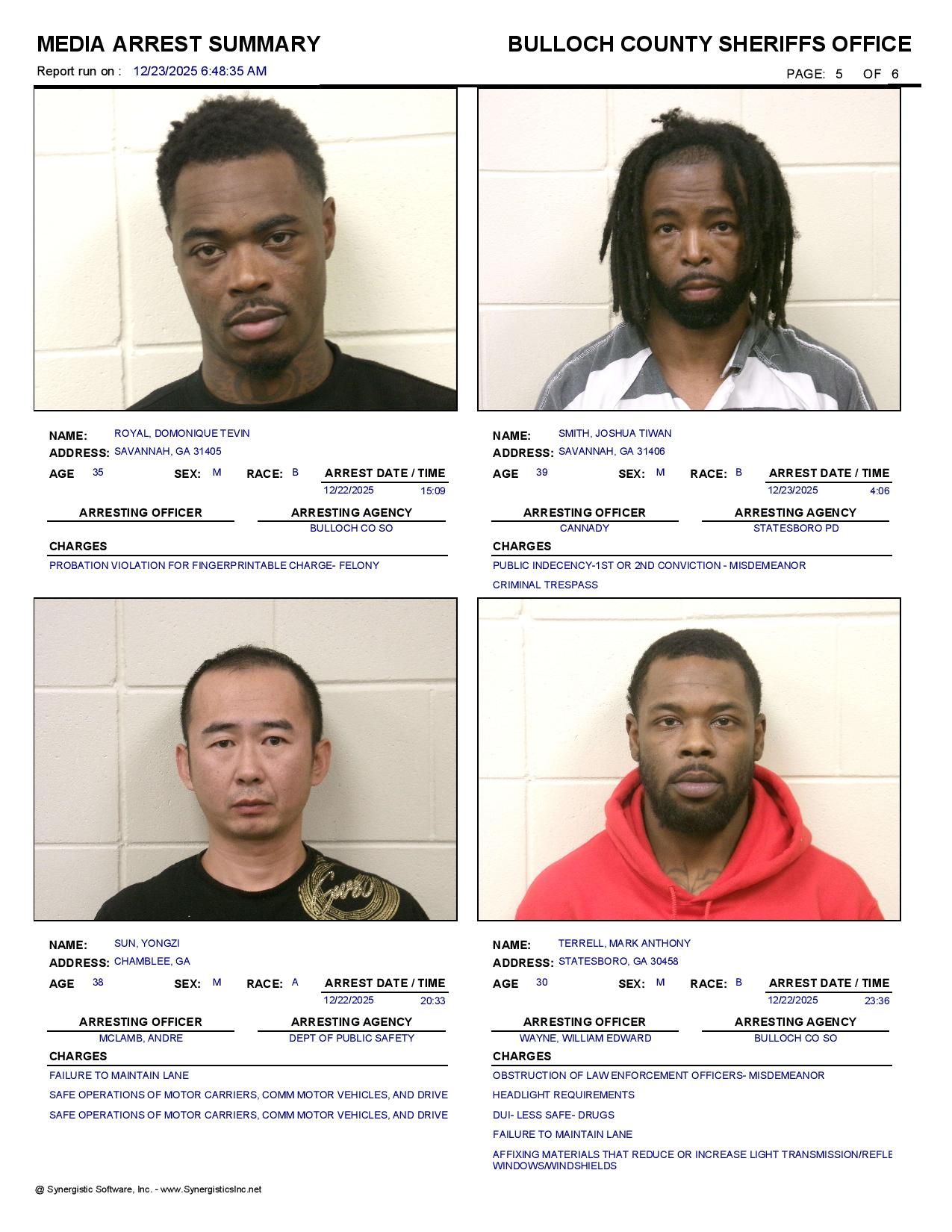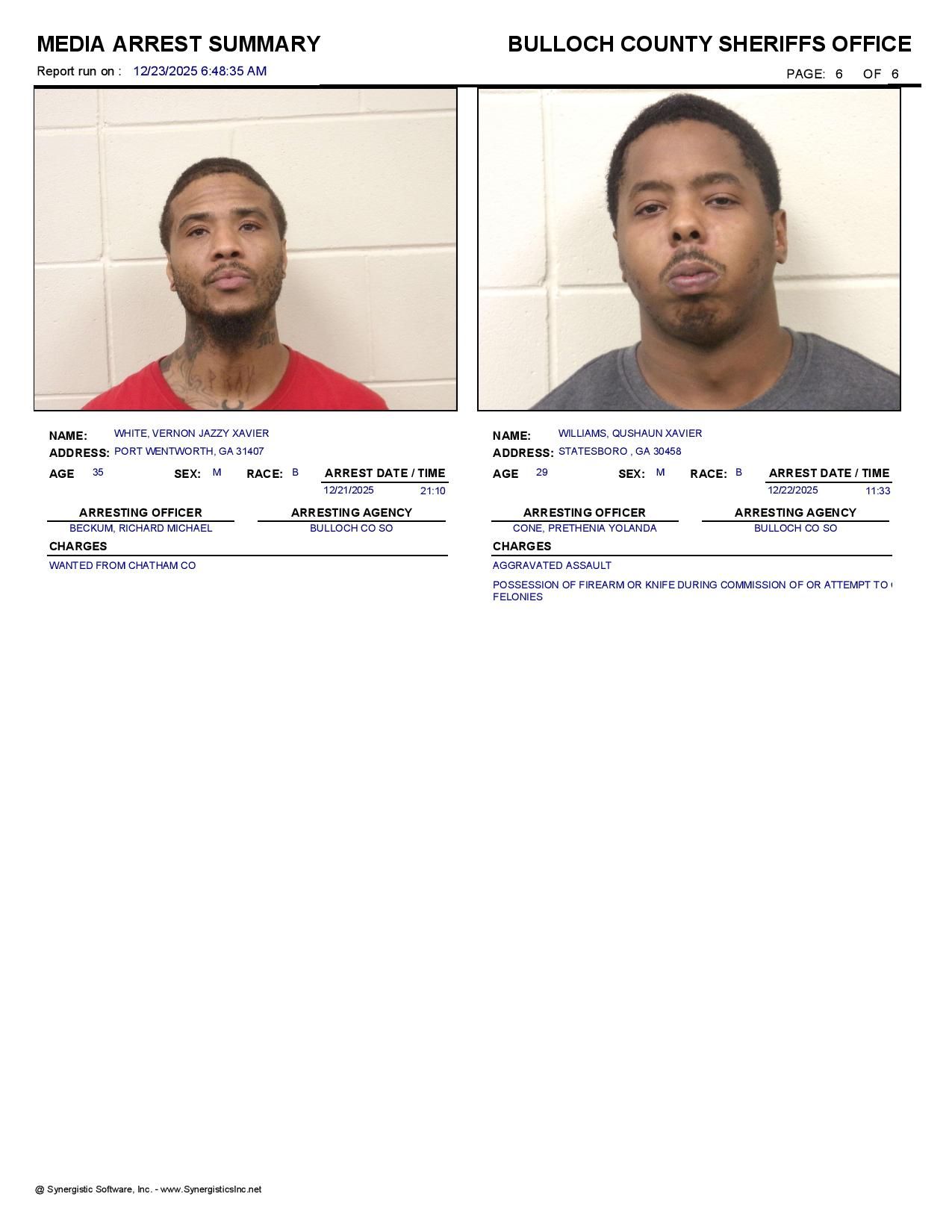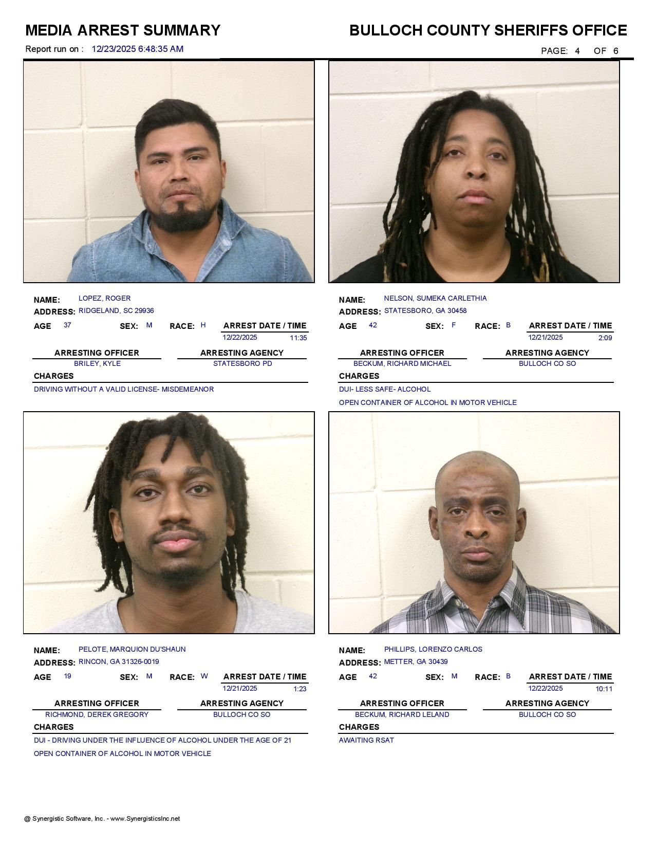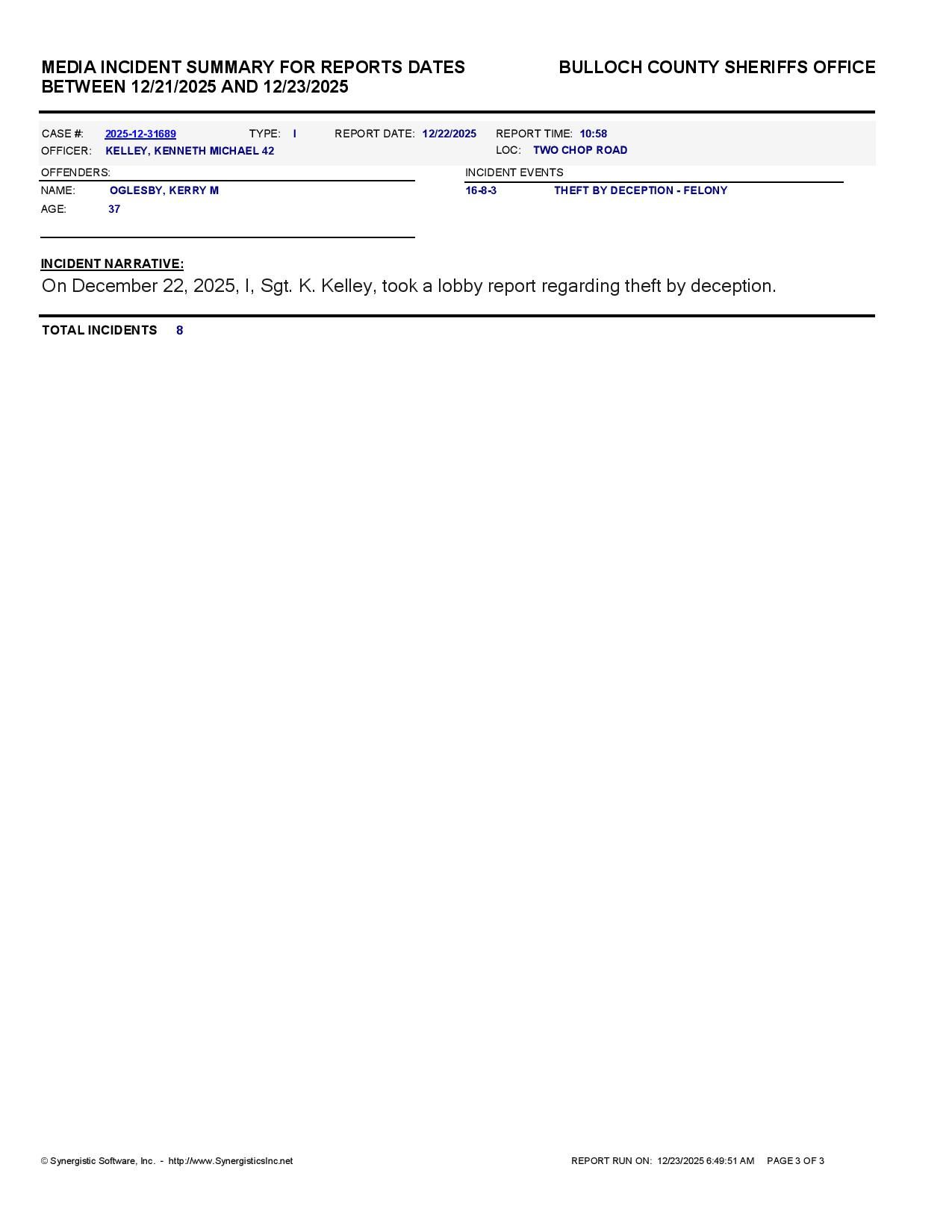 The Bulloch Co Jail Booking & Incident Report 12/23/25 details arrests from Bulloch Co., Statesboro, Brooklet, Portal, Register, and the Georgia State Patrol. Incident reports are from the Sheriff’s Office only.