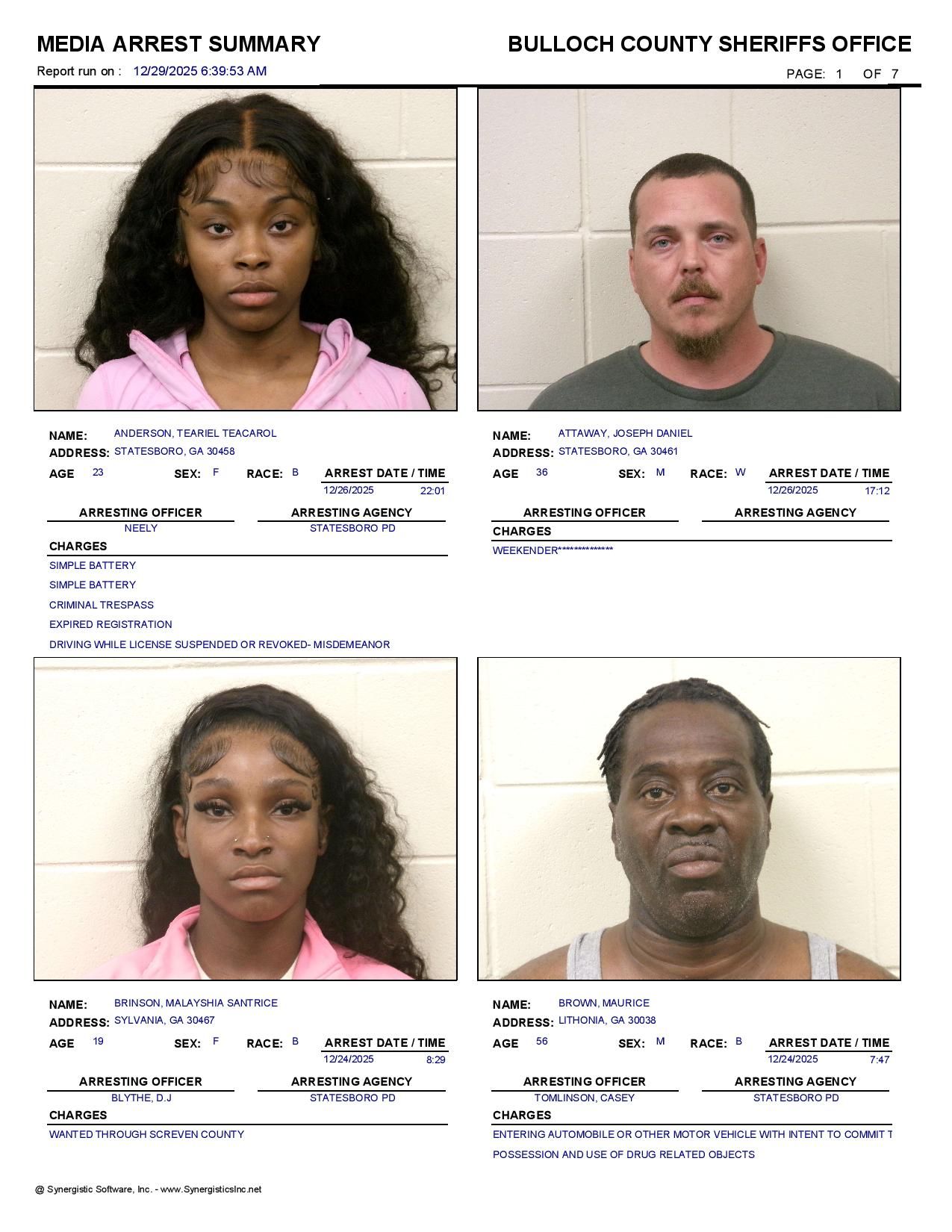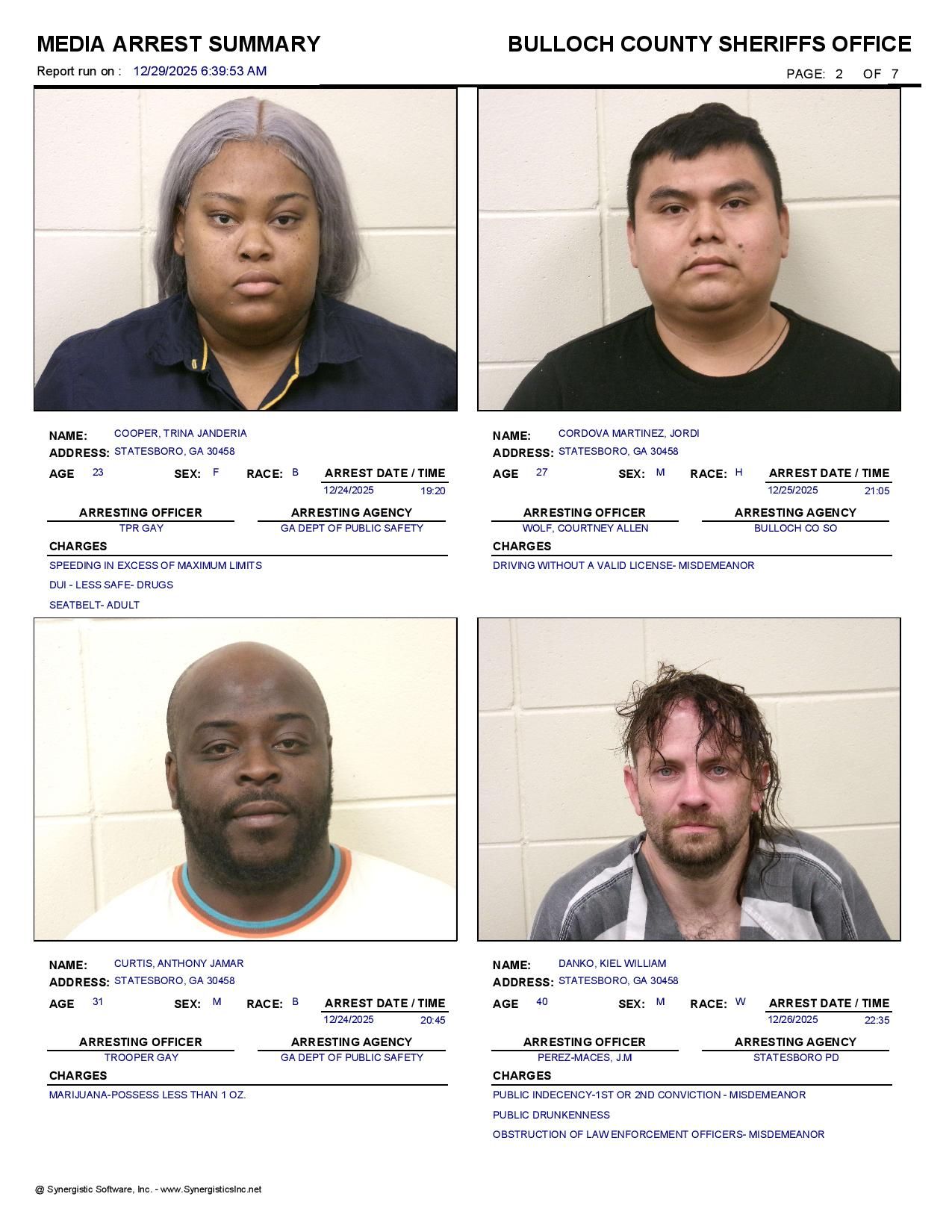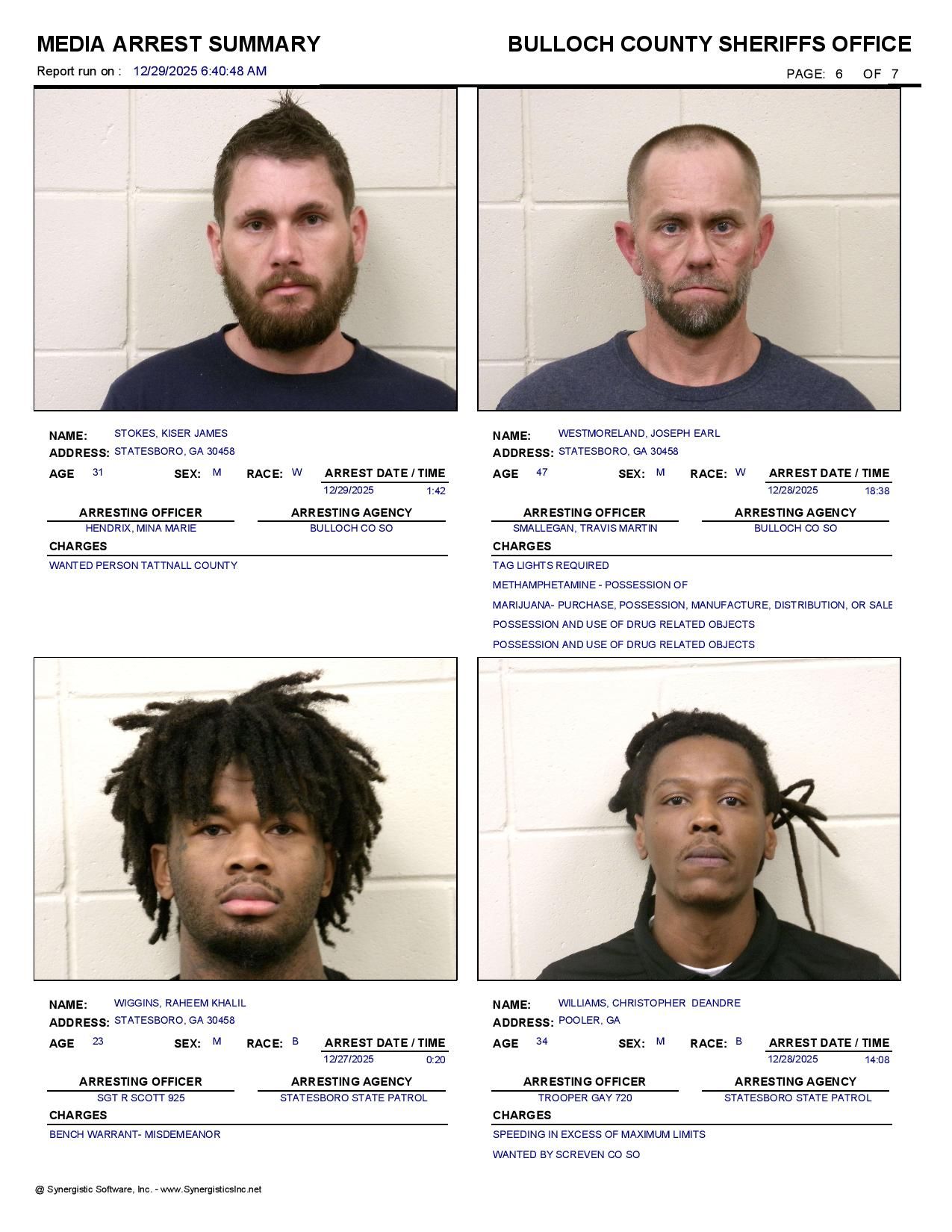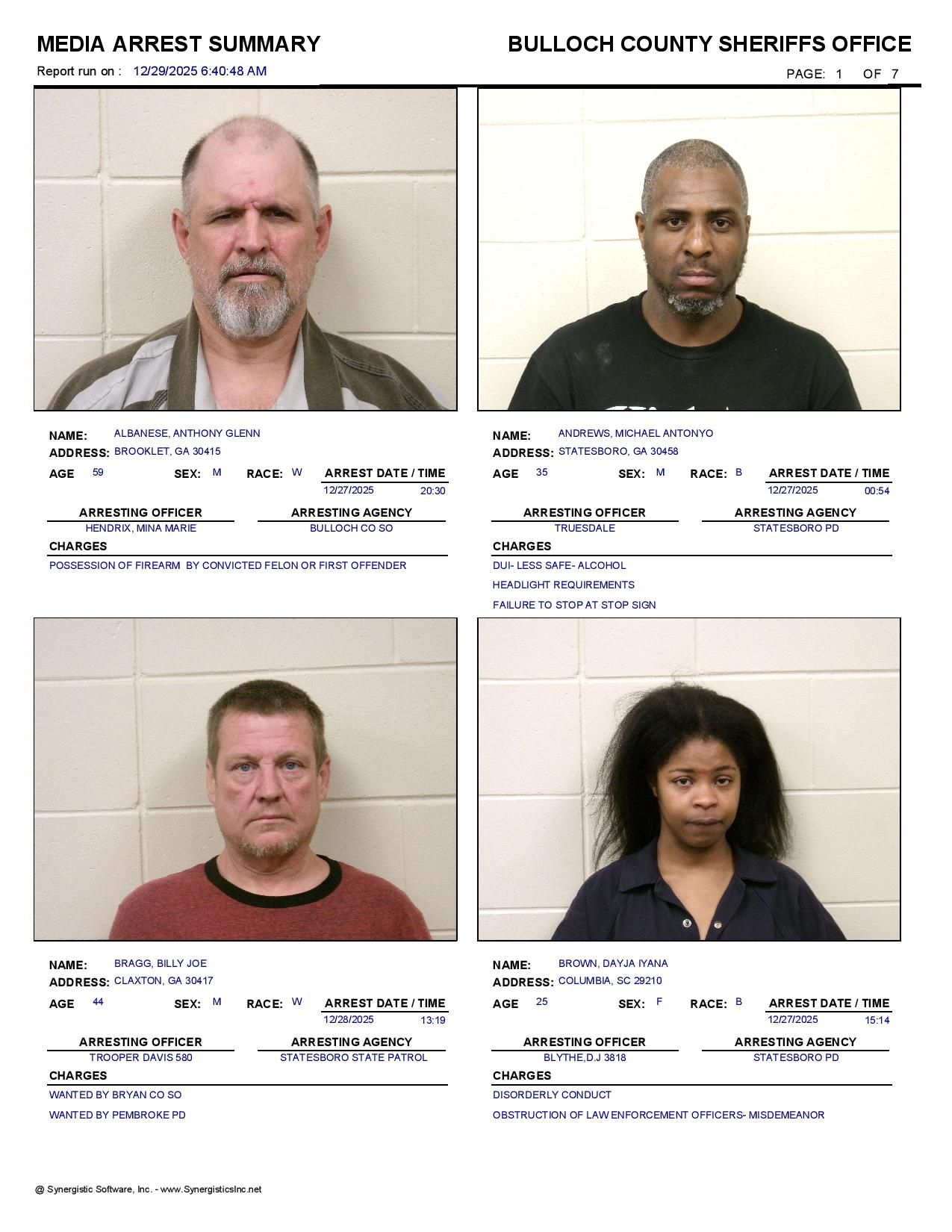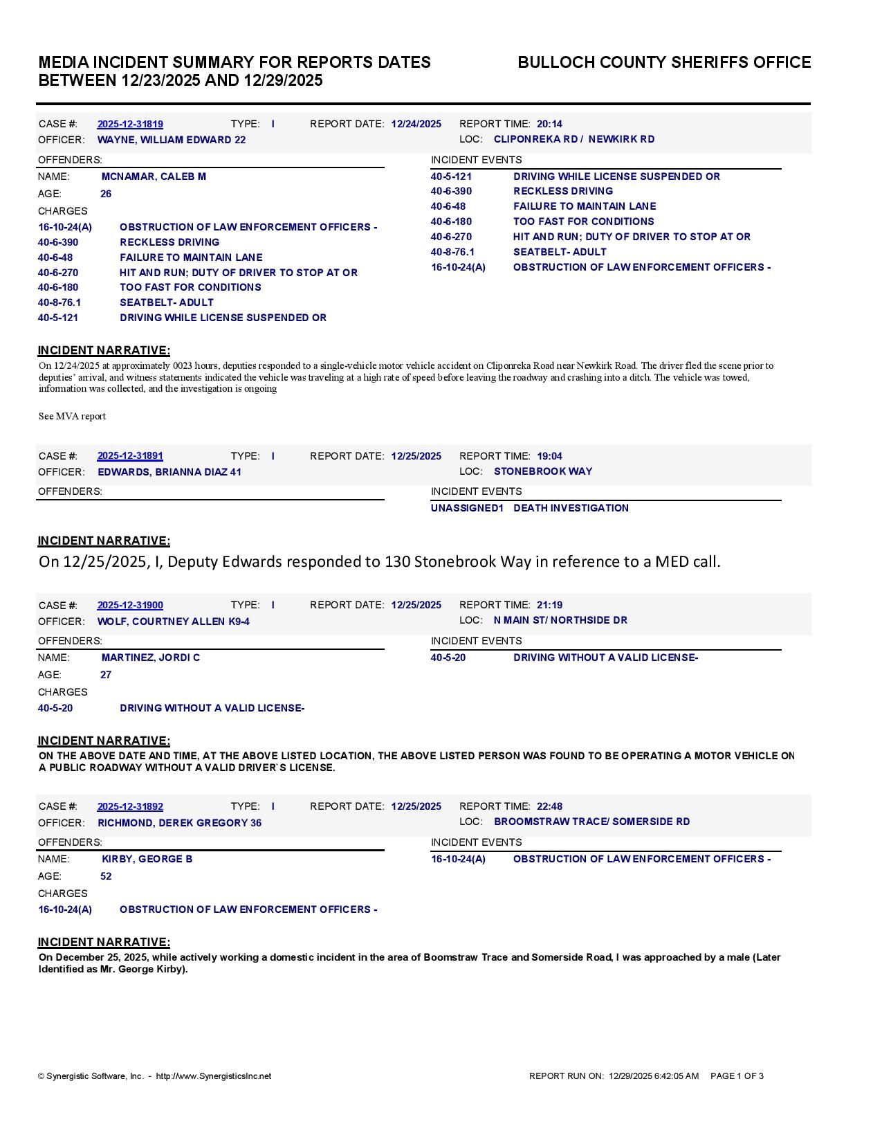 The Bulloch Co Jail Booking & Incident Report 12/29/25 details arrests from Bulloch Co., Statesboro, Brooklet, Portal, Register, and the Georgia State Patrol. Incident reports are from the Sheriff’s Office only.