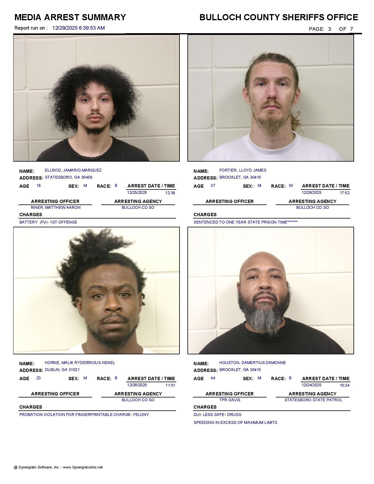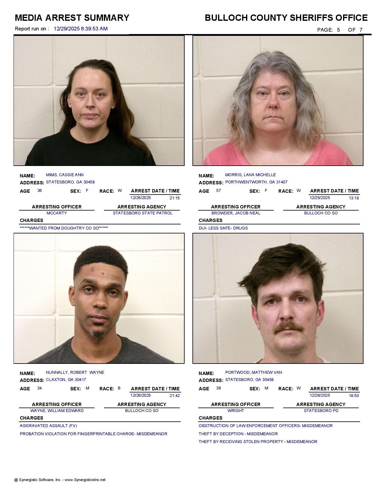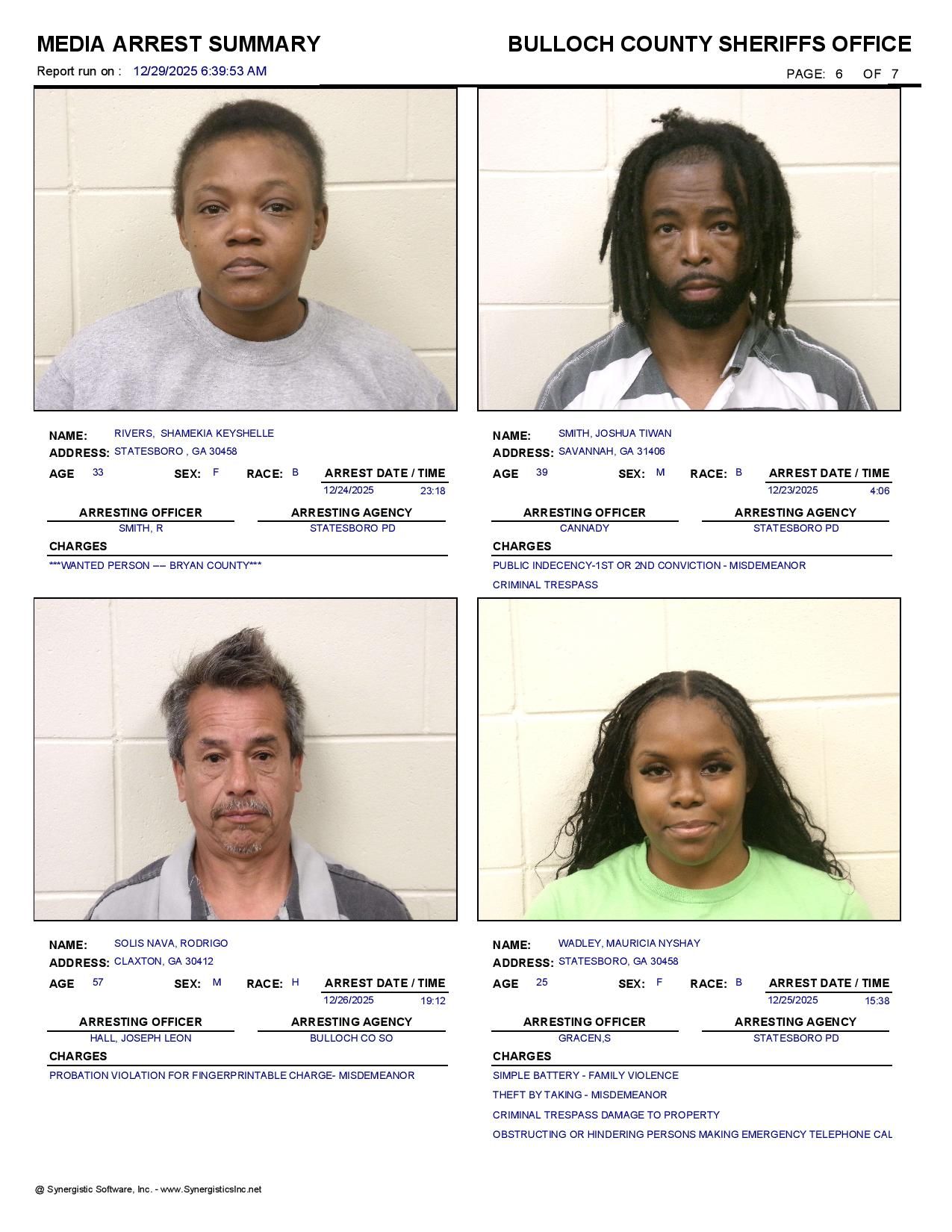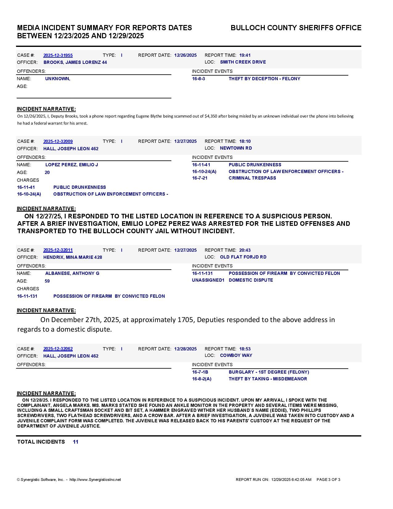 The Bulloch Co Jail Booking & Incident Report 12/29/25 details arrests from Bulloch Co., Statesboro, Brooklet, Portal, Register, and the Georgia State Patrol. Incident reports are from the Sheriff’s Office only.