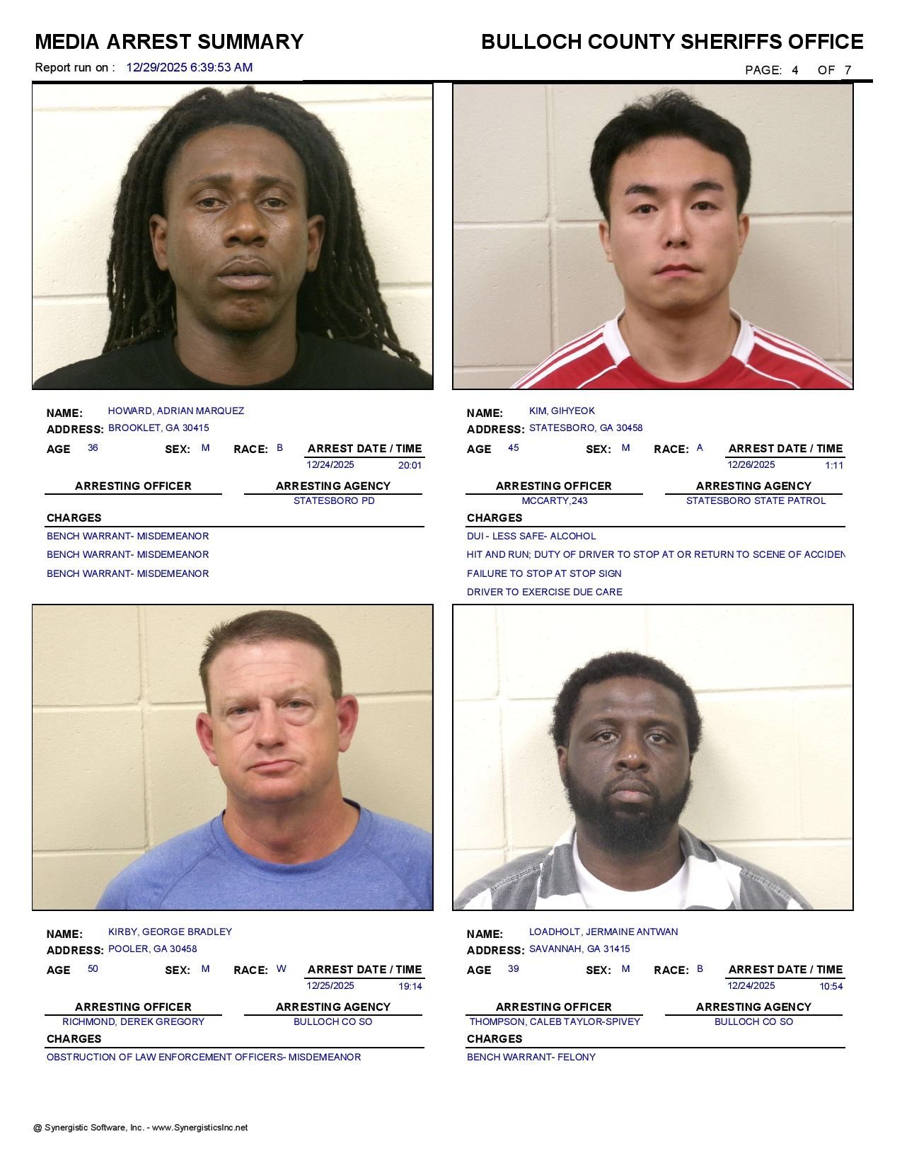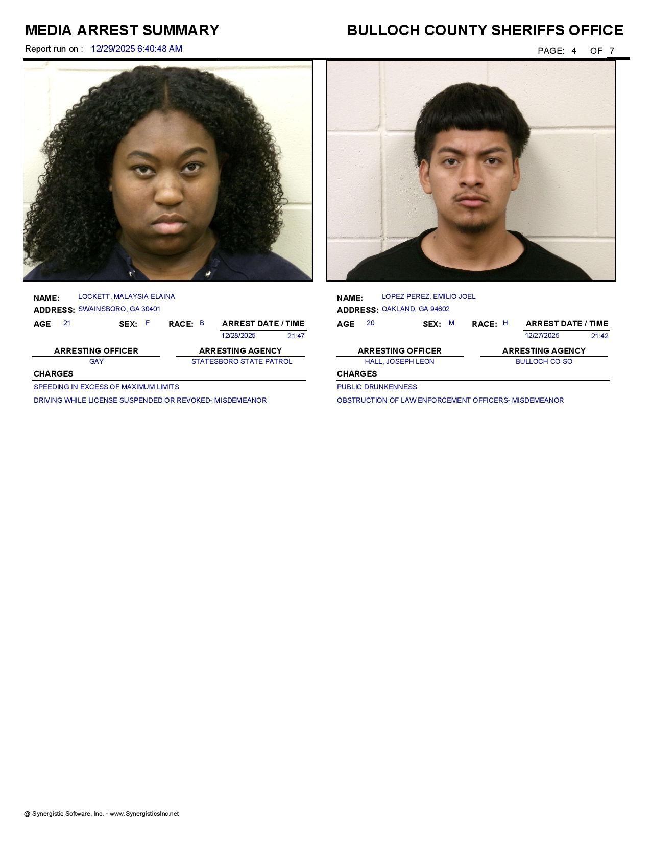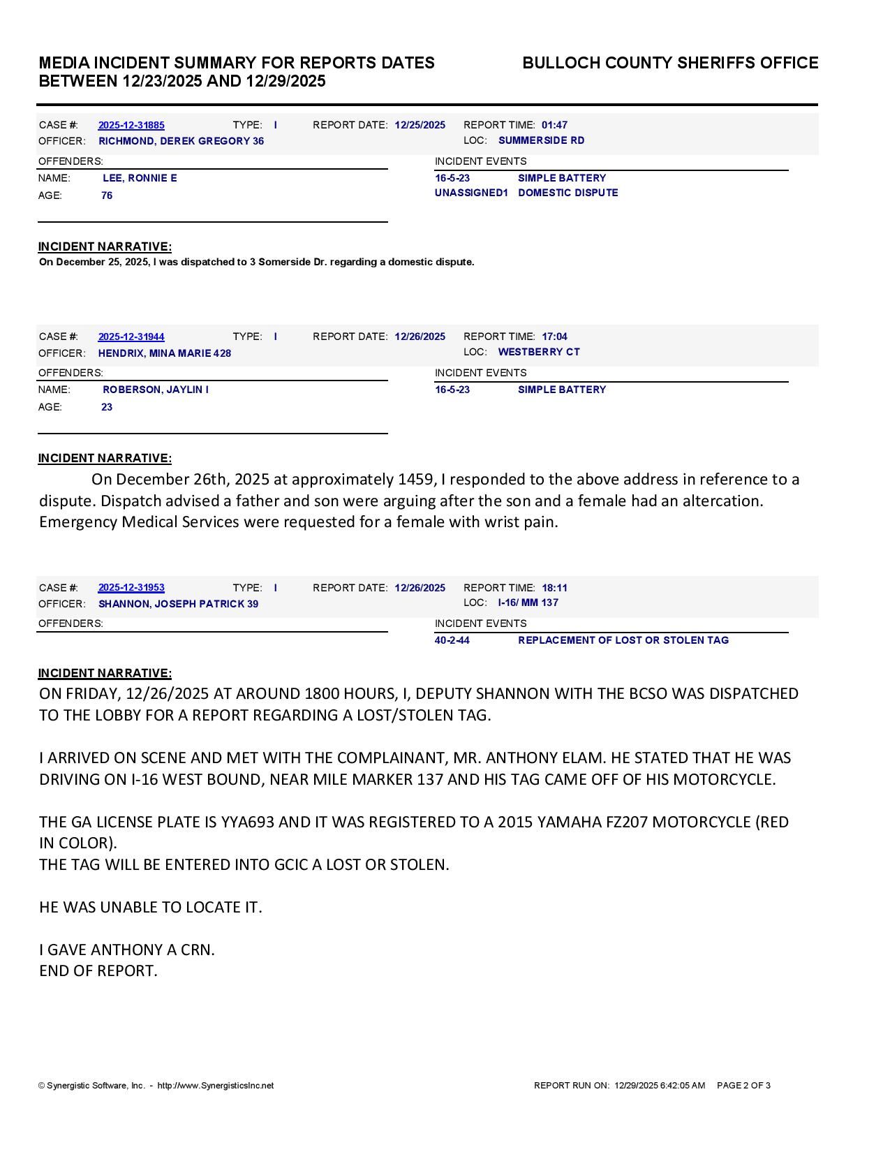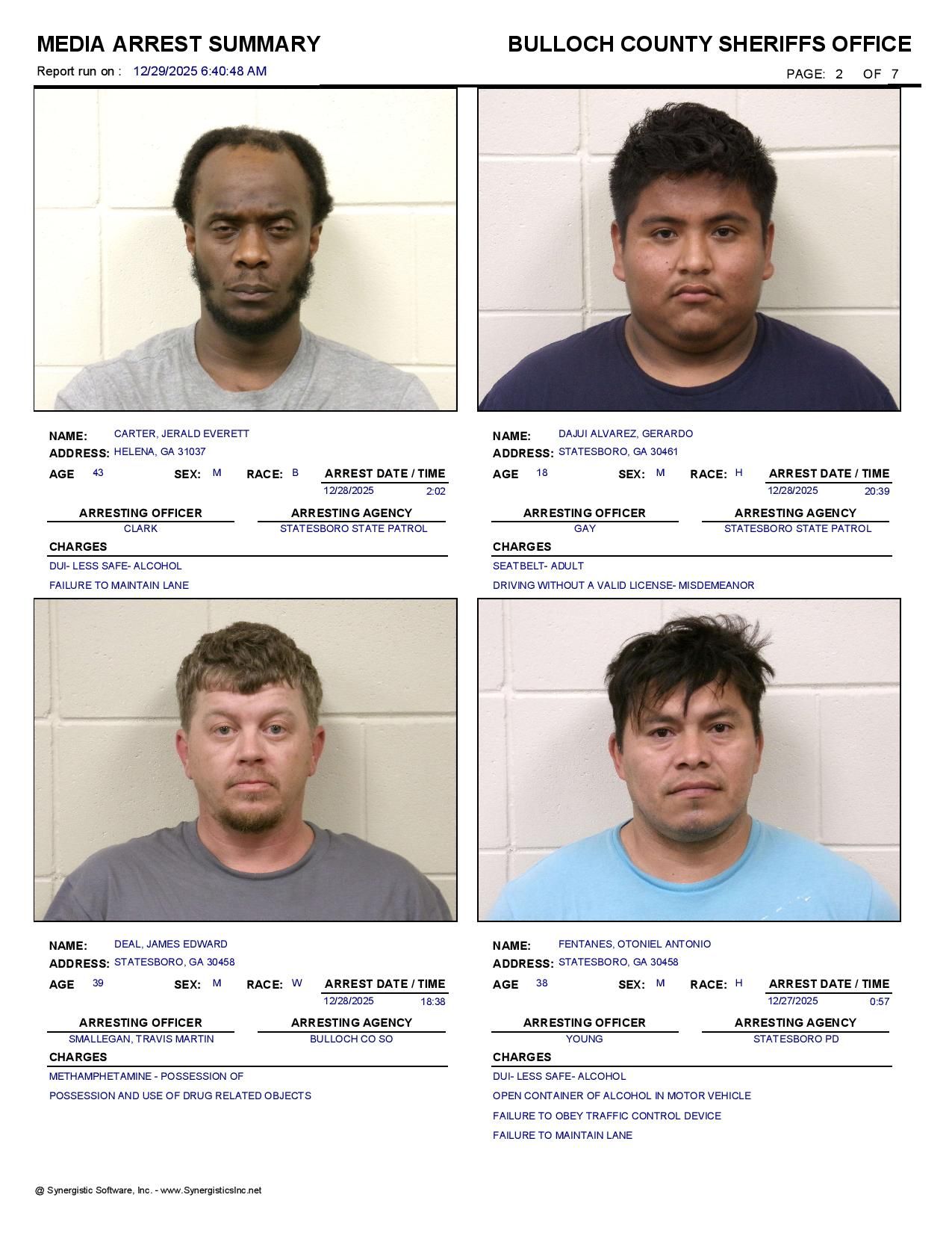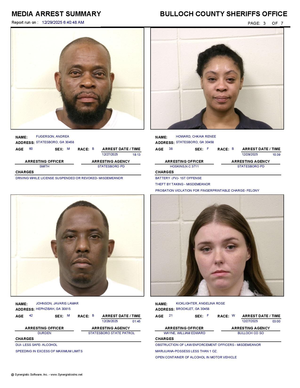 The Bulloch Co Jail Booking & Incident Report 12/29/25 details arrests from Bulloch Co., Statesboro, Brooklet, Portal, Register, and the Georgia State Patrol. Incident reports are from the Sheriff’s Office only.