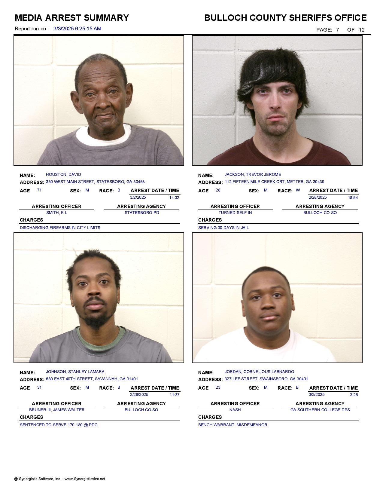 The Bulloch Co Jail Booking & Incident Report 03/03/25 details arrests from Bulloch Co., Statesboro, Brooklet, Portal, Register, and the Georgia State Patrol. Incident reports are from the Sheriff’s Office only.