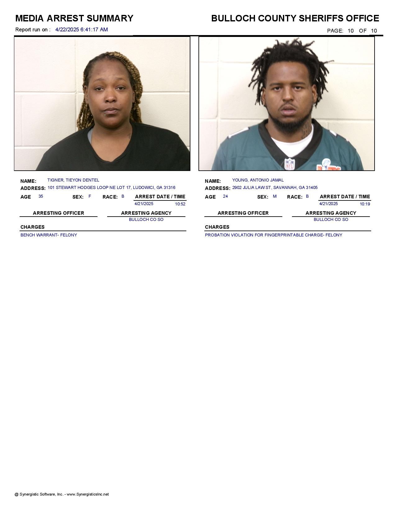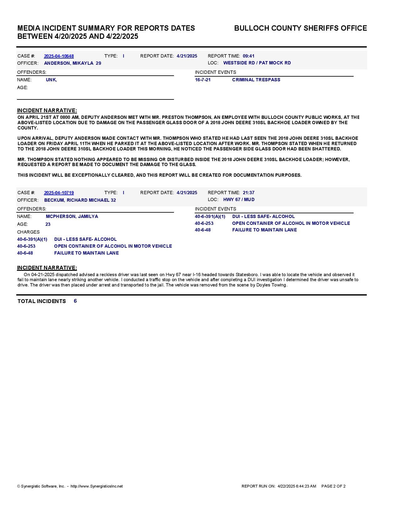 The Bulloch Co Jail Booking & Incident Report 04/22/25 details arrests from Bulloch Co., Statesboro, Brooklet, Portal, Register, and the Georgia State Patrol. Incident reports are from the Sheriff’s Office only.